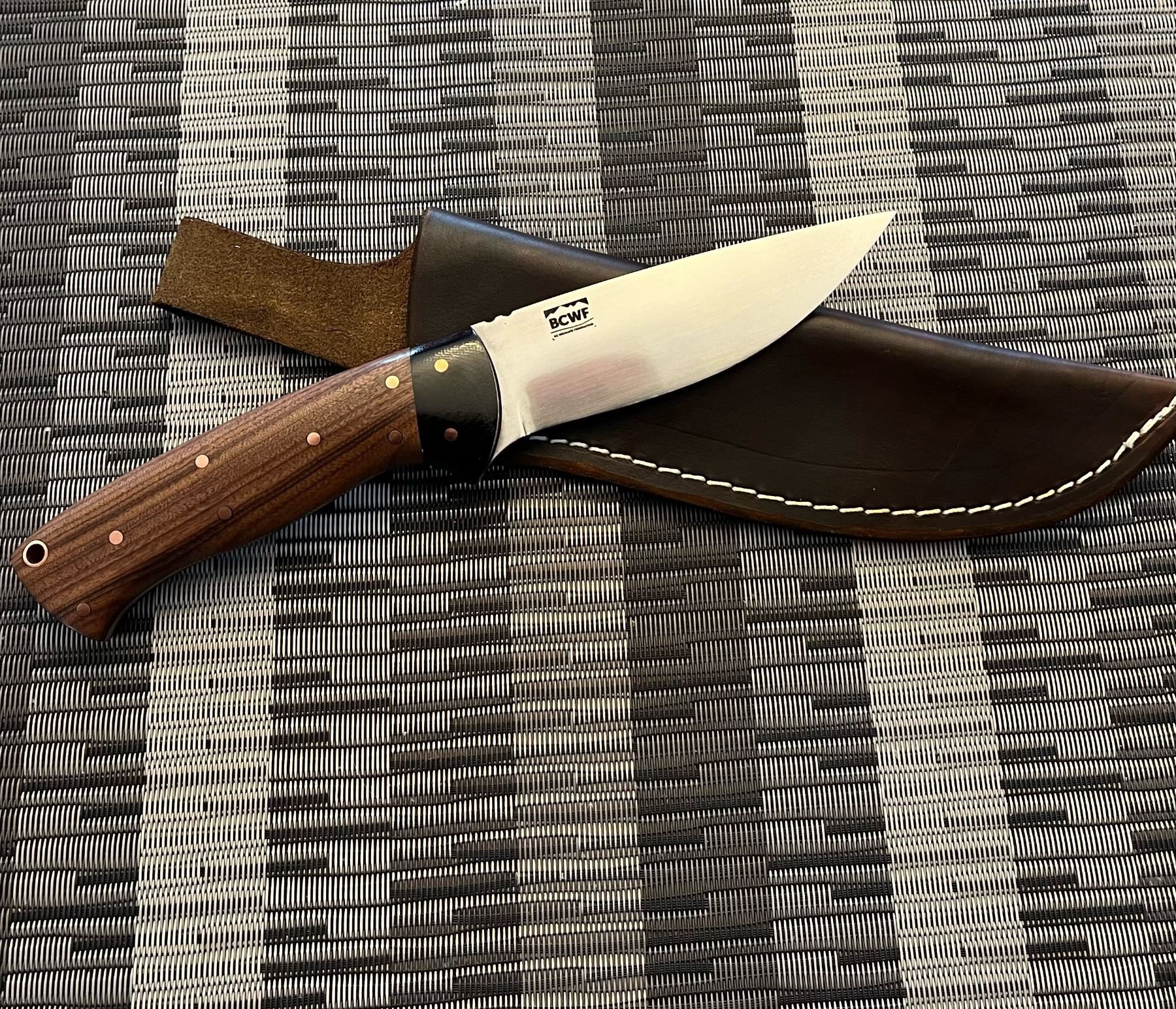 Custom hunting knife crafted by Fort St. John knife maker Robert Walker of Light Knives. This is the Muskwa River edition with rosewood handle and four direction copper pins. The knife is 9 3/8 inches long with a 5 1/8 AEB-L stainless steel blade that is engraved with the BC Wildlife Federation’s logo. The knife comes with a leather sheath, certificate of authenticity and is guaranteed for life against defects in materials and workmanship.