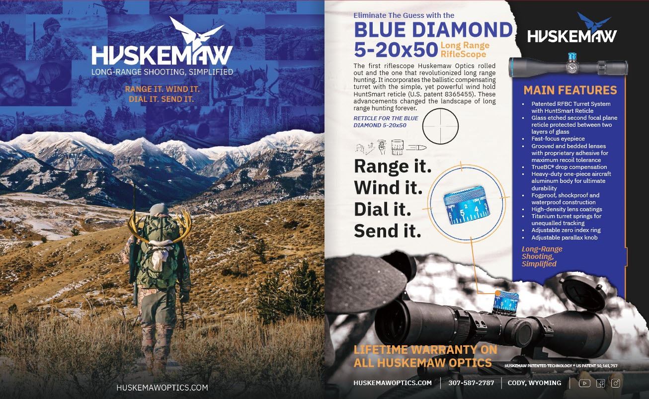 The first riflescope Huskemaw Optics rolled out and the one that revolutionized long range hunting. It incorporates the ballistic compensating turret with the simple, yet powerful wind hold HuntSmart reticle (U.S. patent 8365455). These advancements changed the landscape of long range hunting forever.