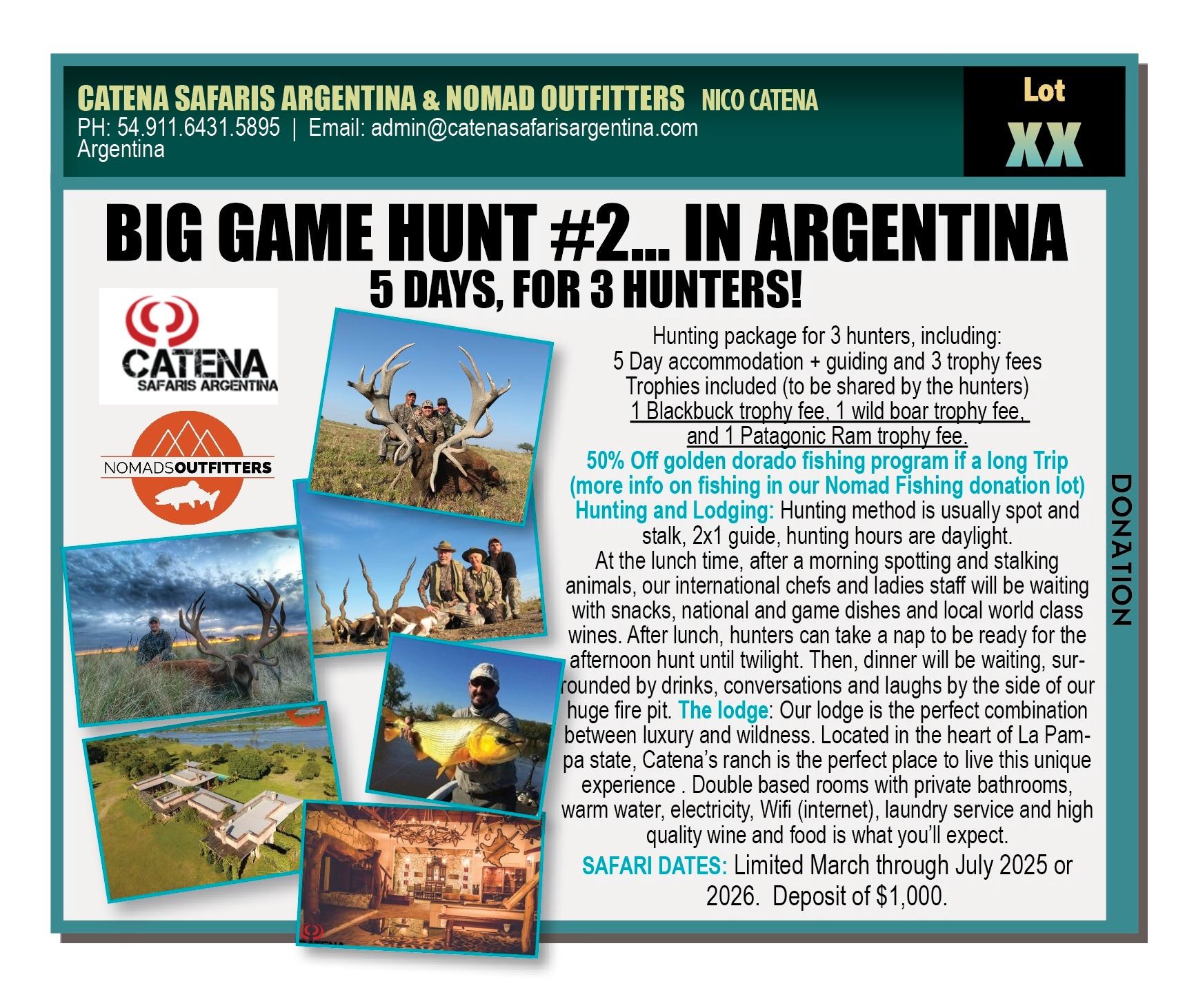 Catena Safaris Argentina donates a 5-day hunt in Patagonia. Description: Come and enjoy a 5 Day hunt for 3 hunters for 1 Blackbuck and 1 Wild Boar and 1 Patagonic Ram trophy fee to be shared amongst three hunters. You will be able to upgrade or purchase additional trophies at the current price list. The hunt will take place in March through July of 2025 or 2026. All accommodations are included at Luxury Lodge, located in Argentina We Thank Catena Safaris Argentina for this 100% donation. Value: $11,750