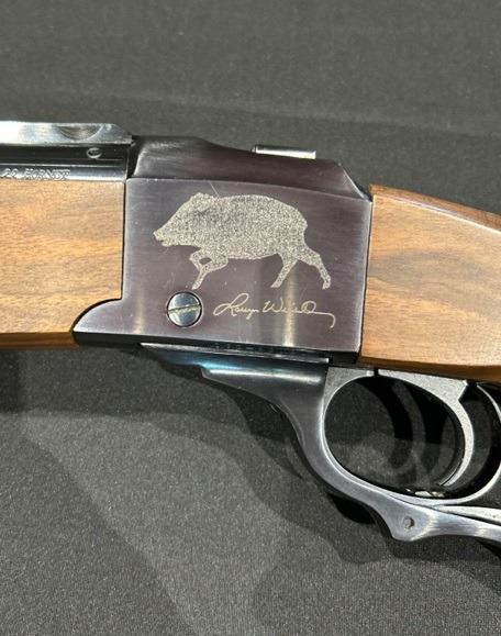 The receiver is engraved with the TWA logo on one side. The other side is engraved with a javelina study drawing by Larry Weishuhn, beneath which is Larry Weishuhn's signature... This is a one of a kind rifle donated by Larry himself!