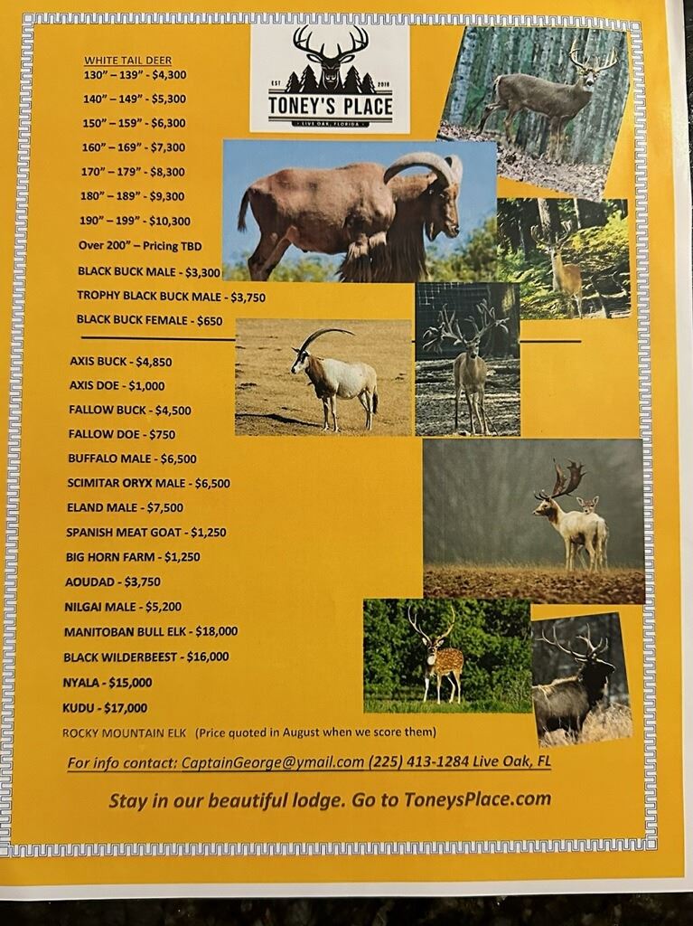 Last minute add on from a new outfitter for a US big game hunt. Enjoy a day of hunting at Toney's Place in Live Oak Fl. with Toney and George. Included is 1X1 guided hunt for a 1-day hunt for 1 hunter for (1) black buck antelope trophy. Non-Hunter's / observers pay negotiated daily rate with outfitter. Accommodations for 1 hunter may be available at onsite lodge with prior approval. Hunt must be taken from Oct.2024 to Feb.2025 season. Also available hunts in Michigan with this outfitter. Information is available online at Item #2A. Not included: Transportaion pre or post hunt from or to location. Value is $3,300.