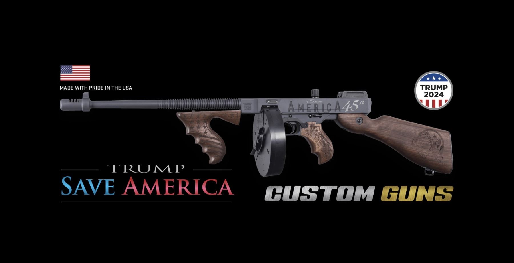 The Trump Save America Thompson starts as a Model 1927 Tommy Gun, chambered in .45 ACP. It is entirely manufactured in the USA from quality steel and American walnut. On the right side is engraved “President Trump”, and the Presidential Seal. On the left, “Save America 45th”.