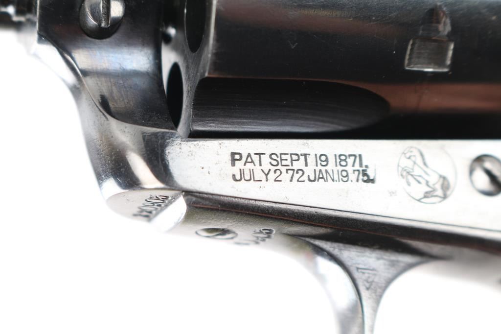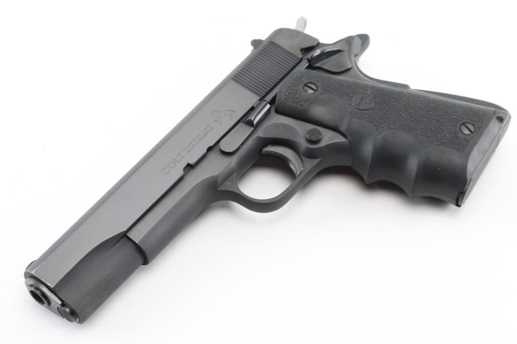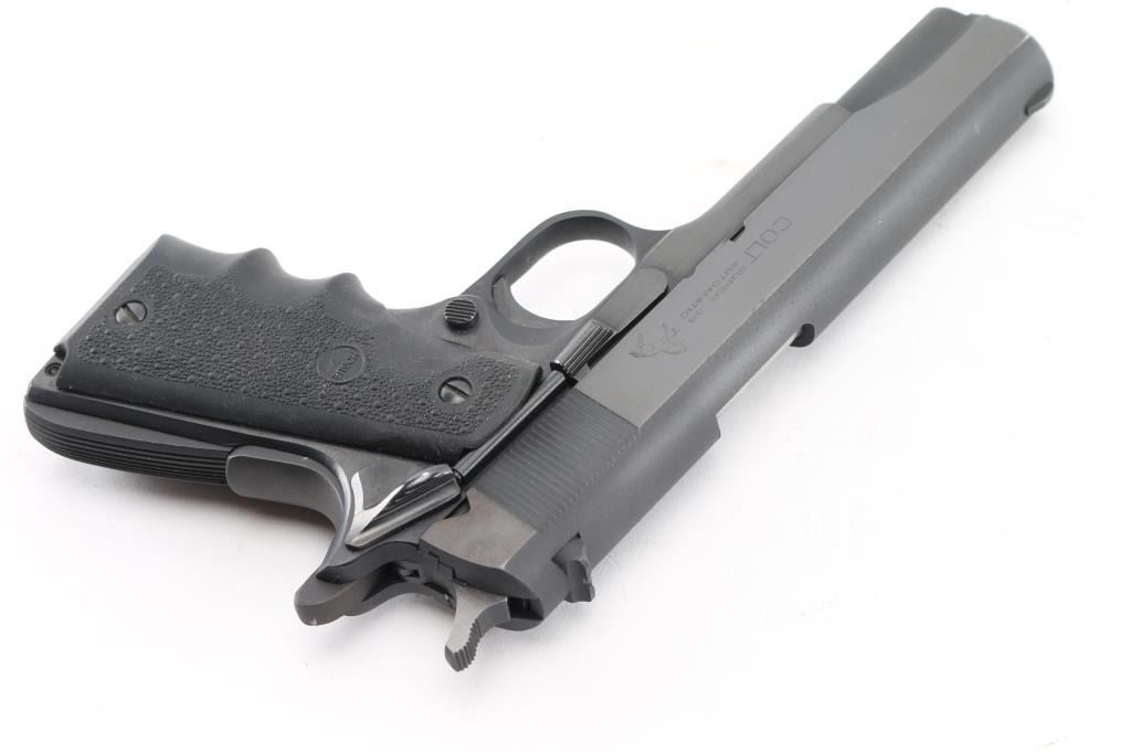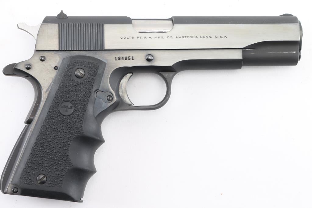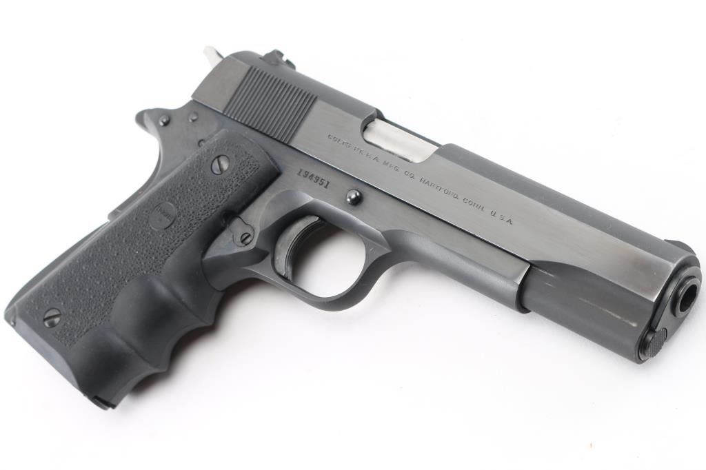 1911A1 pattern single action semi-automatic pistol manufactured circa 1968. Features a matte black finish with high polish blue sides, 5" barrel, serrated ramp front sight, notch rear sight in dovetail, grooved trigger, checkered spur hammer with polished sides, thumb safety on the left side of the frame, grip safety, push button magazine release, steel frame, serrated arched mainspring housing, pebbled wrap around, finger grooved Hogue grips. Bore is pristine. Retains 99% finish with some very minor scratches. Grips are excellent. Includes (1) Colt magazine, soft case. Condition is NRA Excellent. C&R firearm.
