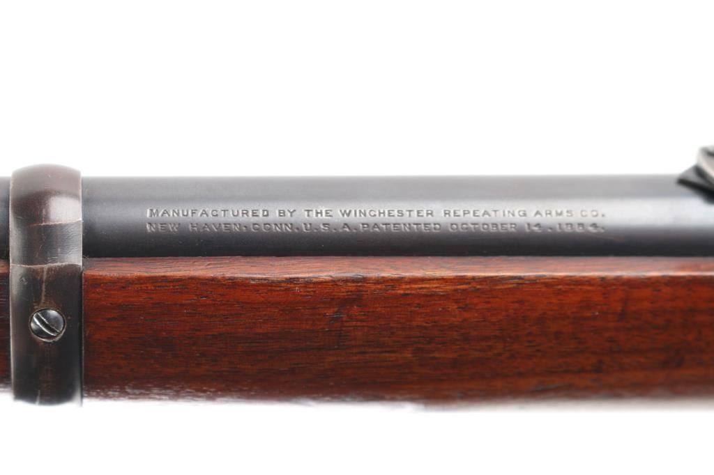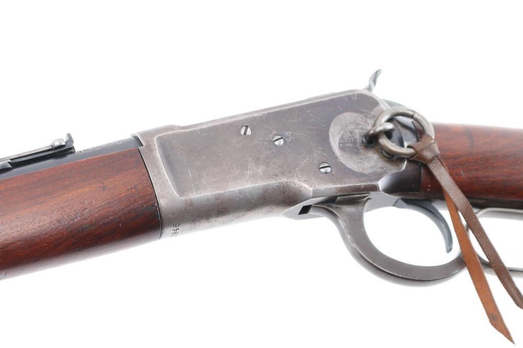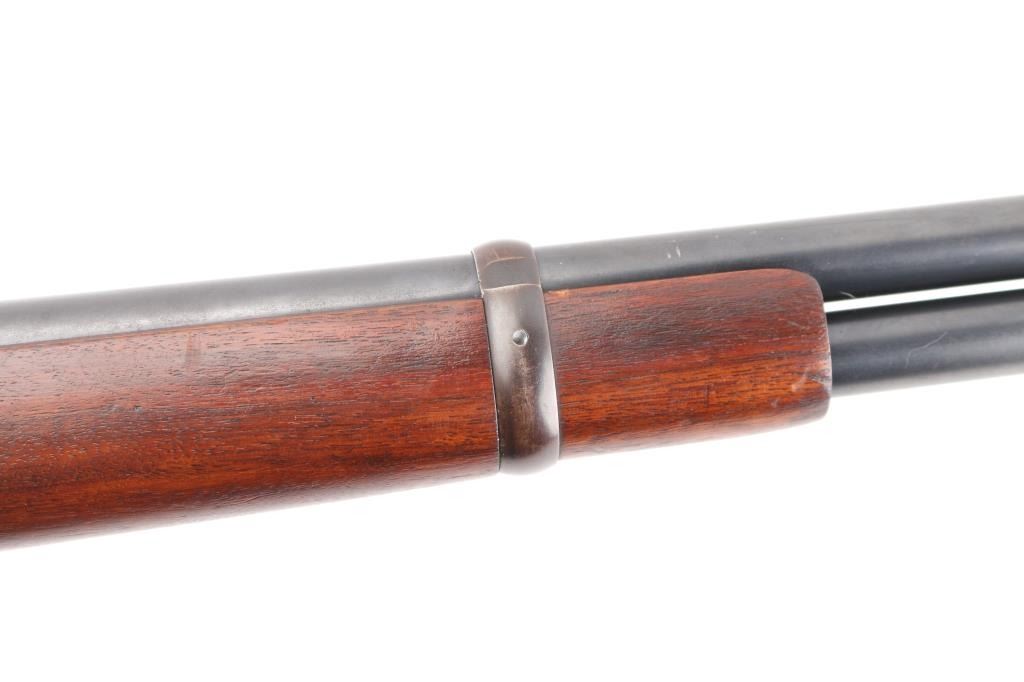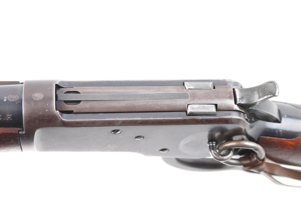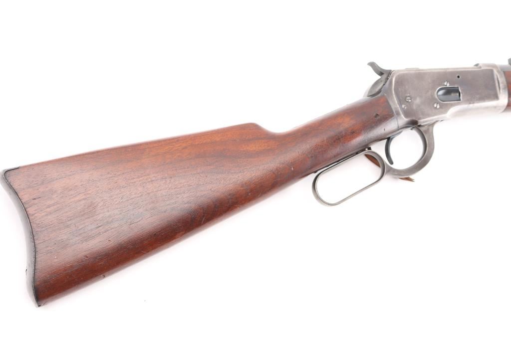 'Saddle Ring Carbine' Vintage lever action rifle manufactured circa 1911. Chambered for 38-40. Features 20" barrel, full length magazine tube, pinned blade front sight, folding ladder rear sight, smooth walnut forend & straight wristed buttstock, carbine butt with curved steel buttplate. Bore is good to very good condition. Metal surfaces retain 40% original dark finish, most retained on barrel & mag tube, receiver finish is beginning to fade towards brown, shows thinning and some bare metal where carried and on lever. Saddle ring has rubbed a ring of bare metal on receiver. Wood is good to very good condition, with dents and scrapes, varnish added. All markings are sharp and readable. Action is smooth. Condition is NRA Very Good *** C&R Firearm ***