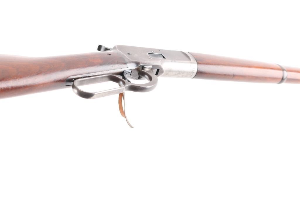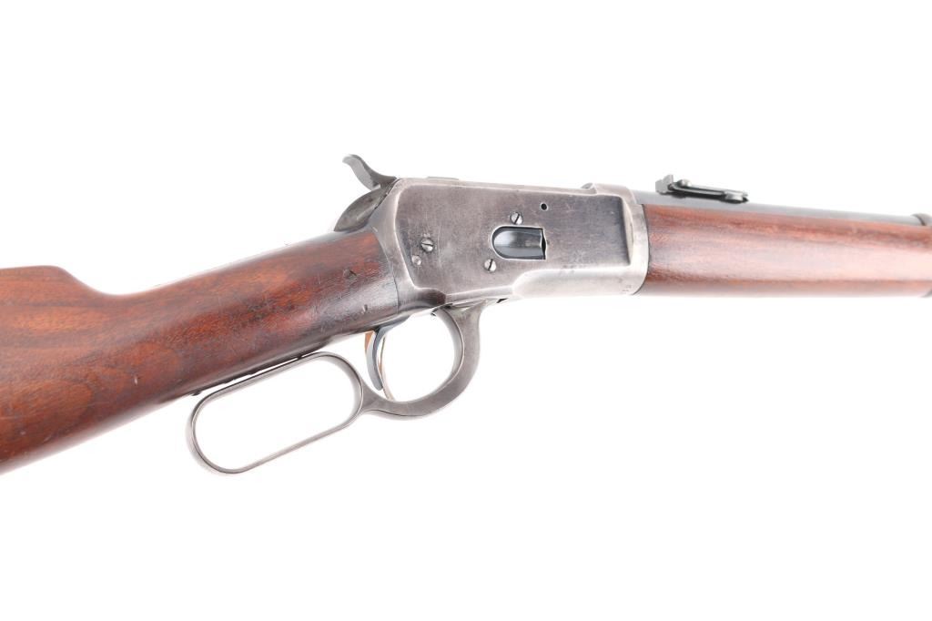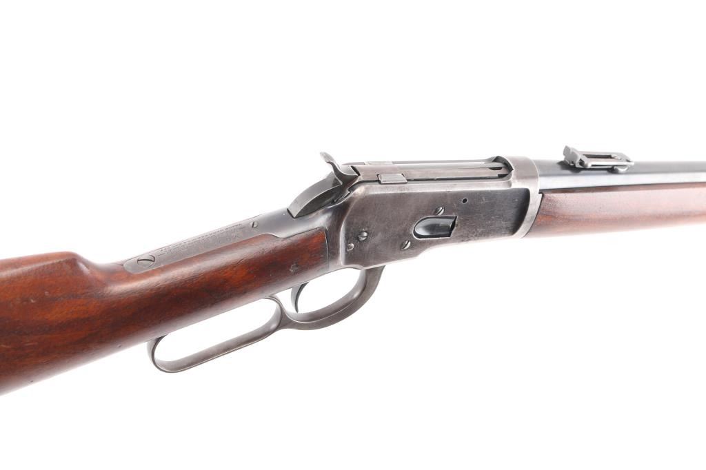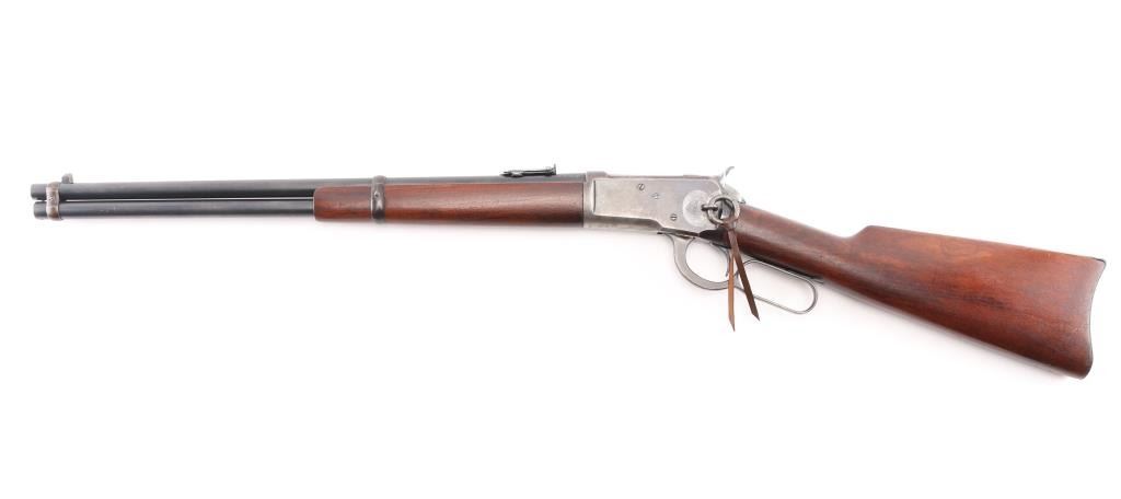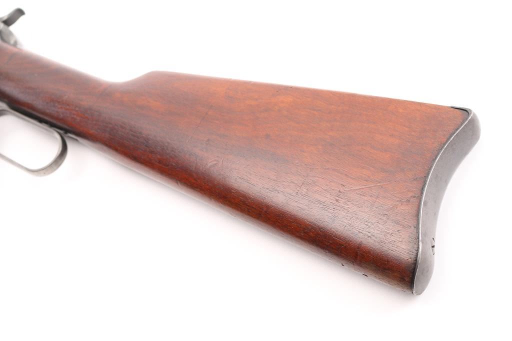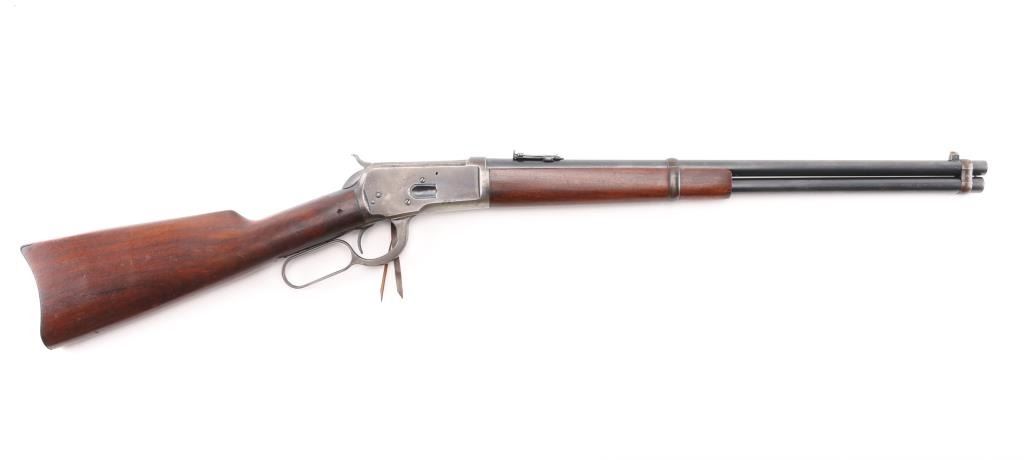 'Saddle Ring Carbine' Vintage lever action rifle manufactured circa 1911. Chambered for 38-40. Features 20" barrel, full length magazine tube, pinned blade front sight, folding ladder rear sight, smooth walnut forend & straight wristed buttstock, carbine butt with curved steel buttplate. Bore is good to very good condition. Metal surfaces retain 40% original dark finish, most retained on barrel & mag tube, receiver finish is beginning to fade towards brown, shows thinning and some bare metal where carried and on lever. Saddle ring has rubbed a ring of bare metal on receiver. Wood is good to very good condition, with dents and scrapes, varnish added. All markings are sharp and readable. Action is smooth. Condition is NRA Very Good *** C&R Firearm ***