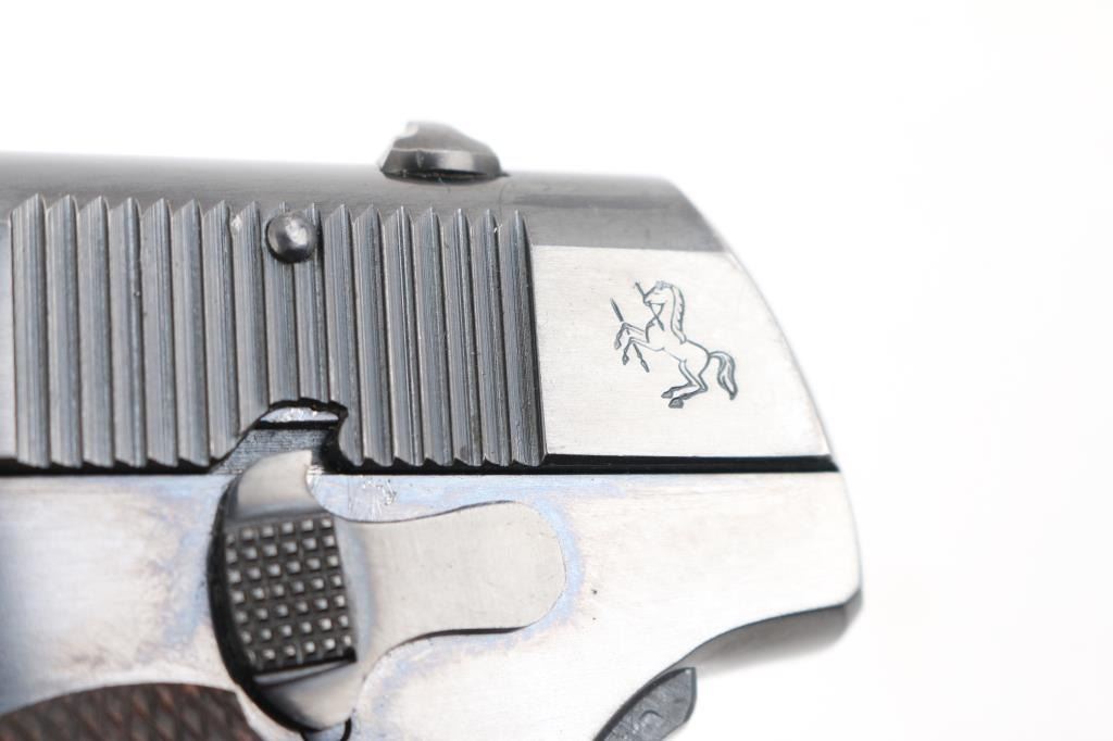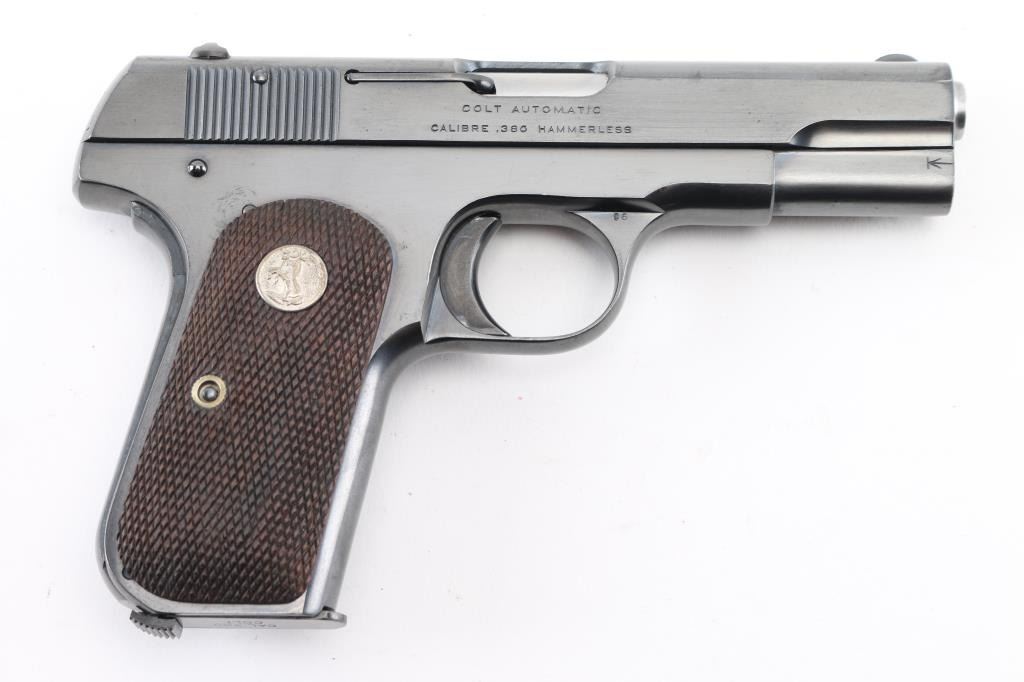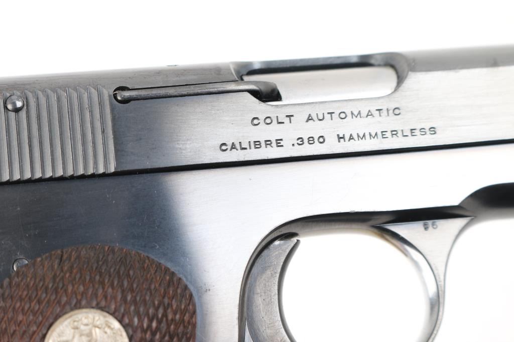 Vintage Colt 1908 Pocket Hammerless single action semi-automatic compact pistol chambered in .380 Auto, manufactured circa 1921. Features a blued finish, 3 3/4" barrel, low-profile round blade front sight, dovetailed rear sight with 'u' notch, two-line address/patent marking on the left side of the slide, smooth trigger, concealed hammer, thumb safety/slide catch on the left side of the frame, grip safety, heel magazine release, factory 8 round two-tone magazine, steel frame and two-piece checkered wood grips with silver Rampant Colt medallions. Pistol shows a sign that it was re-blued by the shallow serial number, the rest of the markings are crisp/clear. Bore is pristine. Pistol retains approximately 98% of its re-blued finish with some minor edge losses. Grips are very good condition with no observed racks or chips. Condition is near NRA Excellent as refinished. C&R Firearm.