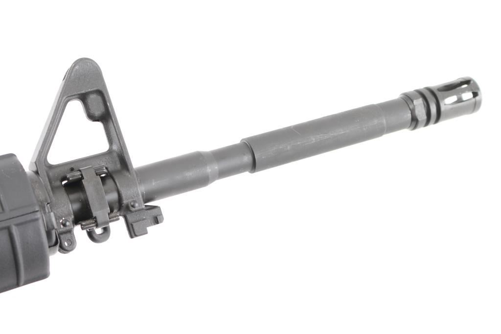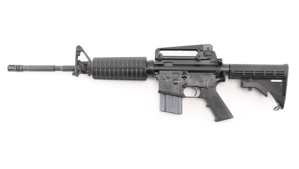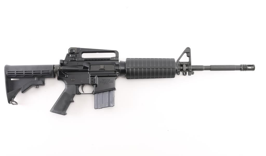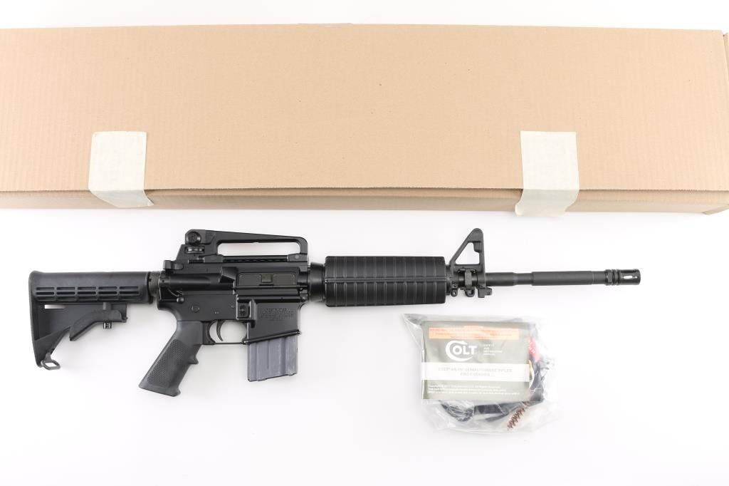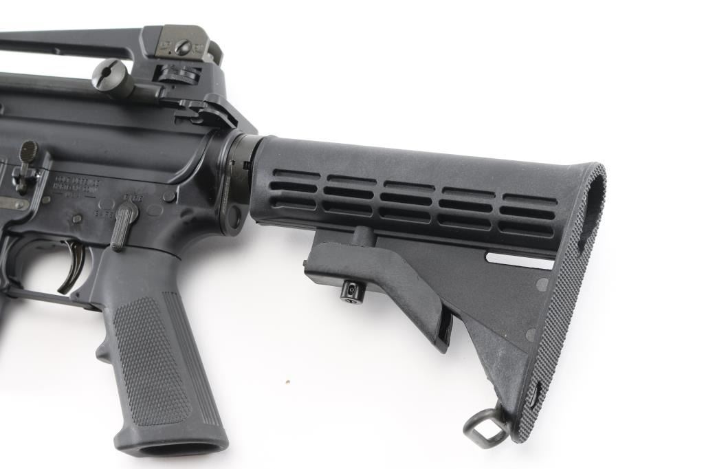 Gas operated semi-automatic AR platform modern sporting rifle chambered in 5.56x45mm NATO. Features a matte black finish, factory 16.25" chrome lined 1/7 twist M4 profile barrel, A2 flash hider, carbine length gas system, A2 front sight/gas block with bayonet lug, forged flat-top upper receiver, forward assist, shell defector & dust cover, carry handle with A2 style adjustable rear peep sight, push button magazine release, manual safety, A2 style pistol grip, collapsible shoulder stock, sling swivels. Rifle exhibits approximately 99+% of it's original finish. Action is smooth, the bore is excellent, and the synthetic stocks are fine. 20 rd Colt magazine . Comes in original factory box with manual, cleaning kit, and 20 rd Colt magazine. (2) total. Condition is NRA Excellent - like new. Modern Firearm.