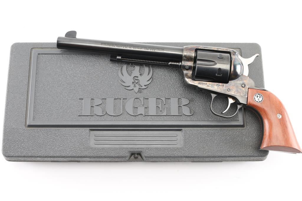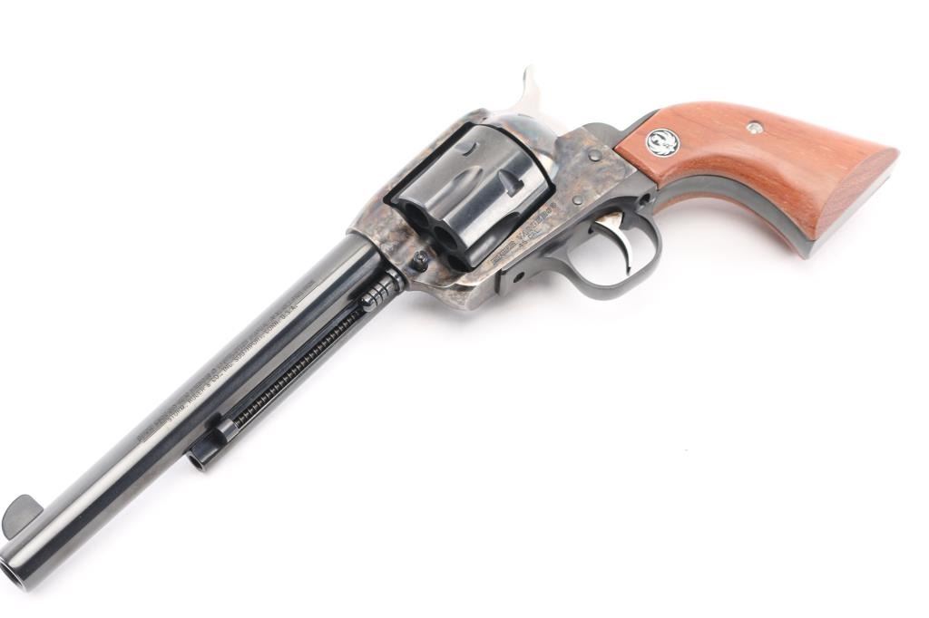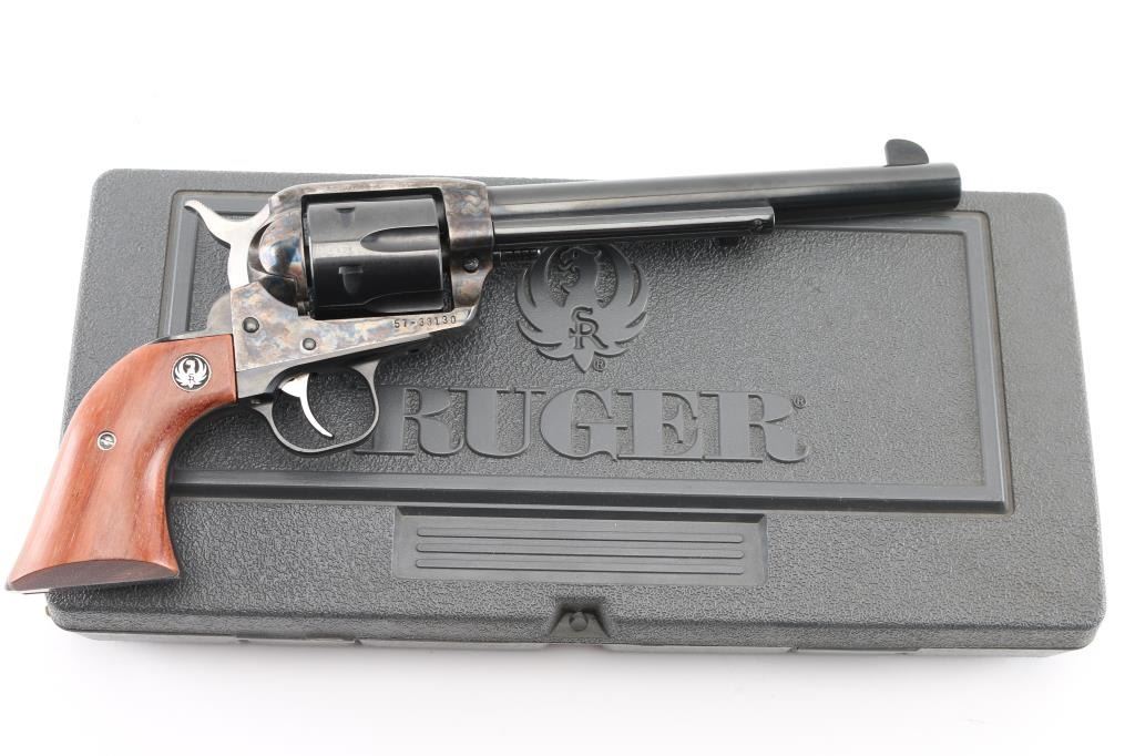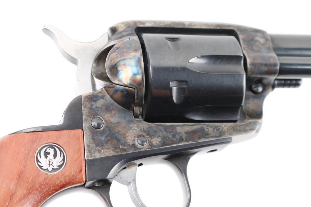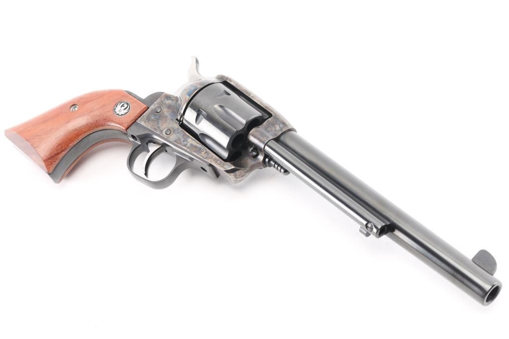 Single action western styled revolver features blued & case hardened finish, 7.5" barrel, blade front sight, square notched rear sight, smooth trigger, serrated hammer spur, transfer bar safety, fluted six-shot cylinder, ejector rod with flat-faced button, and two-piece smooth wood grips with silver/black Ruger medallions. Condition is like new with few signs of handling. Includes the original factory gray plastic hard case with documents. Condition is near NRA Excellent - like new *** Modern Firearm ***
