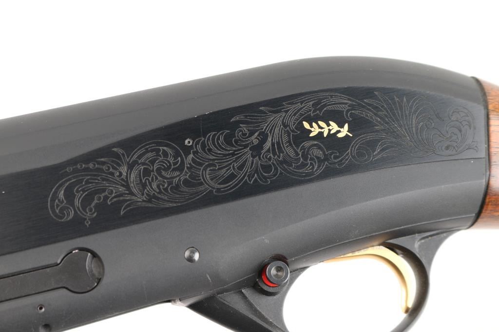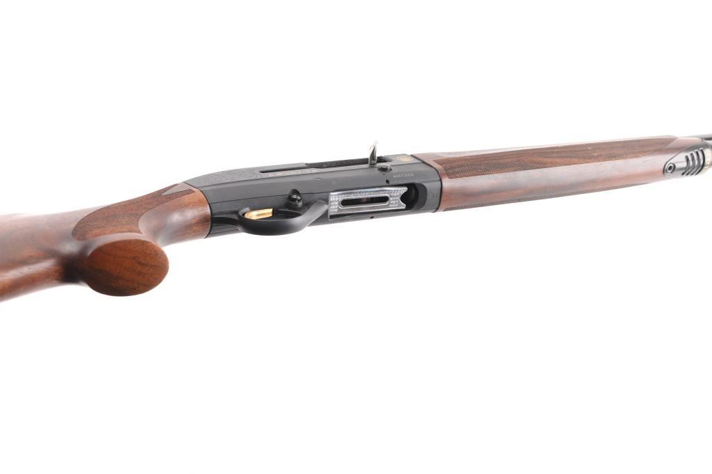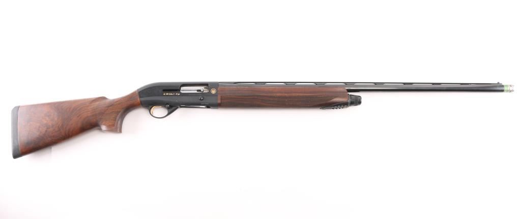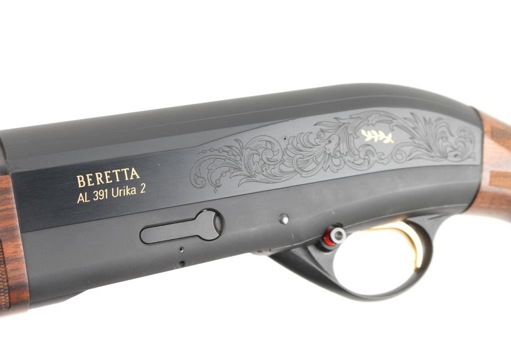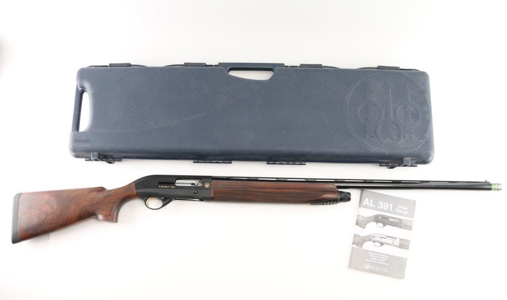 SN: AA413066. Semi-Automatic, Gas Operated, Tube Magazine Fed Shotgun. The left side of the barrel is marked “BERETTA – GARDONE V.T. – MADE IN ITALY / 20 GA OB 3”-76-30””. The left of the receiver is marked “BERETTA AL391 Urika 2”. The right side of the receiver is marked “AL 391 Urika 2 – 12 ga.”, “Made In Italy-Patented”, the serial number , and the Beretta Logo. There is decorative scroll engraving on either side of the receiver with gold tone highlights. Barrel is 24” With Vent-Rib white bead, and steel mid bead. The barrel is threaded for removable chokes. The installed choke is an extended Modified. The stocks are a two piece checkered walnut set with a pistol grip, a fluted straight comb, and textured black rubber Beretta buttpad. The checkering is sharp. The LOP is 14 1/2". Bore is pristine, stocks are excellent, blue barrel, and black anodized receiver are excellent, Like new condition. Comes in the blue factory hard case with sling swivels, spare factory butt plate, take-down tool, extended IC choke, and flush chokes IM, and Full, and manual. NRA Condition-Excellent, Like New. Modern Firearm.