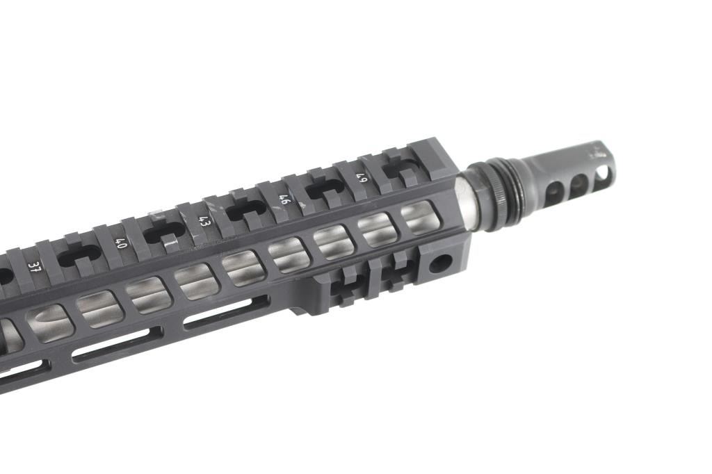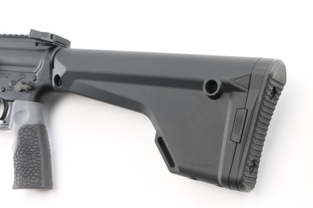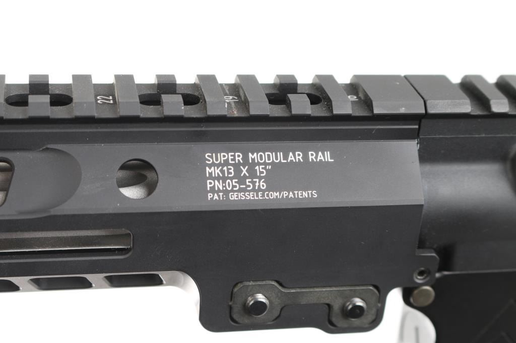 Deluxe Big Bore AR15 style rifle with premium components. Features 16.5" fluted stainless Wilson Combat barrel, Wilson Combat Bolt Carrier Group, muzzle brake with external threads for suppressor mounting (possibly by SilencerCo), Giessele Super Modular MK13 15" rail, SN-ATCH ambi tac-latch charging handle, ejection port cover marked "458 SOCOM", Daniel Defense pistol grip, single stage drop-in trigger & hammer with anti-walk pins, Magpul MOE Rifle stock (fixed, hinged floorplate allows access to compartment in butt). Provided magazines are caliber marked, Lancer L5-AWM polymer, possibly CMMG modified, one 7 and two 5 rd. No optics or sights provided. Overall condition is excellent with few observed minor handling marks. Condition is NRA Excellent *** Modern Firearm ***