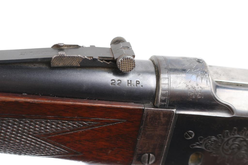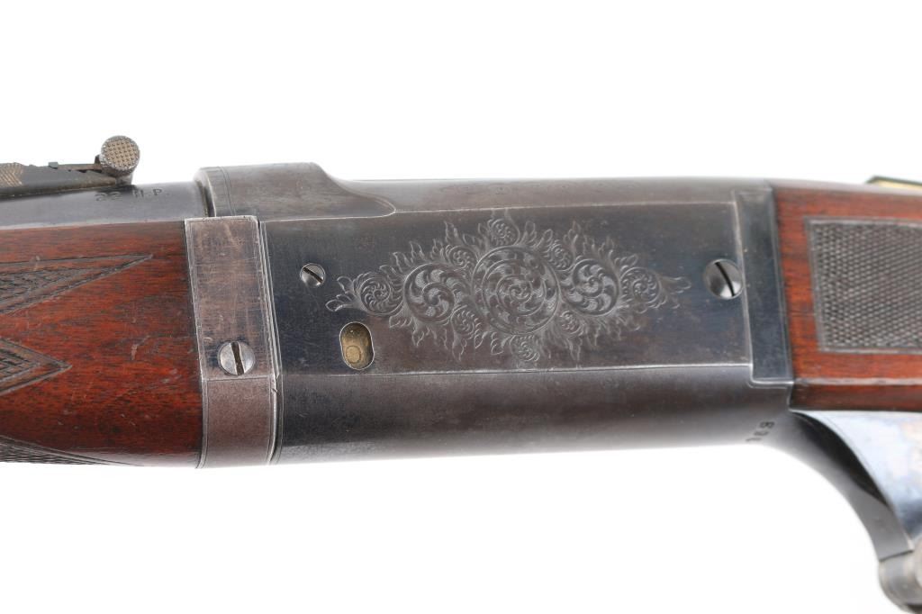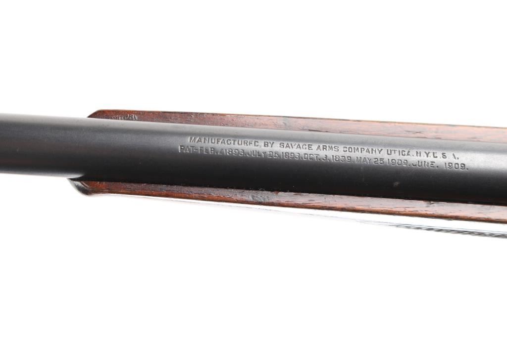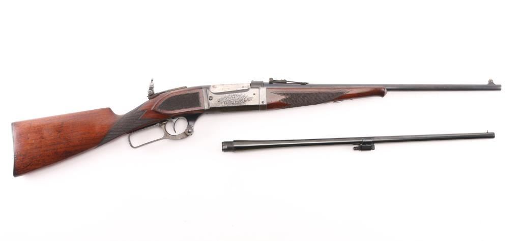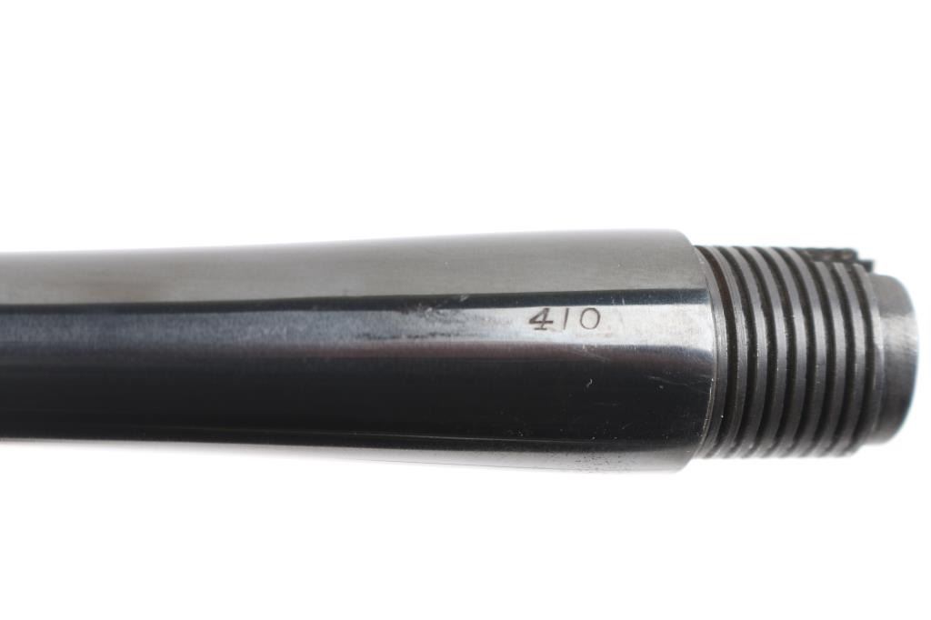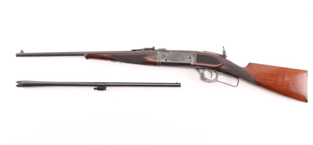 SN: 156368. Two Barrel set. Manufactured in 1914 with standard markings including the grade "A" type floral engraving on the receiver and barrel at the breech. 20" barrel fitted with pinned beaded brass blade front, adjustable sporting rear, and Lyman receiver mounted peep sights. Mounted with a nicely figured checkered schnabel tip forearm and straight grip stock with hard rubber factory buttplate. Chambered in Savage .22 High Power center fire cartridge(5.6x52mmR) Blue finish, case colored lever. Brass cartridge counter with window on left side of receiver. Cocking indicator on top of receiver. Bore is very good with strong rifling, action is smooth with good lock-up, wood is very good with minor scratches/dings, original blue is about 90% with minor muzzle/edge wear, some handling loss on receiver, traces of case color on the lever.. There is a small area of light pitting on the left chamber, and the under side of the barrel, barely noticeable. Comes with a .410 Ga. 21" barrel with brass sighting bead, very good condition, bore needs cleaning. (Offered from 1920-40). A fantastic conditioned set for it's age. Rare. NRA Condition-Good. C&R Firearm.