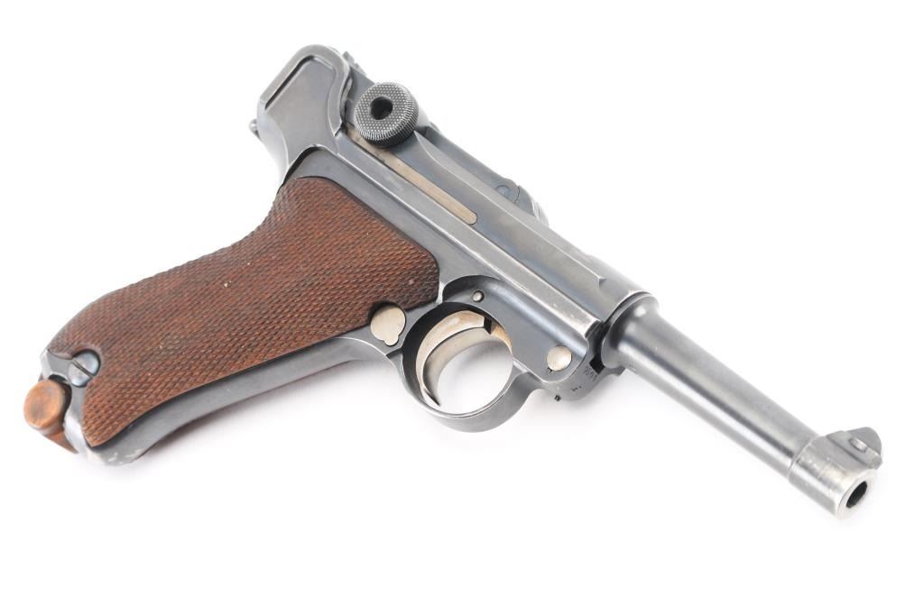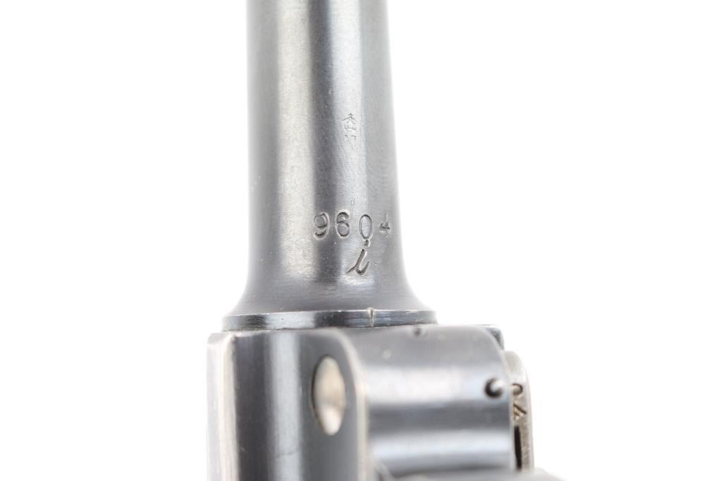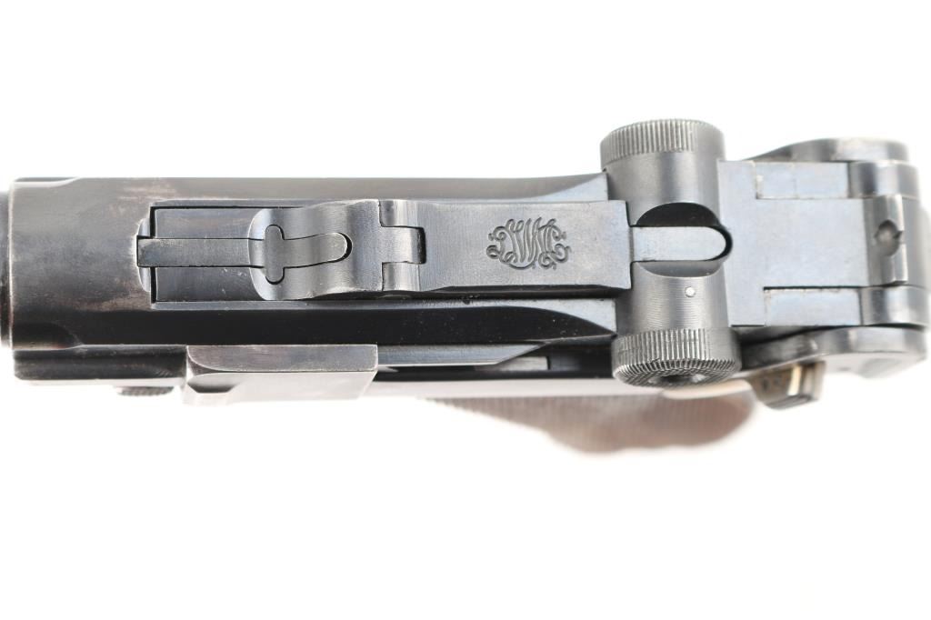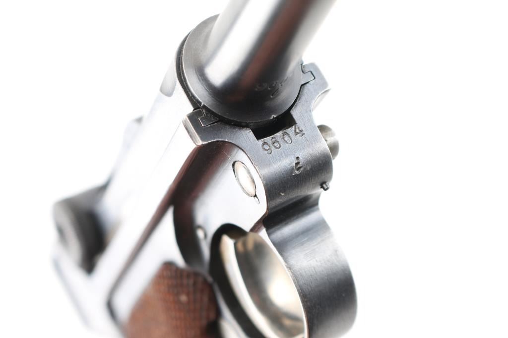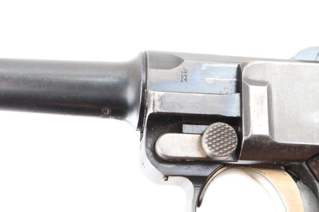 Undated German toggle locked recoil operated semi-automatic pistol chambered in 7.65 (30 Luger), manufactured between World Wars. No import marks observed. Not stamped "Germany" Features blued finish, 3 3/4" barrel, dovetailed inverted 'V' front sight with witness-marks, 'v' notched rear sight, smooth crescent trigger, knurled charging knobs on the rear toggle link, manual safety on the left side of the frame, knurled push button magazine release, steel frame with lanyard stable & stock lug, and two-piece finely checkered wood grips. Serial number matched on barrel, frame, toggle link, sideplate, & take-down lever. Bore is overall very good condition, bright with a small area of pitting at the muzzle. Backstrap slotted for shoulder stock. Retains 85% finish with edge losses & handling marks. Straw is about 80%. Grips are very good. Markings include crown over "N" proofs. Included magazine is bright metal, wood plug, unmarked. Comes in a brown leather WW1 hard shell holster, inside of flap is stamped "Schwarzenberger & Co. Nurnberg 1918", and below that is a very small "Germany", the back is stamped with a Crown over "III". 3rd Bavarian Army Corps. Overall very good condition except the right belt loop is missing stitching. NRA Condition-Good+. C&R Firearm.
