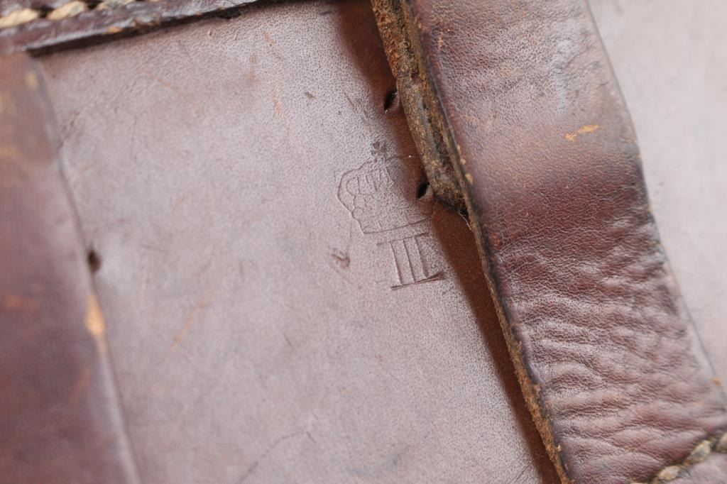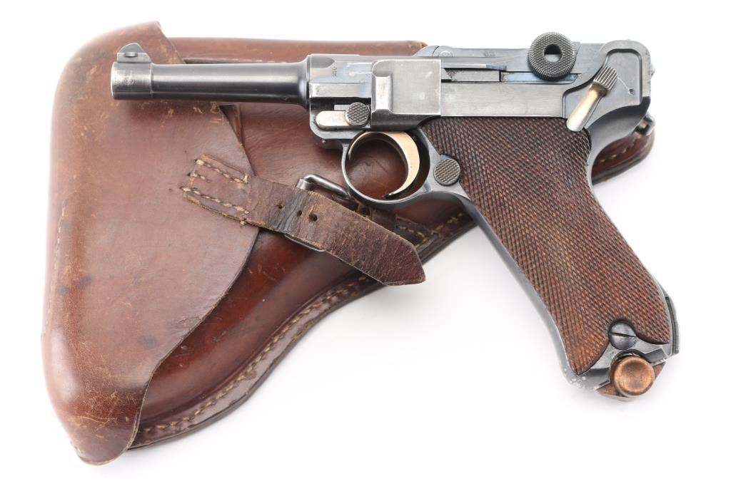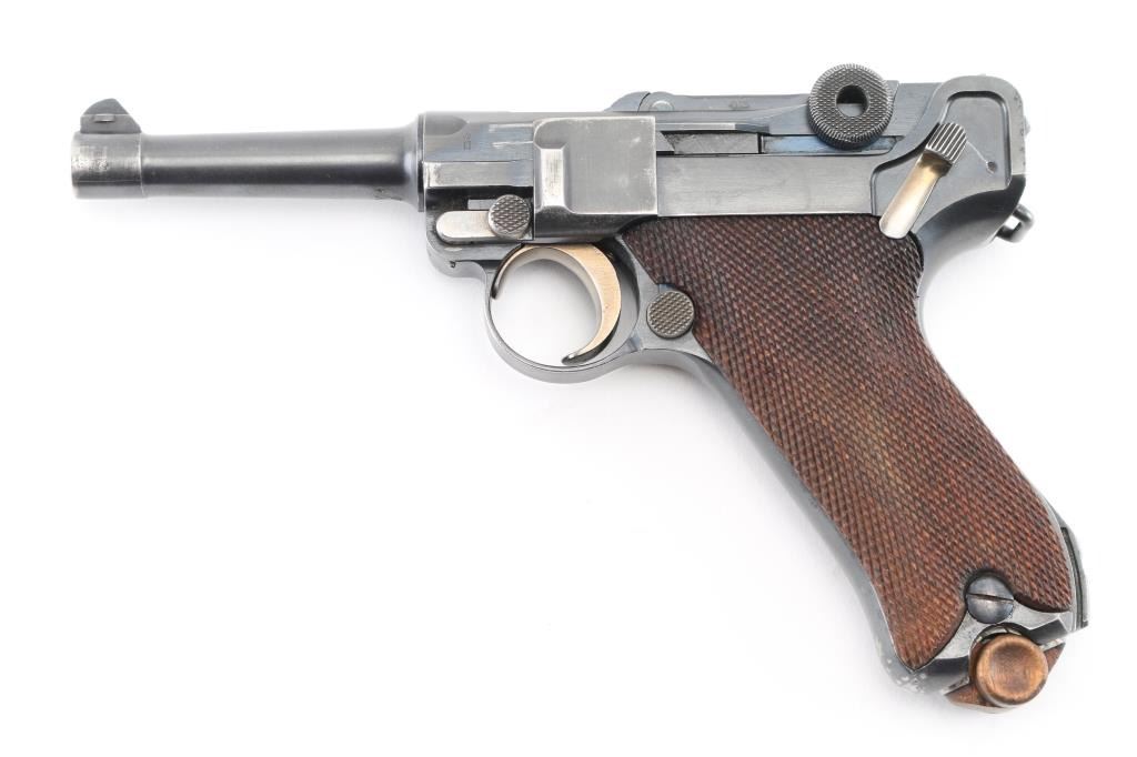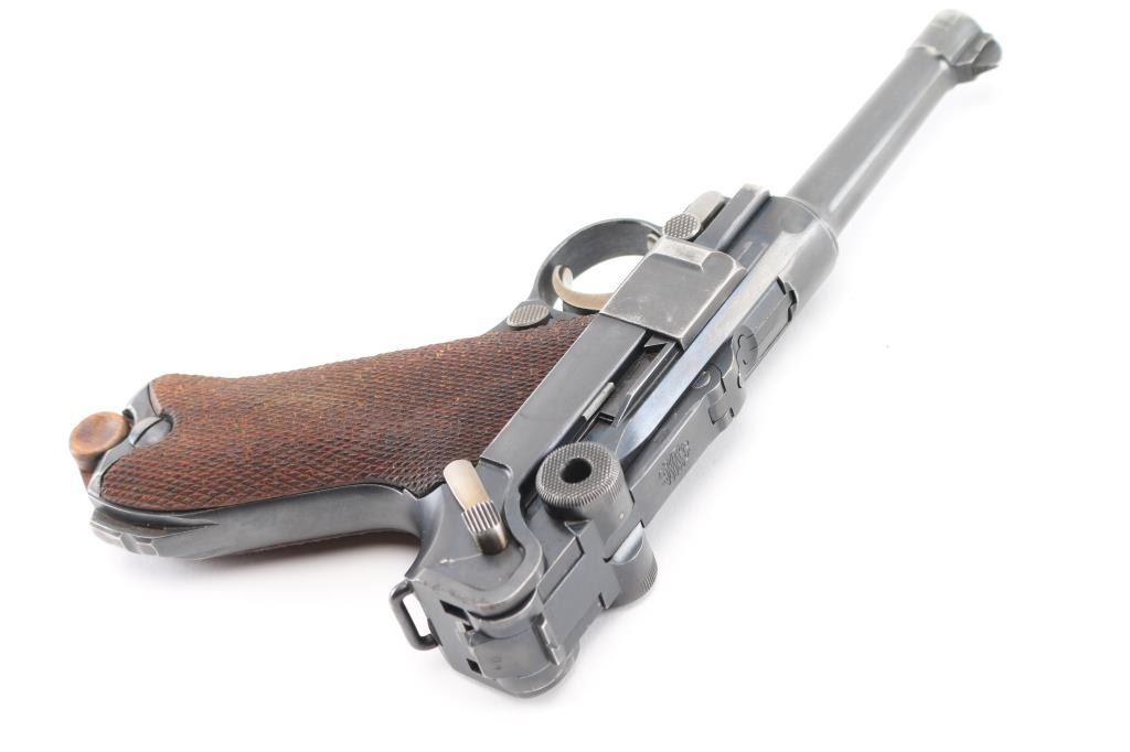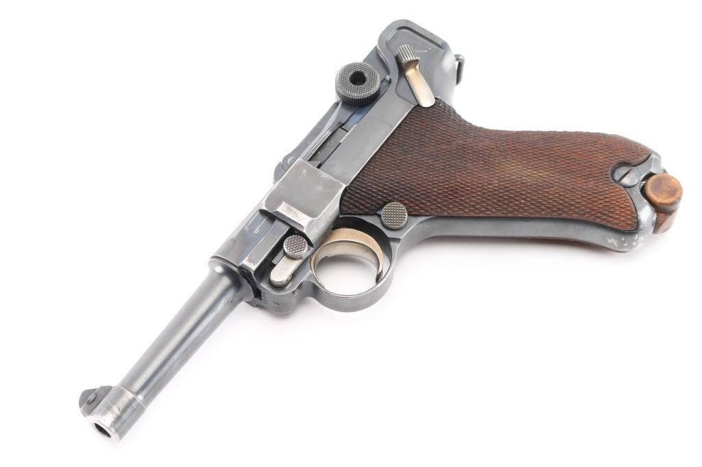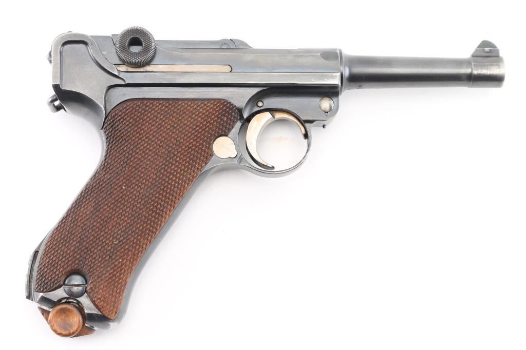 Undated German toggle locked recoil operated semi-automatic pistol chambered in 7.65 (30 Luger), manufactured between World Wars. No import marks observed. Not stamped "Germany" Features blued finish, 3 3/4" barrel, dovetailed inverted 'V' front sight with witness-marks, 'v' notched rear sight, smooth crescent trigger, knurled charging knobs on the rear toggle link, manual safety on the left side of the frame, knurled push button magazine release, steel frame with lanyard stable & stock lug, and two-piece finely checkered wood grips. Serial number matched on barrel, frame, toggle link, sideplate, & take-down lever. Bore is overall very good condition, bright with a small area of pitting at the muzzle. Backstrap slotted for shoulder stock. Retains 85% finish with edge losses & handling marks. Straw is about 80%. Grips are very good. Markings include crown over "N" proofs. Included magazine is bright metal, wood plug, unmarked. Comes in a brown leather WW1 hard shell holster, inside of flap is stamped "Schwarzenberger & Co. Nurnberg 1918", and below that is a very small "Germany", the back is stamped with a Crown over "III". 3rd Bavarian Army Corps. Overall very good condition except the right belt loop is missing stitching. NRA Condition-Good+. C&R Firearm.