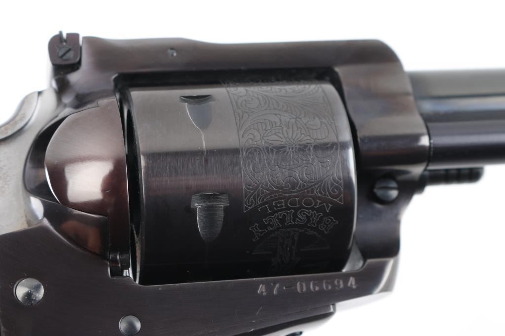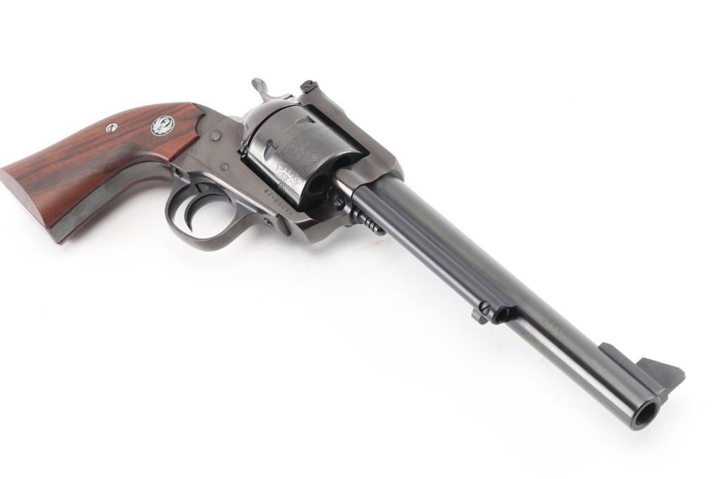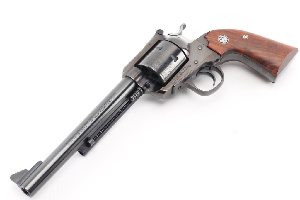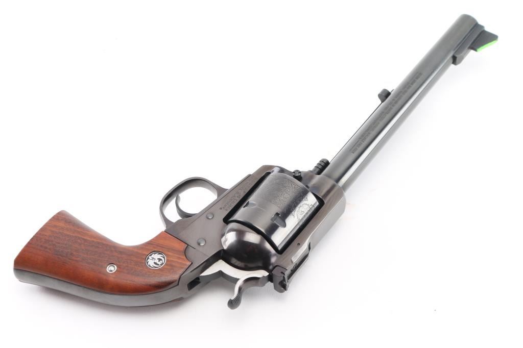 'Bisley' Single action revolver manufactured circa 1986. Features blued finish, smooth wood grips with Ruger medallions, 7.5" barrel, adjustable sights, un-fluted 6 shot cylinder with engraved "BISLEY MODEL" motif with images, Bisley shaped grip, Bisley shaped hammer. Bore & charge holes are very good condition. Retains 95% finish with few minor edge losses, thin drag line on cylinder, bright green paint on front sight. Smooth action, tight lock up. Condition is near NRA Excellent *** Modern Firearm ***