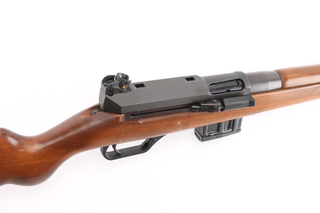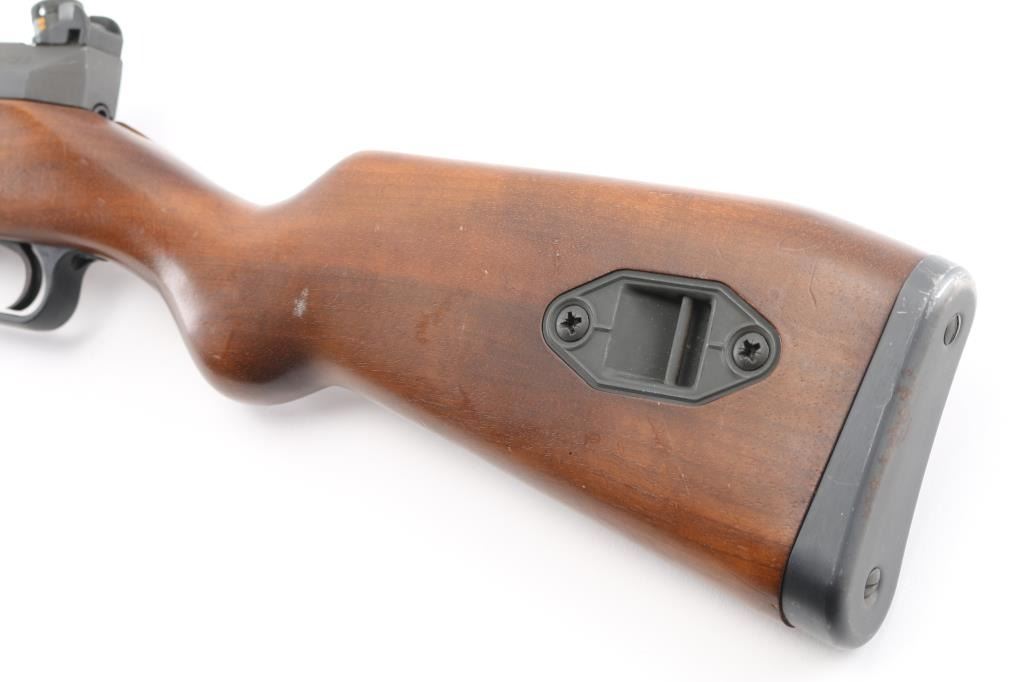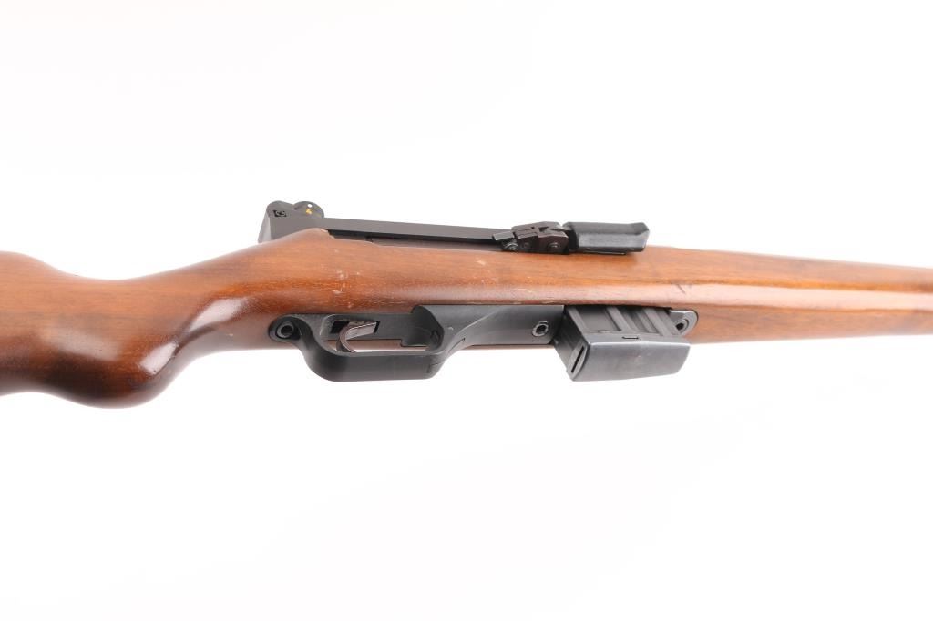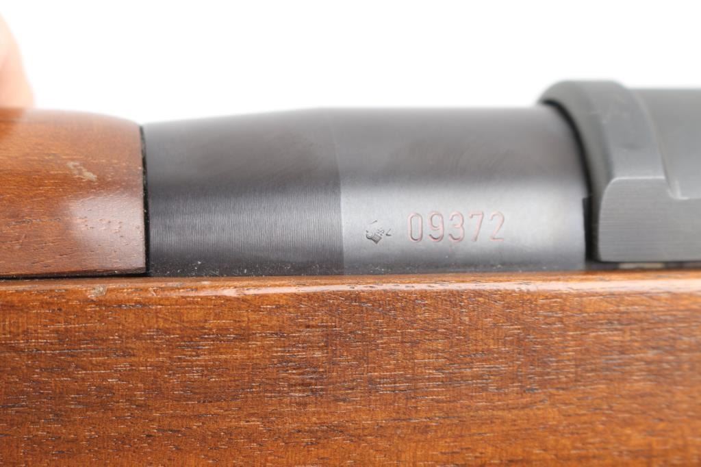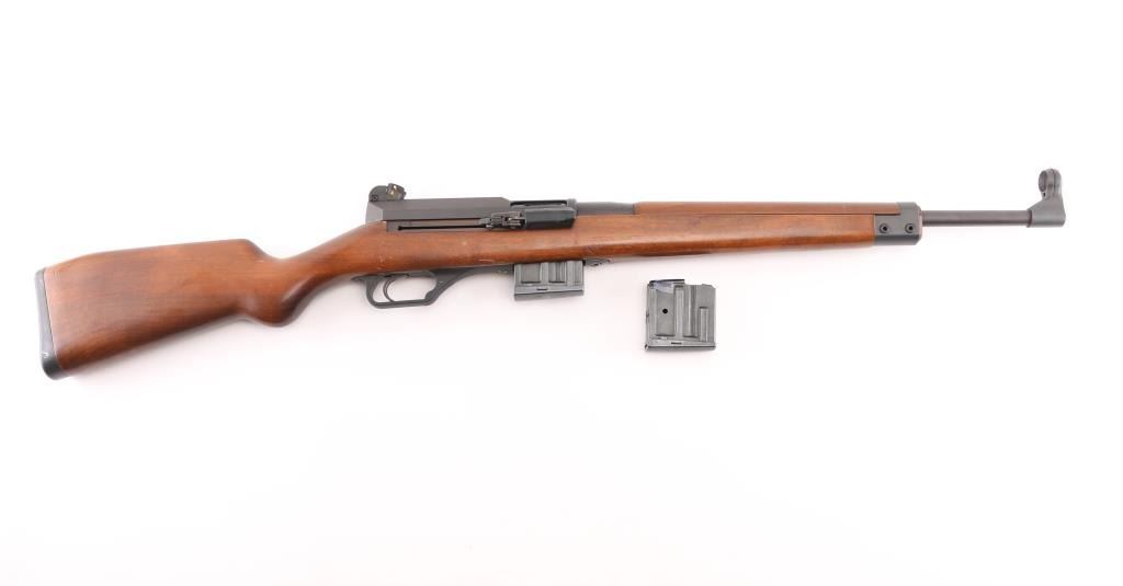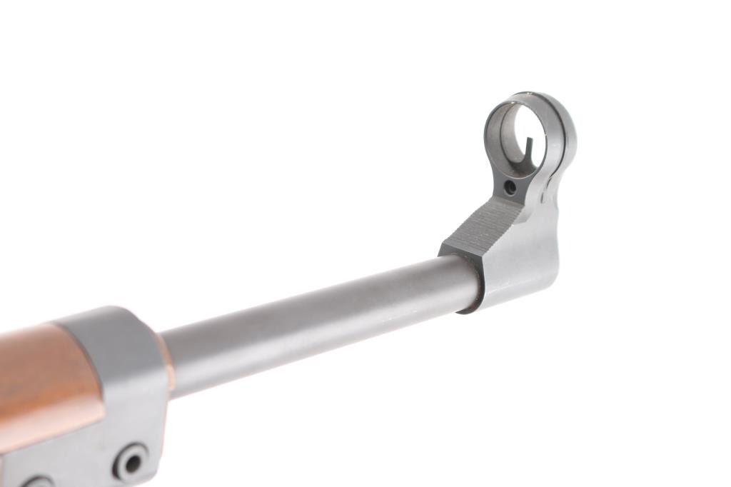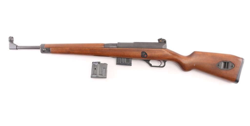 'Made in W Germany' semiautomatic rifle chambered in 223 Remington. Design is based on the HK-93/33 action, but with a straight line Euro sporter styled wood stock. Features approx 17.5 inch barrel, post front sight with circle protector ring, adjustable drum style rear sight, side mounted HK style sling mounts, manual safety on left side of stock, detachable magazine with release in trigger guard. Right side folding charging handle incorporates bolt release lever at rear. Top of receiver has sockets for a proprietary scope mounting system, not provided. Bore is very good bright condition. Metal finish is 95%, mostly parkerizing with barrel possibly blued; showing edge losses and scuffs. Very Good condition stock furniture features smooth hard wood handguard and cup style buttplate. Stock has several small dings and scratches. Small amount of rust formed on edge of buttplate. Includes two excellent condition 10 round magazines. Condition is NRA Very Good to Excellent *** Modern Firearm ***