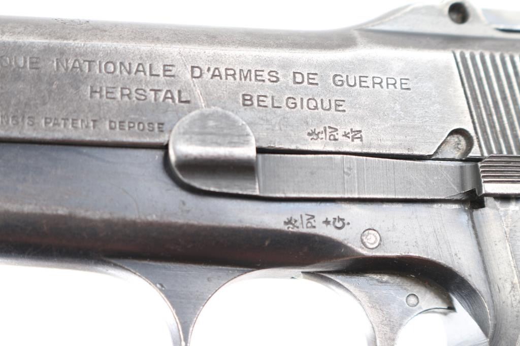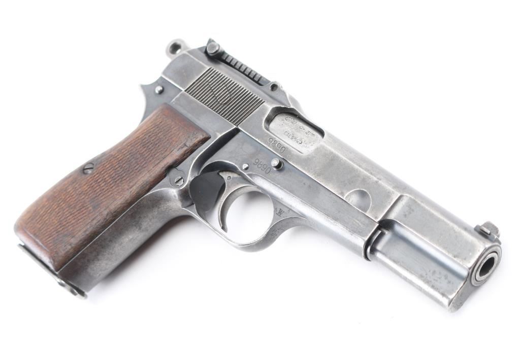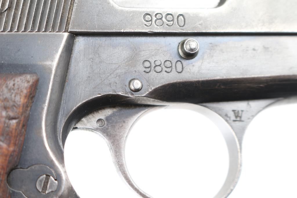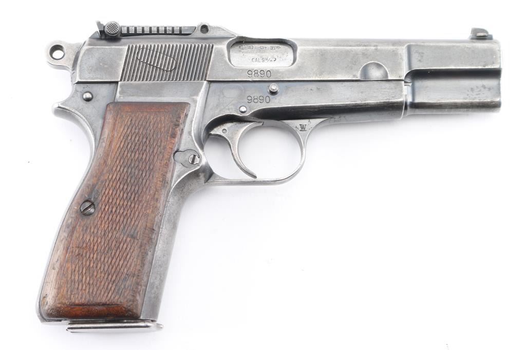 9mm SN: 9890 'Pre War Tangent & Slotted' Belgian semiautomatic pistol, manufactured circa 1935-1938. Identified as a Chinese contract pistol by Anthony Vanderlinden, author of the two volume reference books on FN Browning pistols. Features blued finish, checkered wood grips, 4.75" barrel, single action trigger, dovetailed blade front sight, Type II tangent rear sight adjustable to 500m, frame mounted safety, push button magazine release. Numbers match on slide, frame, barrel. Marked with "A" inside square box, crown over "PV", star over "N", star over "G", "ELB" & star in oval, "W" with underscore. Markings are crisp & even. Bore is good to very good condition, a bit gray and frosted throughout. Retains little original finish, some original dark color under slide stop and similar places, mostly mottled gray with moderate edge losses. Thin patina on grip straps, few isolated patches of pinpricking on slide. Grips are good condition, smoothed, losses to checkering points, showing dents, left panel has circular shape that is not identifiable, appears to be a purposeful marking. Includes (1) unmarked 'split base' magazine (Belgian military, correct type for this pistol). Condition is NRA Good+ *** C&R Firearm ***