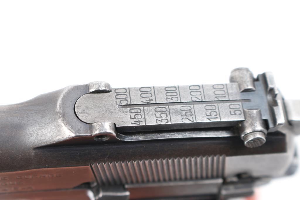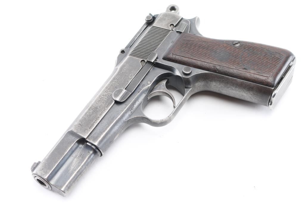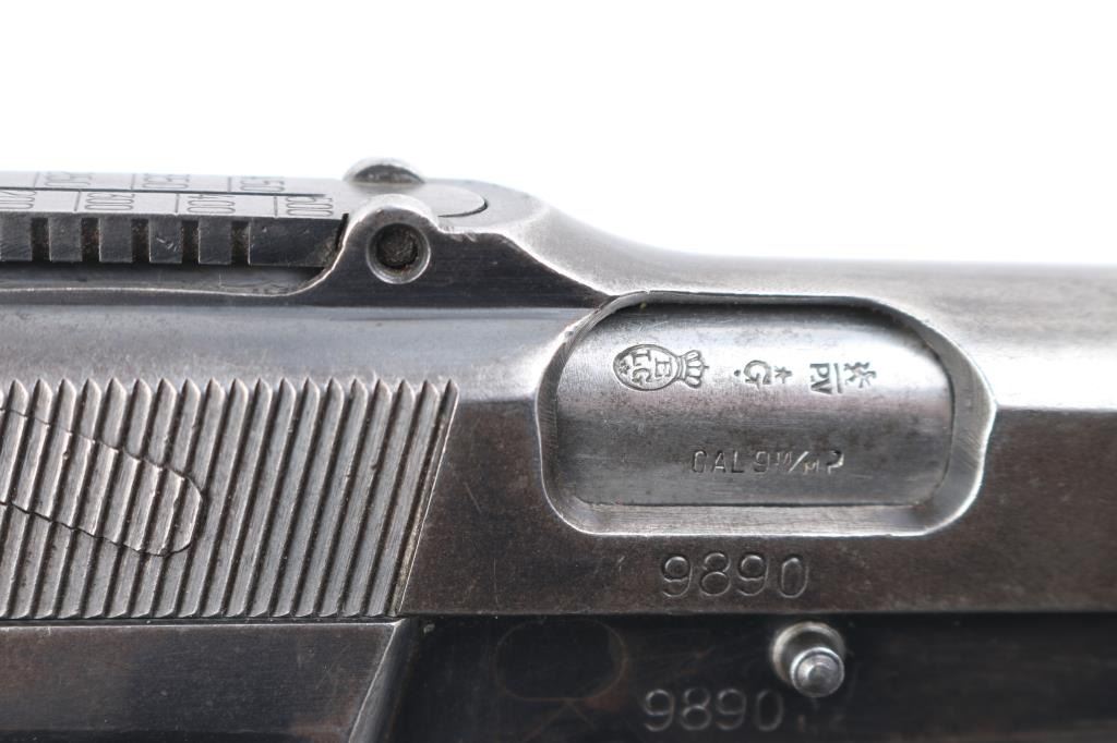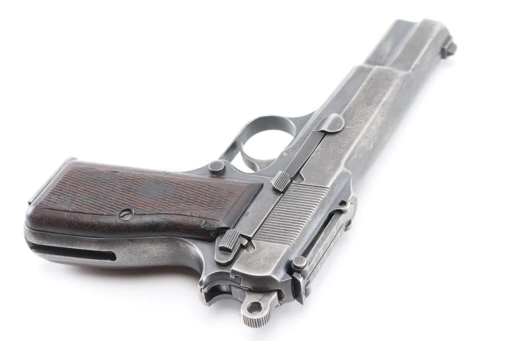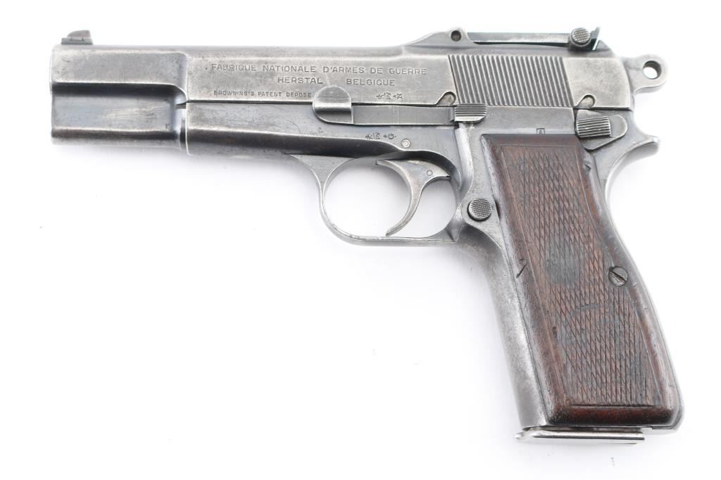 9mm SN: 9890 'Pre War Tangent & Slotted' Belgian semiautomatic pistol, manufactured circa 1935-1938. Identified as a Chinese contract pistol by Anthony Vanderlinden, author of the two volume reference books on FN Browning pistols. Features blued finish, checkered wood grips, 4.75" barrel, single action trigger, dovetailed blade front sight, Type II tangent rear sight adjustable to 500m, frame mounted safety, push button magazine release. Numbers match on slide, frame, barrel. Marked with "A" inside square box, crown over "PV", star over "N", star over "G", "ELB" & star in oval, "W" with underscore. Markings are crisp & even. Bore is good to very good condition, a bit gray and frosted throughout. Retains little original finish, some original dark color under slide stop and similar places, mostly mottled gray with moderate edge losses. Thin patina on grip straps, few isolated patches of pinpricking on slide. Grips are good condition, smoothed, losses to checkering points, showing dents, left panel has circular shape that is not identifiable, appears to be a purposeful marking. Includes (1) unmarked 'split base' magazine (Belgian military, correct type for this pistol). Condition is NRA Good+ *** C&R Firearm ***