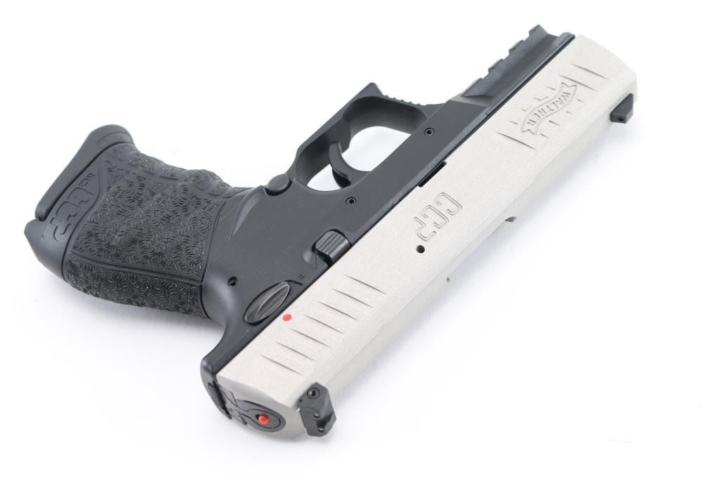 German semiautomatic pistol imported by Walther Arms, Fort Smith AR. Features two tone finish (nickel plated slide over matte black polymer frame), accessory rail under dust cover, 3.5" barrel, sights in dovetails, single action striker fired, manual safety, push button magazine release. Overall condition is like new with few signs of handling. Includes (2) magazines, cleaning brush, manual, factory hard case. Condition is NRA Excellent - like new *** Modern Firearm ***