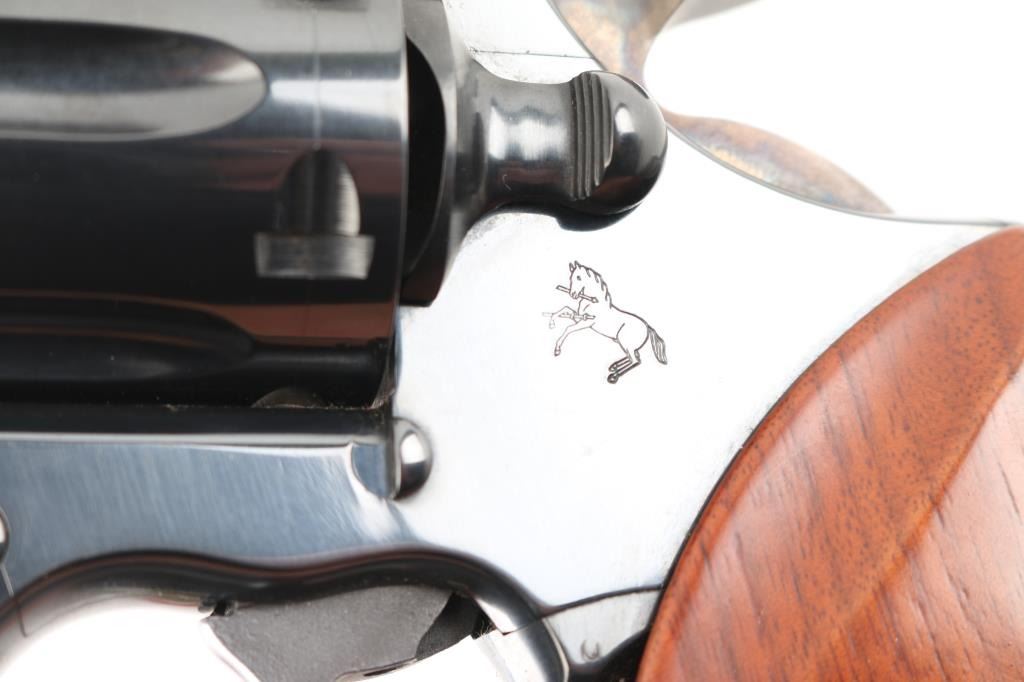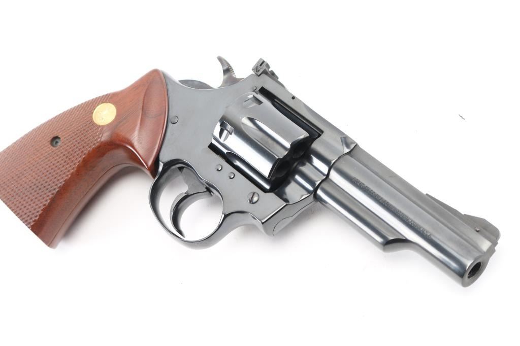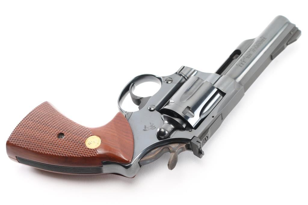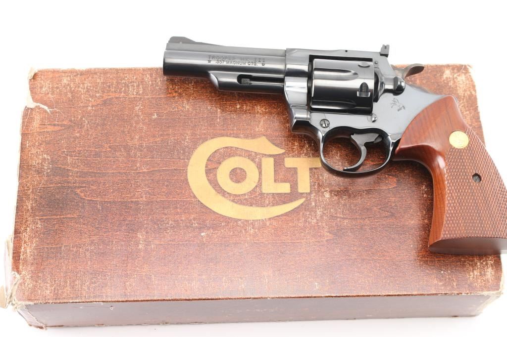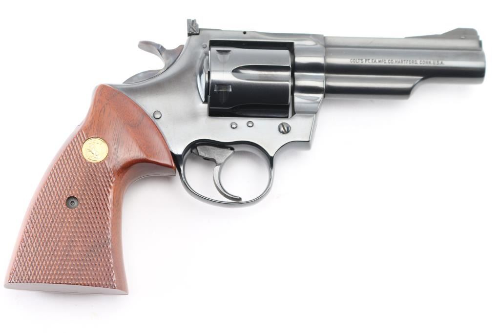Double-action revolver chambered in .357 Magnum. Manufactured circa 1970's. Features a blued finish, 4" barrel with solid top rib, shrouded ejector rod, raised & pinned ramp front sight, adjustable rear sight, fluted six-shot cylinder, smooth trigger, case hardened hammer with knurled wide spur and two-piece walnut checkered grips with rampant Colt medallions. Serrated backstrap. Bore is excellent. Revolver appears nearly new with faint cylinder drag line, at least 99% blue. Grips are excellent. Comes in original "wood grain" cardboard box with Styrofoam insert. The sides are separated, but are in the box. Condition is NRA Excellent -Modern Firearm.