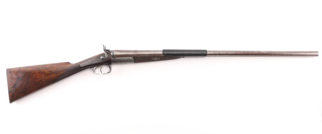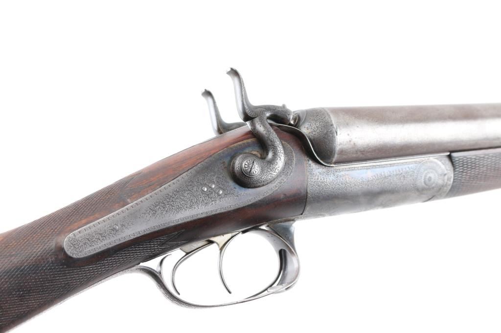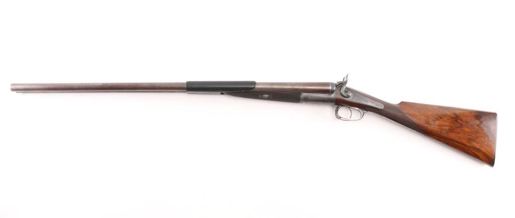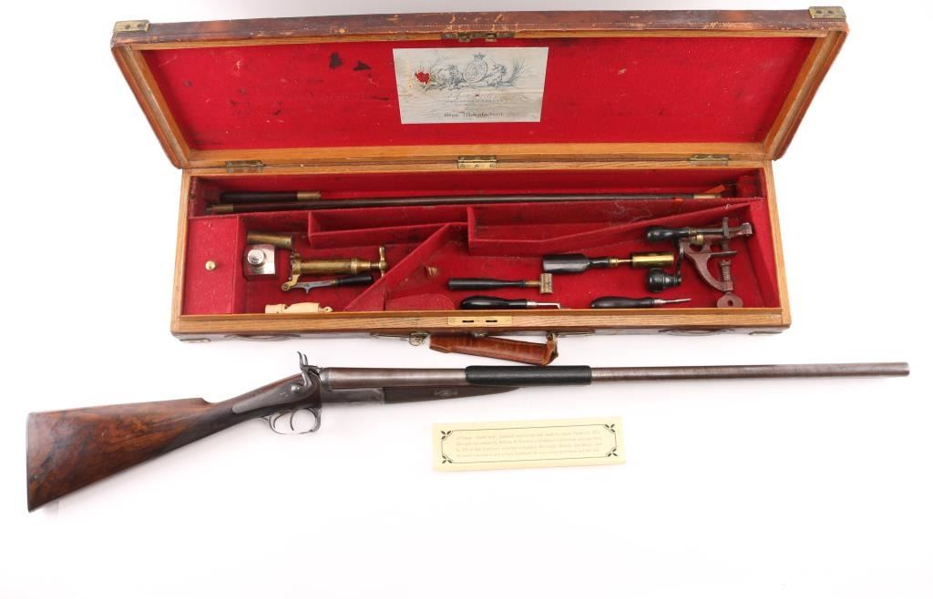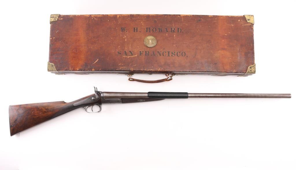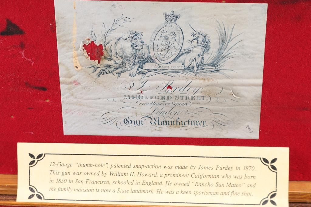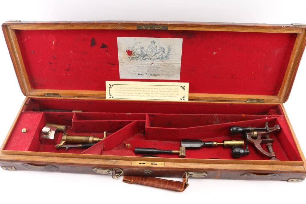 This was the property of William H. Howard, a prominent who was born in San Francisco in 1850, schooled in England, cattle rancher, Dairy farmer, he owned "Rancho San Mateo" which is now a state landmark. He died in 1901 at the age of 51 of "Blights Disease". This is a James Purdey 12 Gauge Hammer Shotgun with First Patent Thumb Lever, circa 1870, highly figured walnut stock with finely checkered forend and grip, checkered horn buttplate, locks, hammers, action, lever, and triggerguard with fine scroll engraving, Damascus barrels with plain rib marked "J. PURDEY 314 1/2 OXFORD STREET LONDON, underside of action marked "PURDEY'S PATRENT, and upper tang marked "PATENT", black leather grip attached to barrels, silver oval inletted in the under side of the butt stock with the intertwined initials "WHH" LOP is 14 /4", un-choked bores. " 30 1/8" barrels, bore are good with light pitting above the chambers, barrels have turned a brown patina, traces of case color remain on the locks, action works well, tight lock-up. wood stocks are very good with minor scratches,dings. Comes in a vintage Purdey wood case covered in brown leather case. Lid embossed in black "W. H. Howard San Francisco.", a brass oval with the intertwined initials "WHH" red felt lining, with fancy Purdey label, mostly intact, ebony handled tools, cleaning rod, powder measures, etc, most have brass fittings, a Victorian pea ivory whistle for the dogs, A good quality 12 bore loading tool by Bartram and Co with good markings, brass with ebony handle, shot shell roll crimping tool by James Dison & Sons, Sheffield. Marked on the handle; "J D & S Patent 1203 10" . 90%+ original Brick Red paint. Black handles with no damage, and a Purdey marked metal oiler. Handle is broken. A fantastic set with a great history. NRA Condition-Very Good. Antique Firearm.