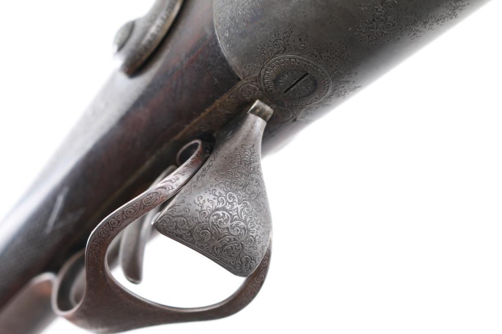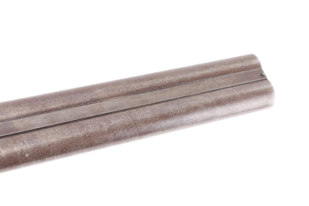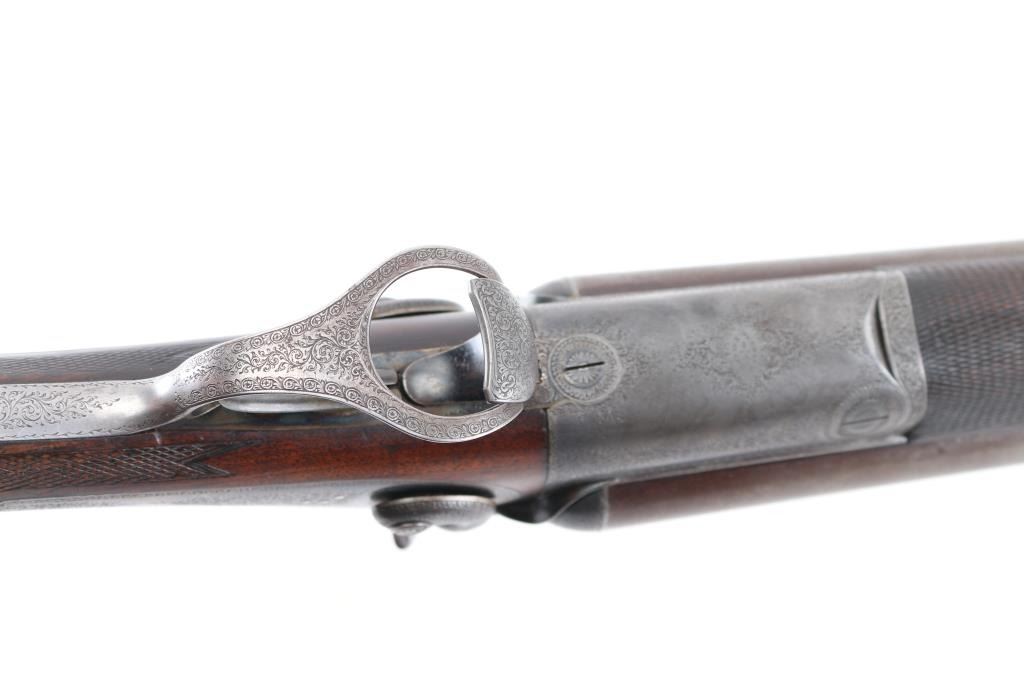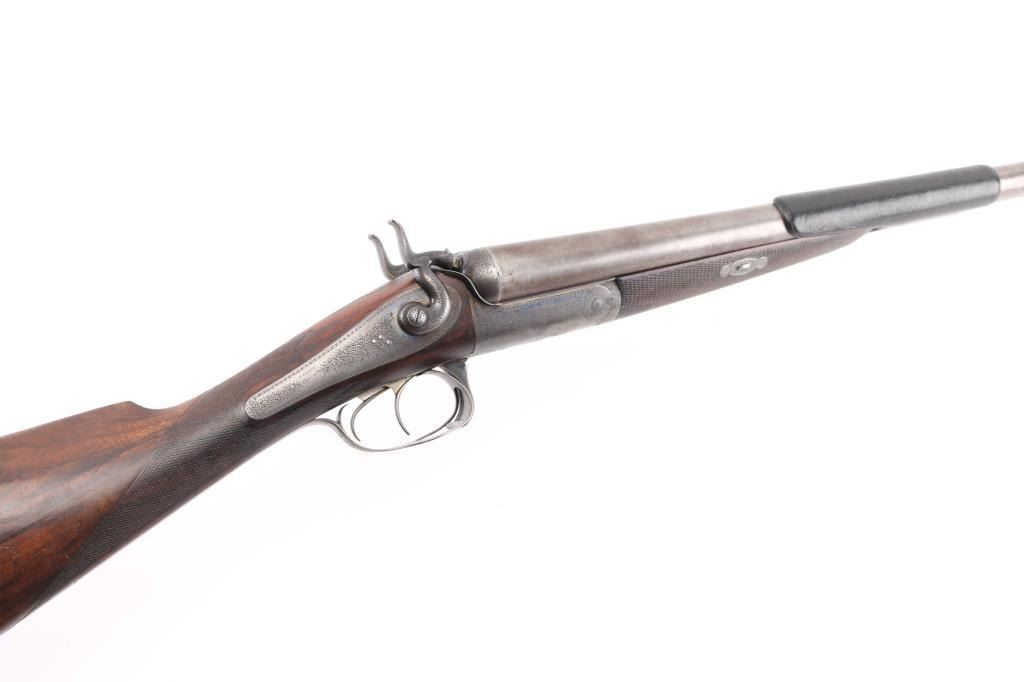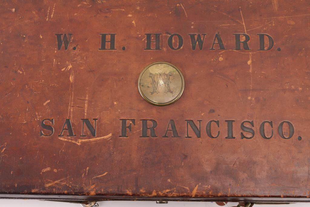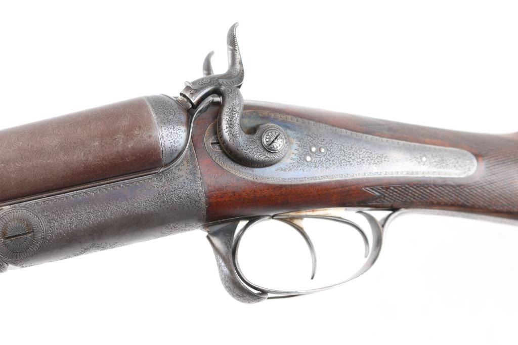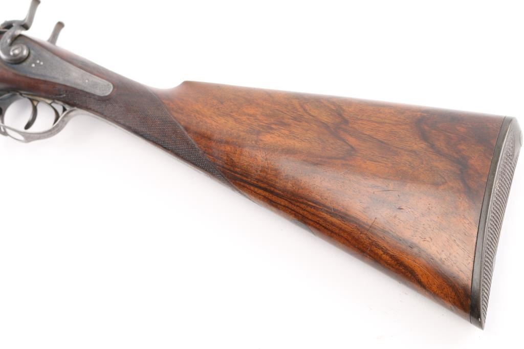 This was the property of William H. Howard, a prominent who was born in San Francisco in 1850, schooled in England, cattle rancher, Dairy farmer, he owned "Rancho San Mateo" which is now a state landmark. He died in 1901 at the age of 51 of "Blights Disease". This is a James Purdey 12 Gauge Hammer Shotgun with First Patent Thumb Lever, circa 1870, highly figured walnut stock with finely checkered forend and grip, checkered horn buttplate, locks, hammers, action, lever, and triggerguard with fine scroll engraving, Damascus barrels with plain rib marked "J. PURDEY 314 1/2 OXFORD STREET LONDON, underside of action marked "PURDEY'S PATRENT, and upper tang marked "PATENT", black leather grip attached to barrels, silver oval inletted in the under side of the butt stock with the intertwined initials "WHH" LOP is 14 /4", un-choked bores. " 30 1/8" barrels, bore are good with light pitting above the chambers, barrels have turned a brown patina, traces of case color remain on the locks, action works well, tight lock-up. wood stocks are very good with minor scratches,dings. Comes in a vintage Purdey wood case covered in brown leather case. Lid embossed in black "W. H. Howard San Francisco.", a brass oval with the intertwined initials "WHH" red felt lining, with fancy Purdey label, mostly intact, ebony handled tools, cleaning rod, powder measures, etc, most have brass fittings, a Victorian pea ivory whistle for the dogs, A good quality 12 bore loading tool by Bartram and Co with good markings, brass with ebony handle, shot shell roll crimping tool by James Dison & Sons, Sheffield. Marked on the handle; "J D & S Patent 1203 10" . 90%+ original Brick Red paint. Black handles with no damage, and a Purdey marked metal oiler. Handle is broken. A fantastic set with a great history. NRA Condition-Very Good. Antique Firearm.
