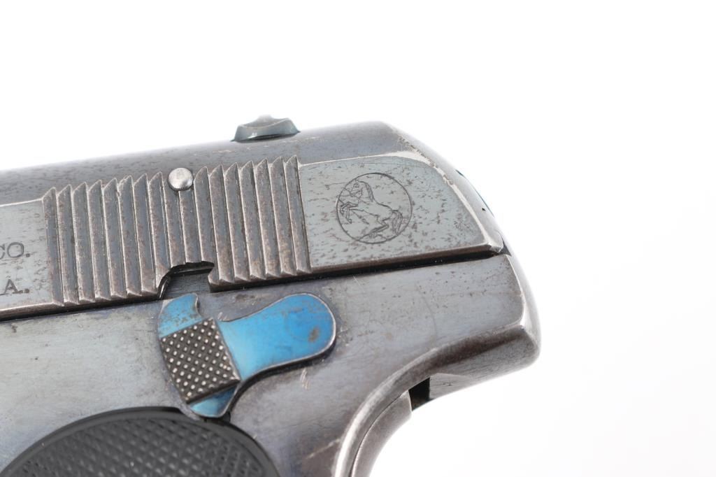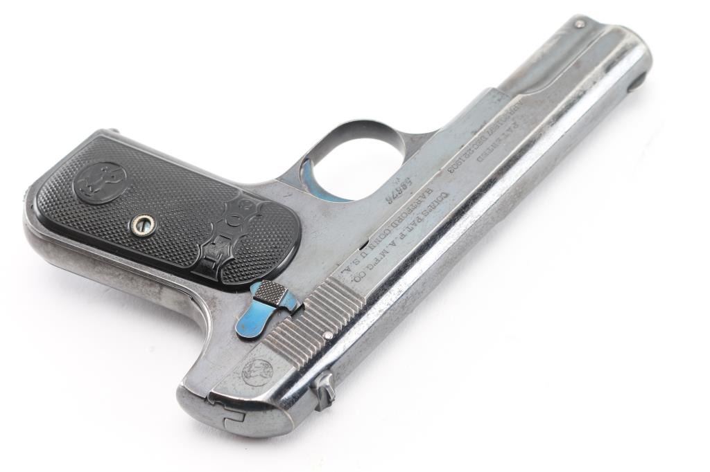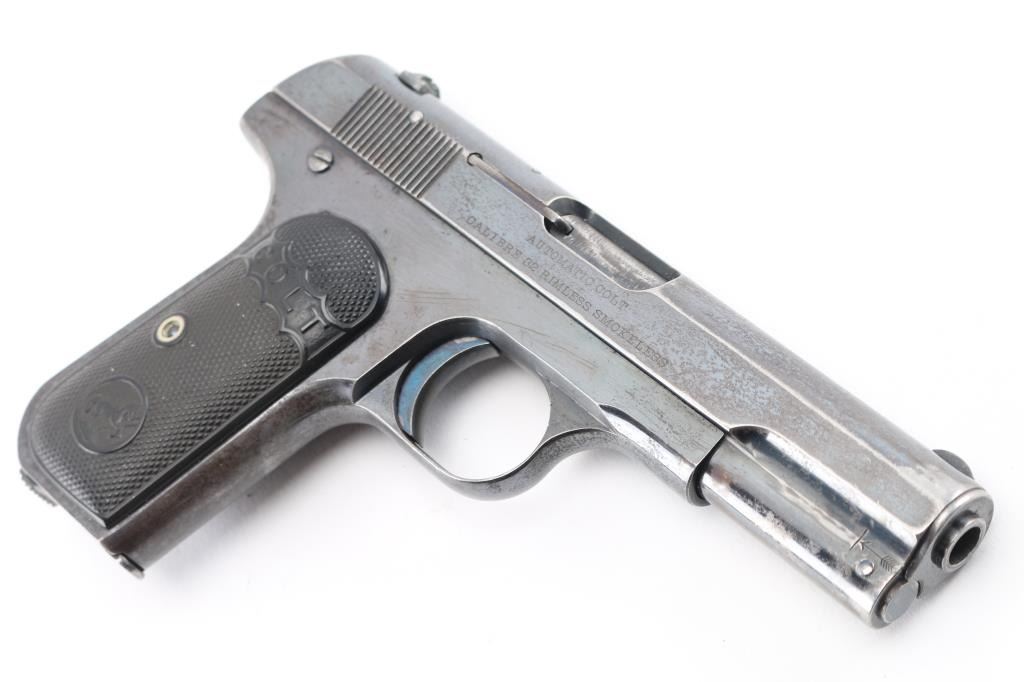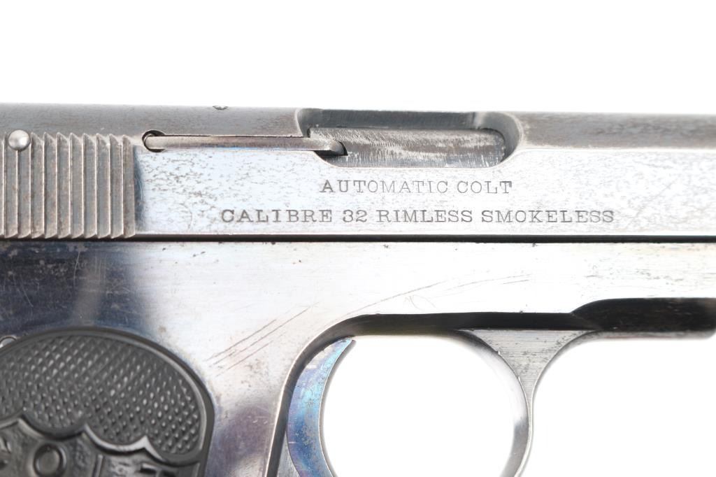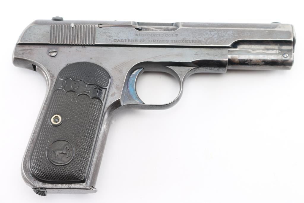 Vintage single action semi-automatic compact pistol chambered in .32 Auto, manufactured circa 1907. Early gun with barrel bushing. Features a blued finish, 4" barrel, low-profile round blade front sight, dovetailed rear sight with 'u' notch, two-line address/patent marking on the left side of the slide, smooth trigger, concealed hammer, thumb safety/slide catch on the left side of the frame, grip safety, heel magazine release, 8 round blued magazine, steel frame and two-piece checkered black hard rubber (or Gutta Percha) grips with embossed "COLT" and Rampant Colt logo. Bore is good to very good condition, showing very little frosting. Pistol retains approximately 75% finish, faded to gray where handled, with edge losses, small areas of cleaned patina clustered around front of slide. Much bright blue color retained on sides of trigger, on safety, also along very top edge of frame near slide. Rear edge of mag release missing a small corner. Rampant Colt logo at rear of left side of slide remains sharp, with full detail. Grips are very good, show slight smoothing of details from handling. One magazine included, good condition, unmarked. Condition is NRA Very Good *** C&R Firearm ***