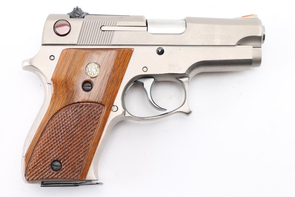 SN: A635864. Trapper Gun Scorpion Conversion Smith & Wesson Model 39-2 Semi-Automatic Pistol. Built by Lin Alexiou of Fraser, Michigan, the Scorpion was a conversion package offered by Trapper Gun Inc. for the Smith & Wesson Model 39. Circa 1970's. It is very much in the same vein as the popular Devel full house conversion. For this conversion, the barrel (3 1/4"), frame, and magazine were shortened, the hammer was bobbed, and the trigger guard was thinned on the right side with a finger hook added to the front. The left side of the slide has been remarked "Trapper Gun." with "Scorpion" on the right. The sides of the pistol and frame are a matte nickel finish with stippling on the remaining surfaces. Ramped front sight with orange insert, adjustable white outline notch rear, blued slide stop, and plum colored safety/de-cocker. Bore is excellent/bright, grips & finish are excellent. Action is crisp/smooth. The Scorpion Trapper Gun, Devel and ASP were all variations made around the same time before compact 9MM pistols were being produced. A scarce pistol that rarely comes up for sale. NRA Condition-Excellent. Modern Firearm