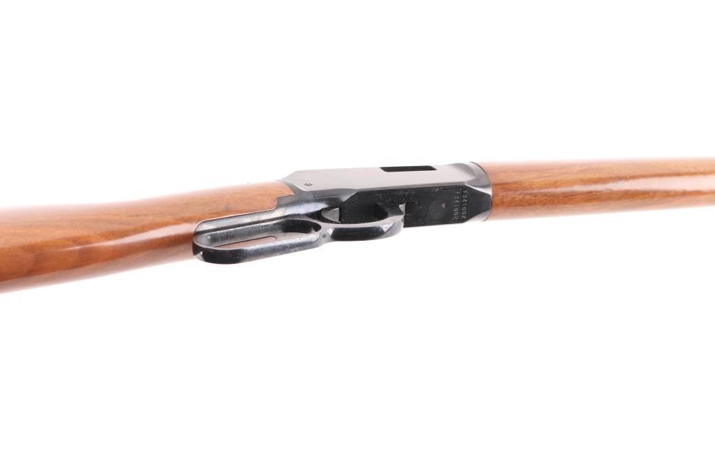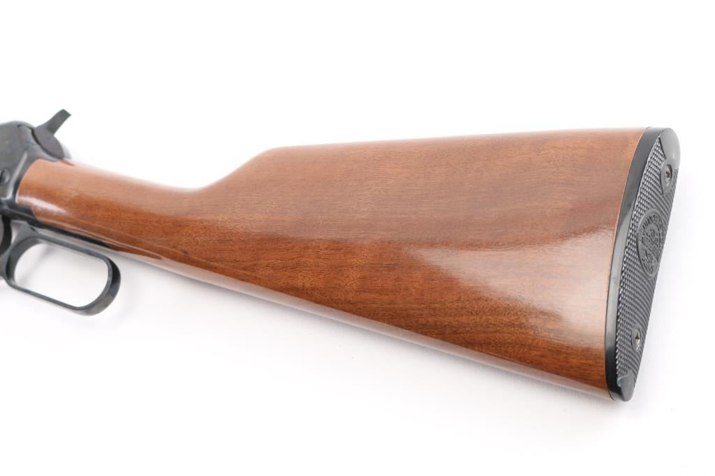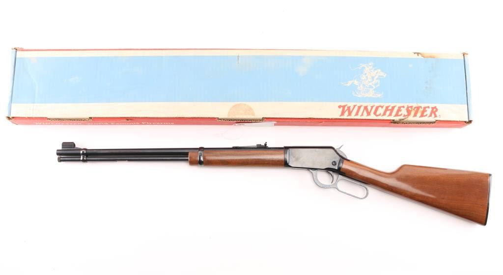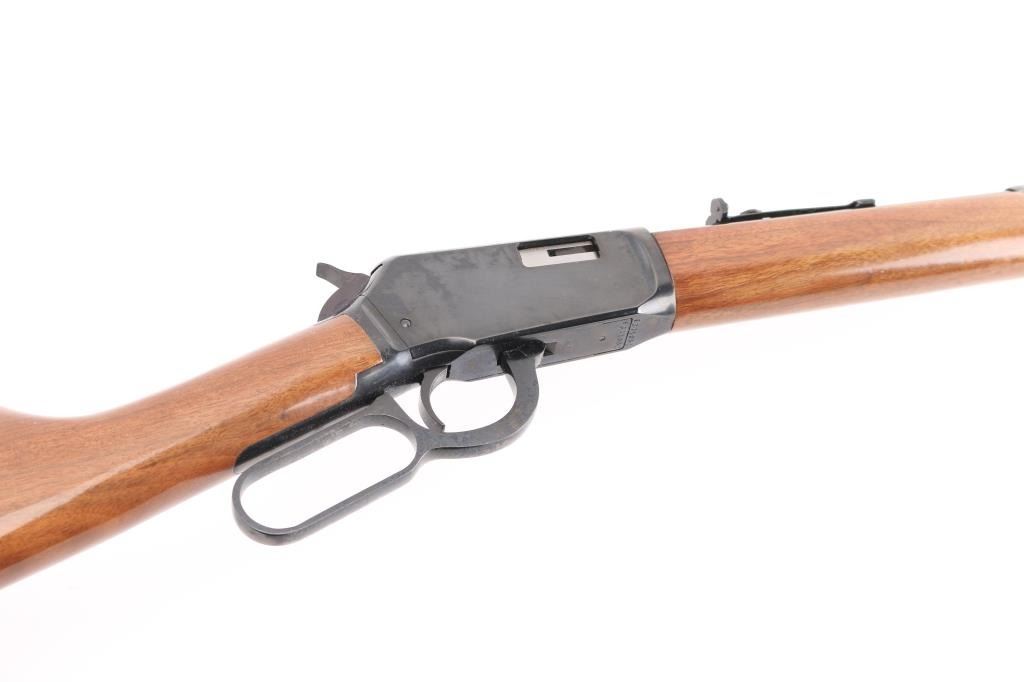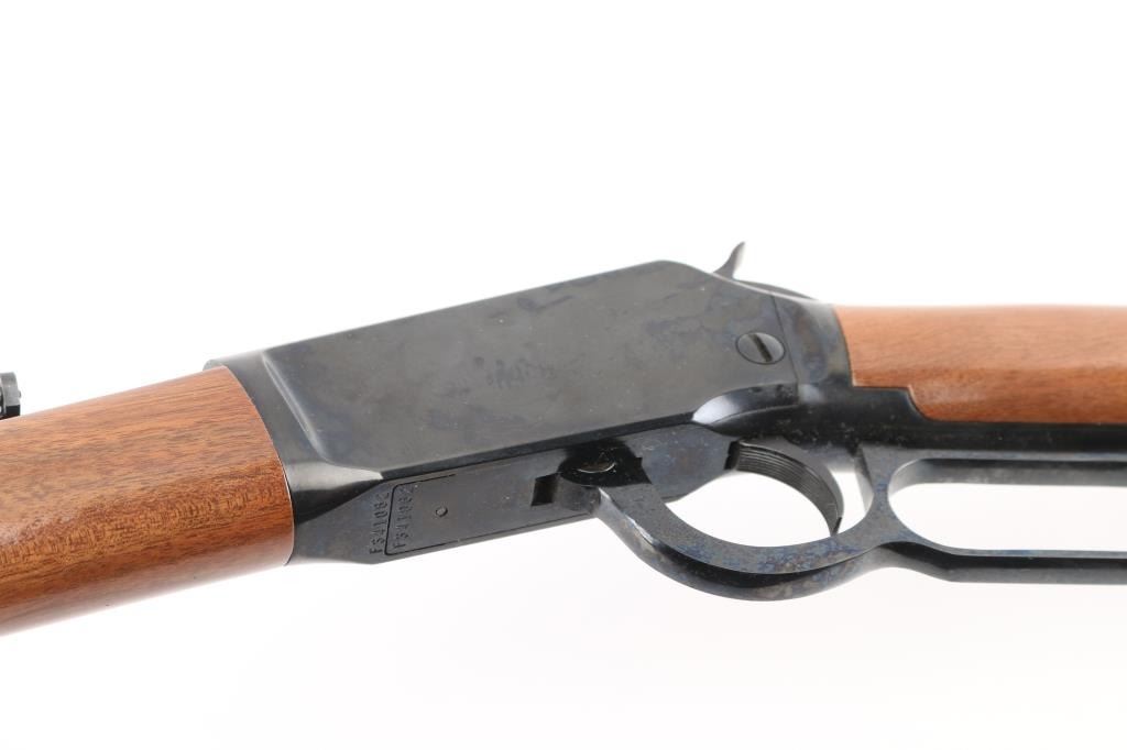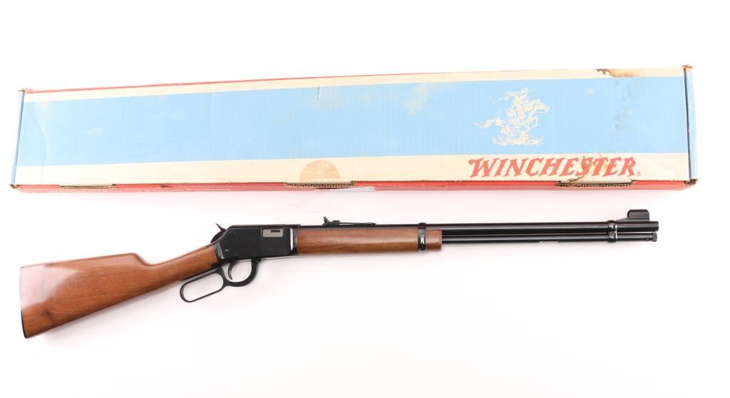 Lever action rimfire rifle features blued finish, fancy figured walnut forend & stock with smooth wrist & forend, flat plastic factory buttplate, 20" barrel, full length magazine tube under barrel, hooded post/bead front & sporting rear sights. Bore is excellent. Overall condition is excellent, blue is+ 99%. Wood is excellent. Comes in its original factory box with manual. Condition is NRA Excellent. Modern Firearm.