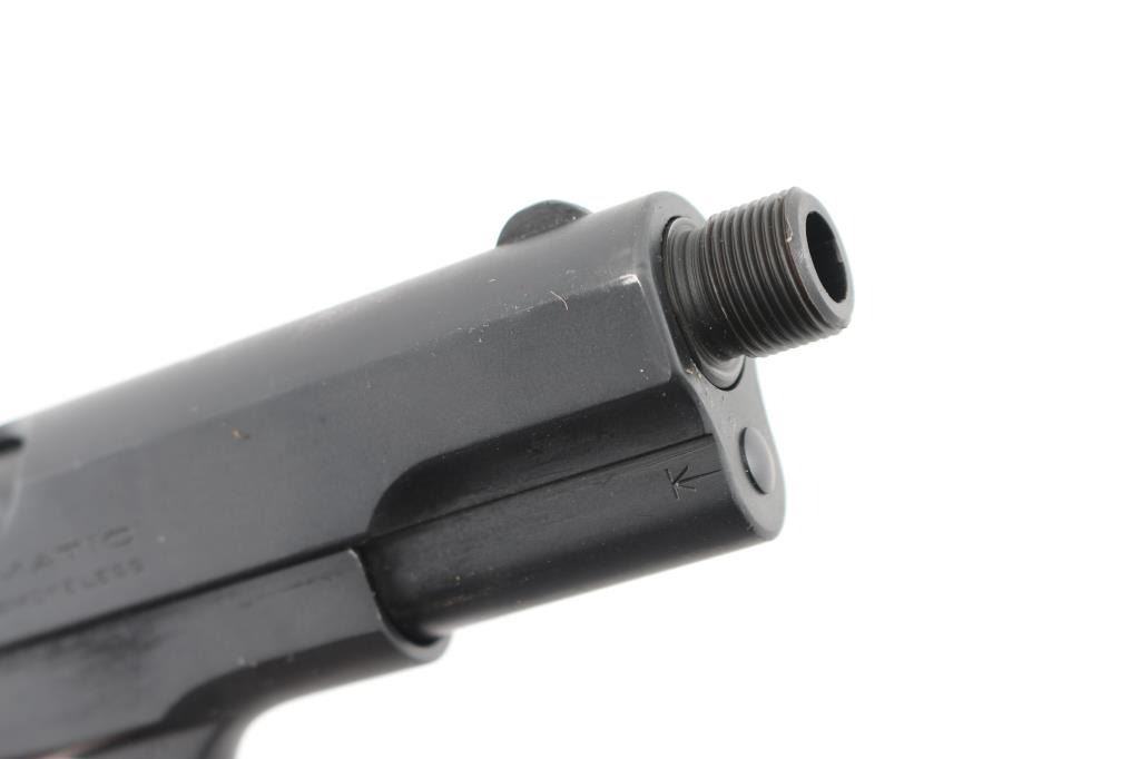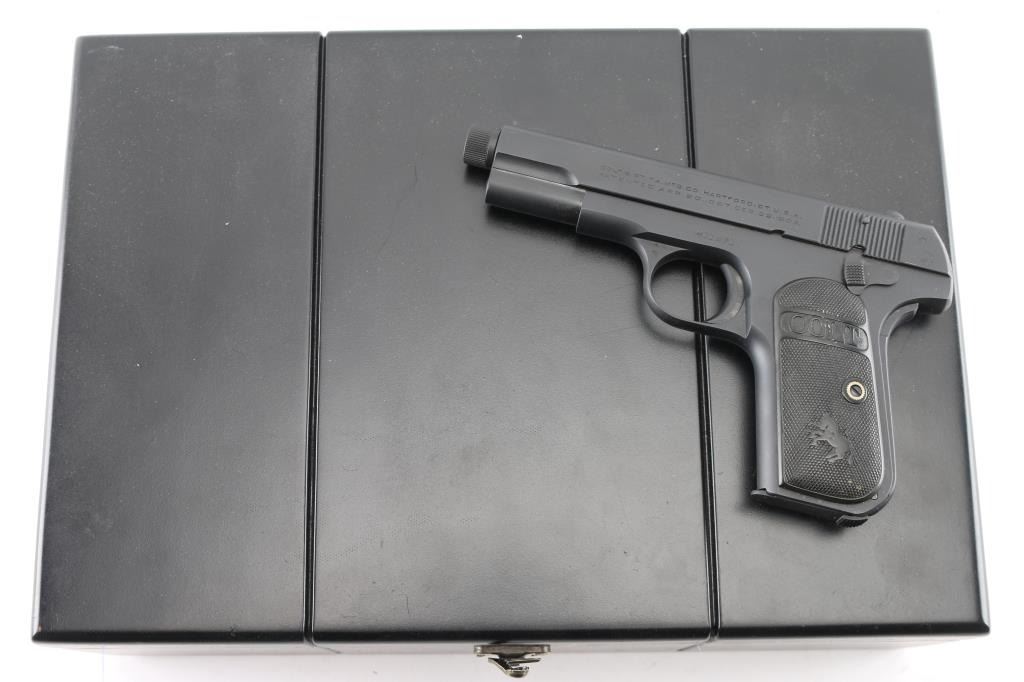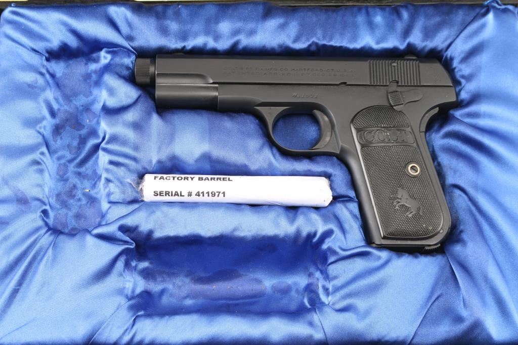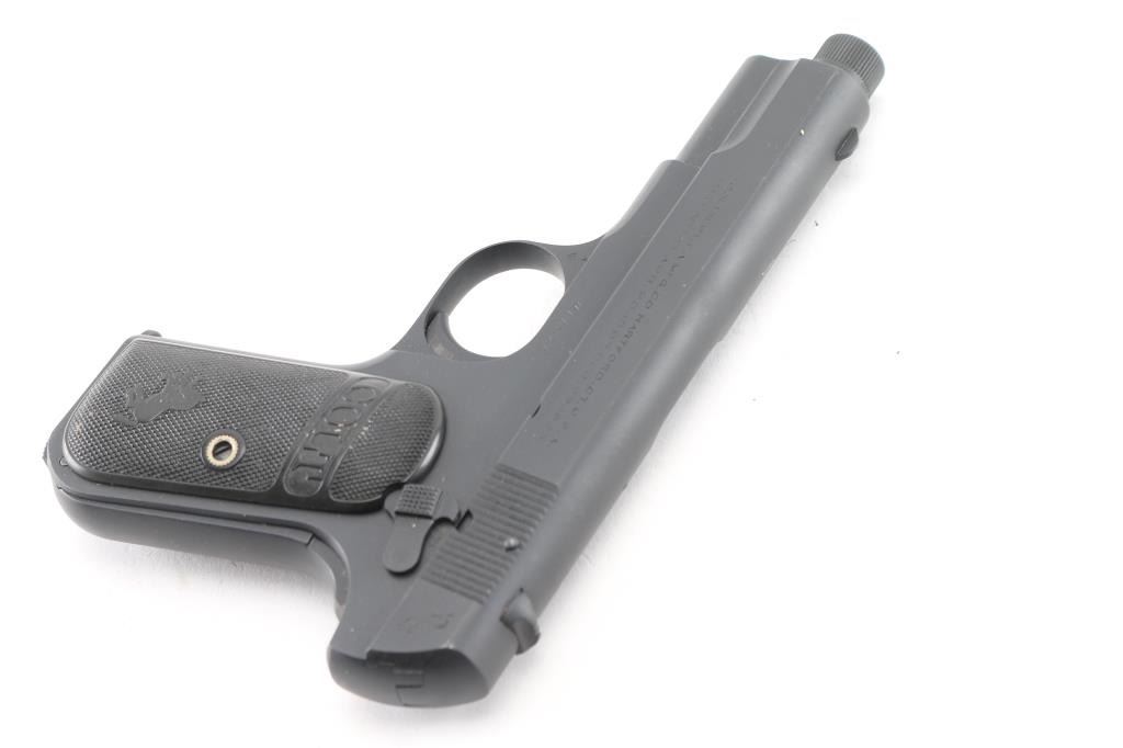 'Type 3' Re-finished, re-barreled vintage semiautomatic pistol manufactured circa 1915. Features, checkered black hard rubber grips with embossed Colt banners and Rampant Colt logos, re-barreled with a 4" In Lead We Trust threaded barrel, fixed sights, manual safety, grip safety, heel magazine release. Bore is excellent/bright. Parkerized re-finish is excellent. Standard Colt markings are overall crisp/clear. Grips are very good condition with smoothing of embossed features. Includes the original Colt factory barrel, (1) good condition colt marked parkerized magazine. Comes in a nice black wood form fitted blue lined display case with printed label. Also comes with a Colt factory letter, sold to Clark Smith Hardware Co., Peoria Illinois, July 7th, 1922, 10 gun shipment. Condition is NRA Excellent as Restored. C&R Firearm.