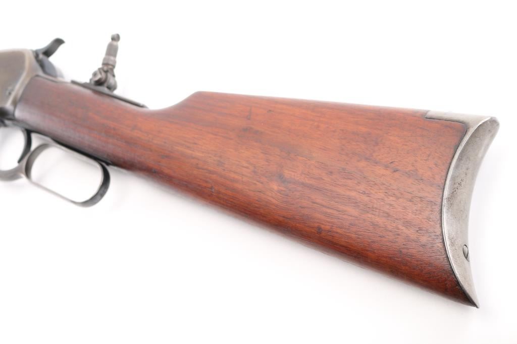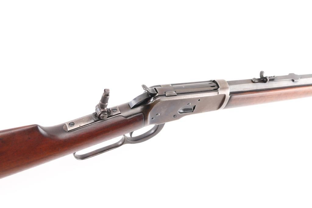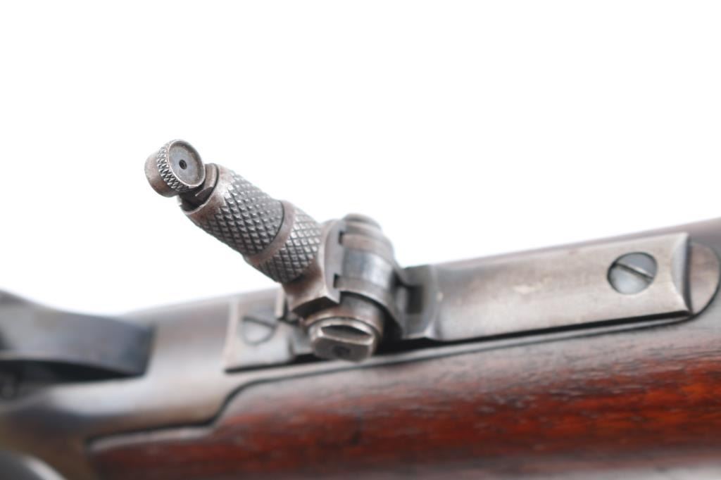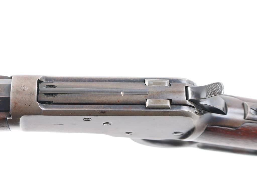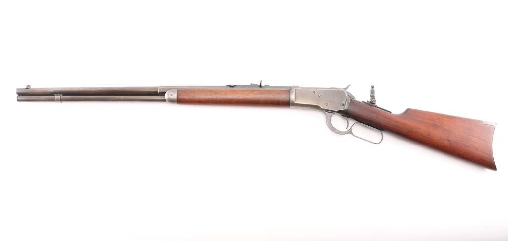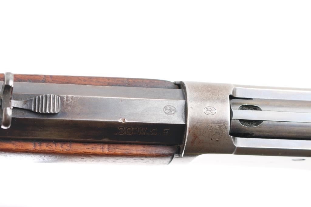 Vintage lever action rifle manufactured circa 1915. Chambered in 38-40. Features 24-1/4" half- round half-octagon barrel, full length magazine tube, dovetailed blade front sight with set screw, adjustable sporting rear sight, Marble's folding adjustable rear tang peep sight, smooth walnut forend & straight wristed buttstock, steel crescent buttplate. Bore is good to very good bright condition with some frosting, tiny pits throughout. Retains 10% original original blued finish, some retained in protected areas, some on barrel flats. Metal shows majority coverage of smooth brown patina color, some gray tones, with edge losses, thinning where handled. Wood is very good, possibly lightly sanded, thin varnish finish, shows small dents and dings, oil staining where wood touches metal. Markings are sharp. Action is smooth. Small numbers (looks like someone's SocSec#) marked on bottom of lever with electric pencil. Condition is NRA Very Good *** C&R Firearm ***