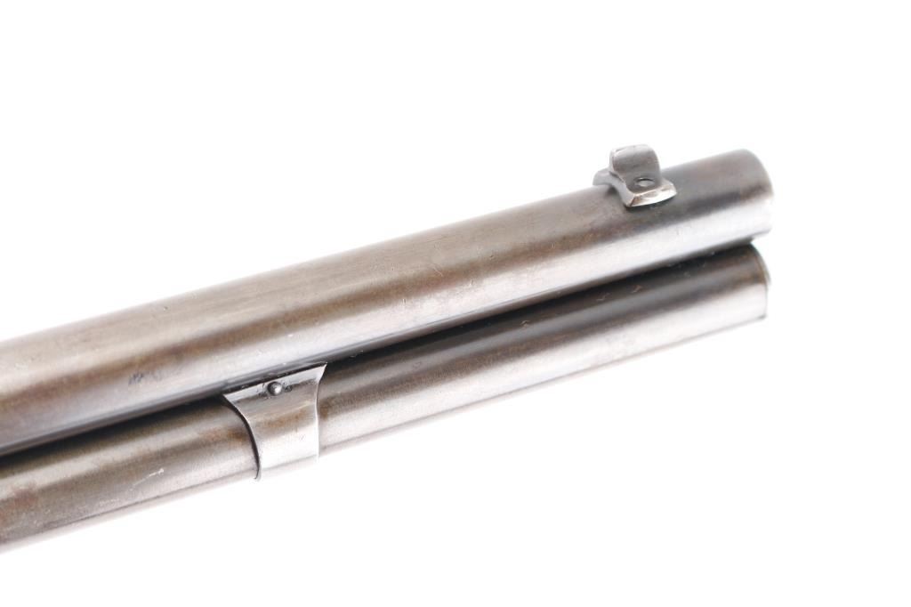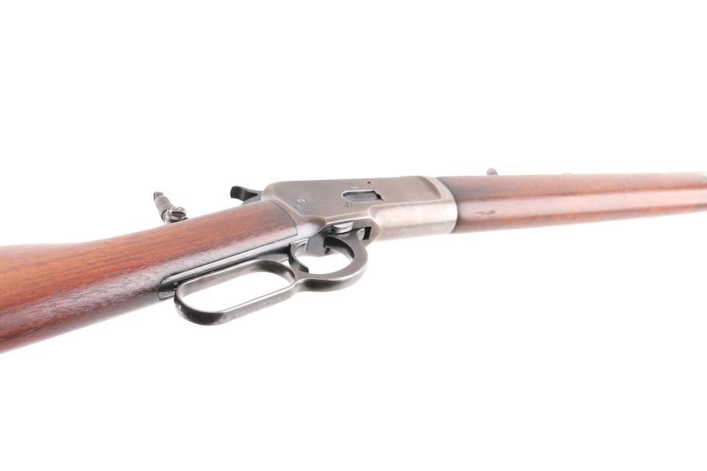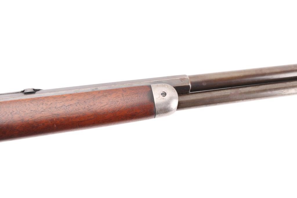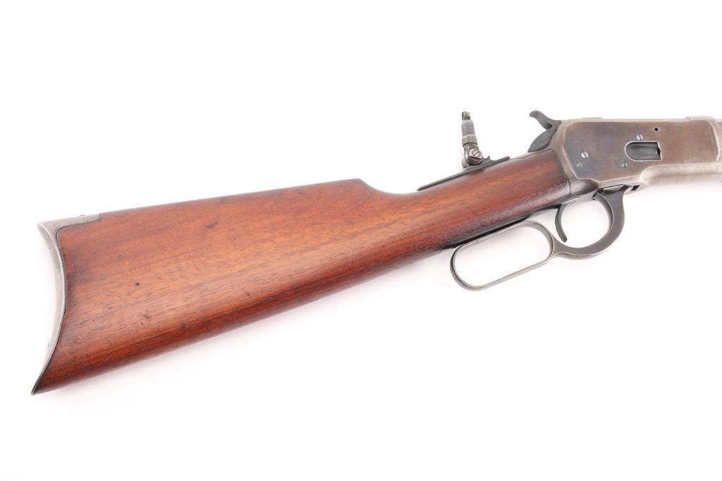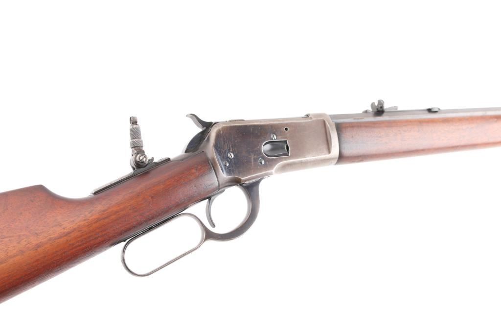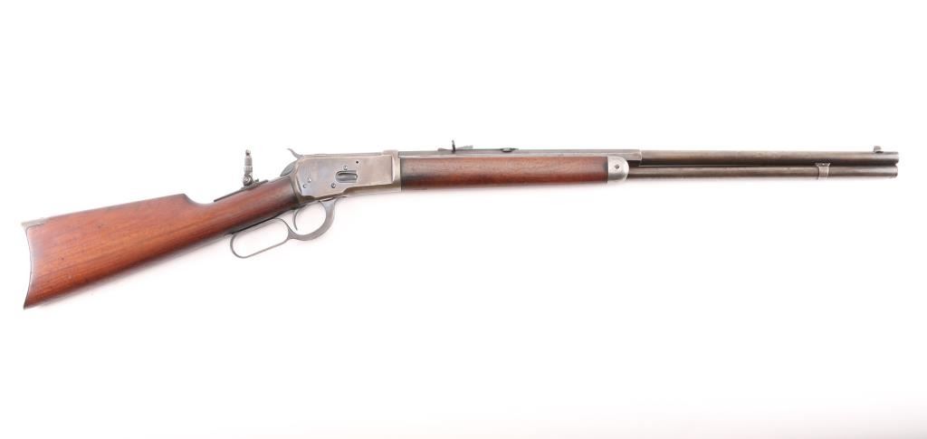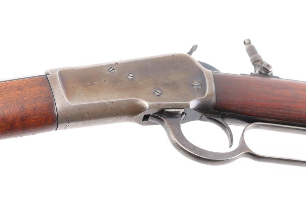 Vintage lever action rifle manufactured circa 1915. Chambered in 38-40. Features 24-1/4" half- round half-octagon barrel, full length magazine tube, dovetailed blade front sight with set screw, adjustable sporting rear sight, Marble's folding adjustable rear tang peep sight, smooth walnut forend & straight wristed buttstock, steel crescent buttplate. Bore is good to very good bright condition with some frosting, tiny pits throughout. Retains 10% original original blued finish, some retained in protected areas, some on barrel flats. Metal shows majority coverage of smooth brown patina color, some gray tones, with edge losses, thinning where handled. Wood is very good, possibly lightly sanded, thin varnish finish, shows small dents and dings, oil staining where wood touches metal. Markings are sharp. Action is smooth. Small numbers (looks like someone's SocSec#) marked on bottom of lever with electric pencil. Condition is NRA Very Good *** C&R Firearm ***