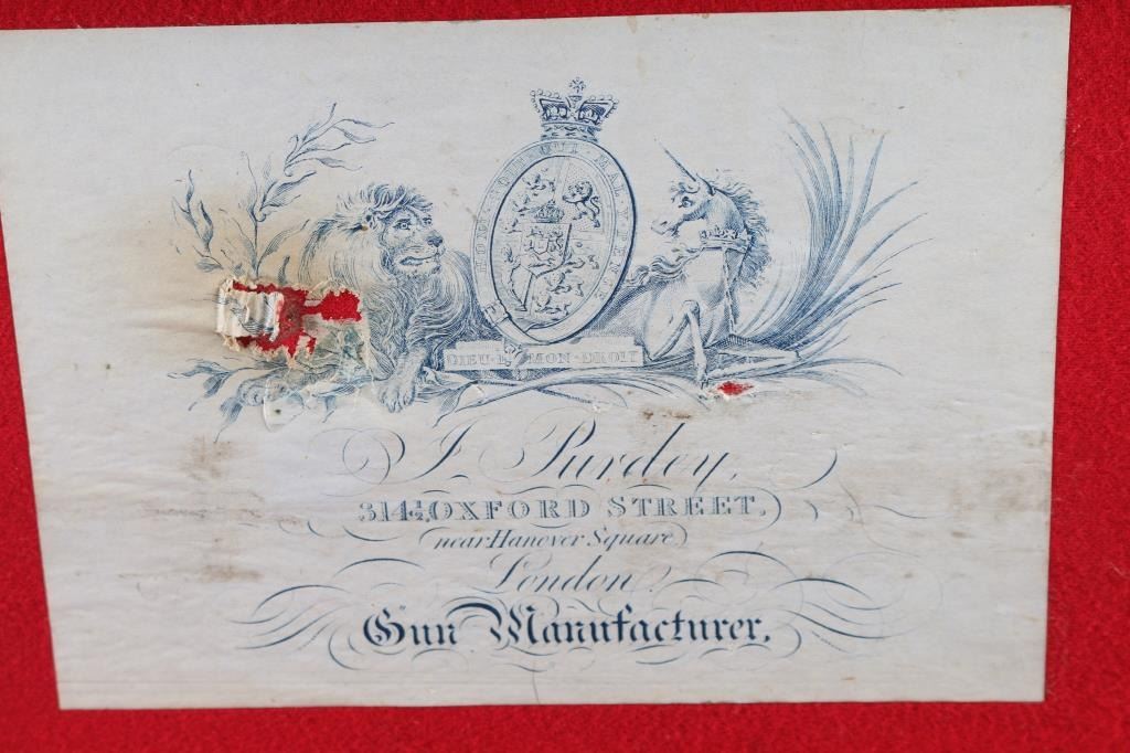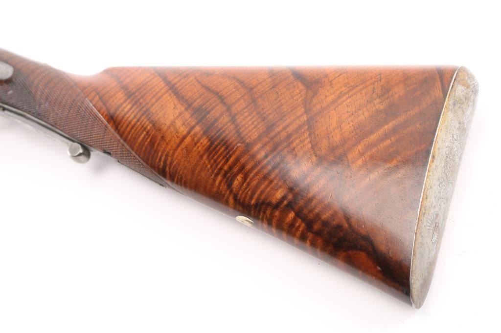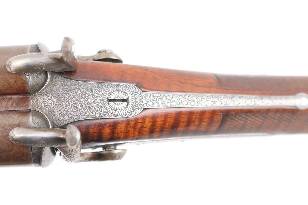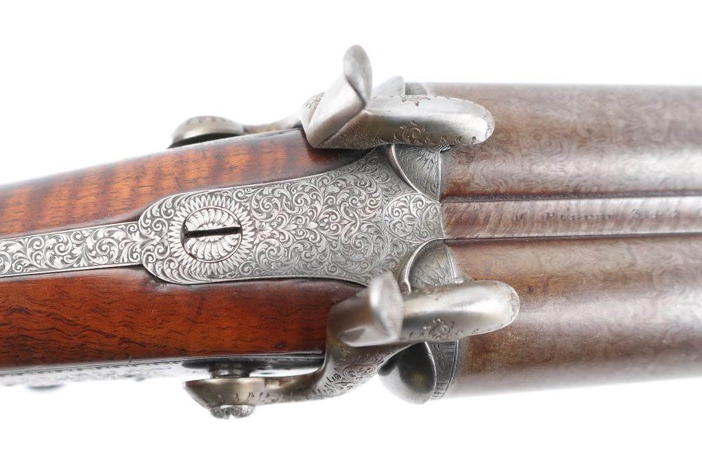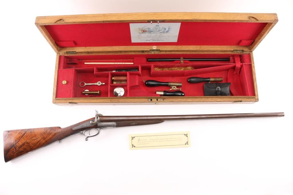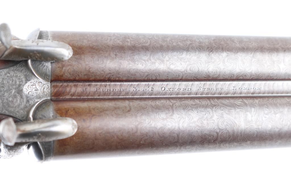 Property of Capt. Francis Hall. Exceptional James Purdey 12 gauge double barreled pinfire shotgun with rare grip safety, in its original wooden case with tools and loading equipment. Ebony handled tools includes makers G&J Hawksley, W. Bartram. Purdey marked rib. The barrels are a fine Damascus pattern, and the action and mounts have fine scroll engraving. The serial number is 5943, dating from 1860. Double triggers. The stock is exceptional, with a beautiful grain, with fine checkering at the wrist and on the forend. The barrels have turned a brown patina, and the back action locks are bright steel. The case is lined with red felt. The oil bottle is Purdey marked. There is a finely finished cleaning rod in the case. The barrels have Birmingham proofs and are also serial numbered 5943. LOP is 14 1/4". Un-choked bores. The top of the case has inlaid brass circles engraved “Fras. Hall, Park Hall, Mansfield, Notts". Fancy Purdey label is mostly intact. 30" barrels, hammer actions work well, tight lock-up. Bores are good, need cleaned. Stocks are very good. Missing the left hammer screw. Captain Francis Hall who was born in 1805 in Glasgow where his father was at that time in command of the Northern District. Coming from a family of soldiers it seemed obvious that Francis would join the Army and he served with the 7th Hussars, for seven years mainly in Ireland. After an accident when he fell from his horse which laid him up for several months, he felt compelled to leave the Service and at that time his rank was that of Captain. He married Mary Ann Bilbie on 1st March 1832. Census records shows that they were living at Park Hall, Mansfield, Nottingham. Great History. From the Lawrence P. Shelton Collection. NRA Condition-Very Good. Antique Firearm.