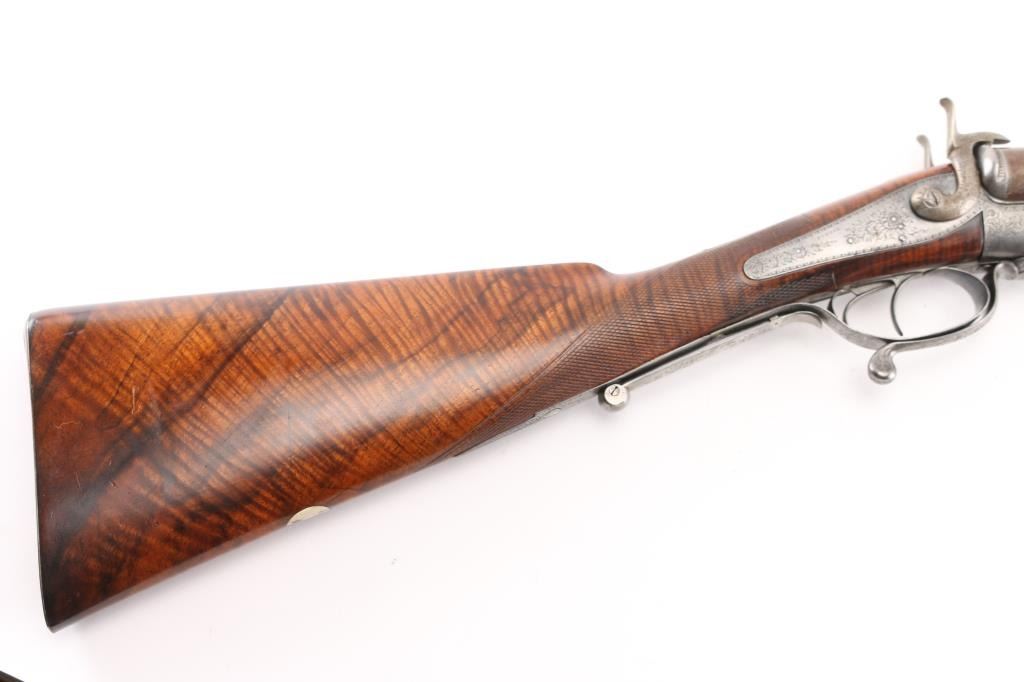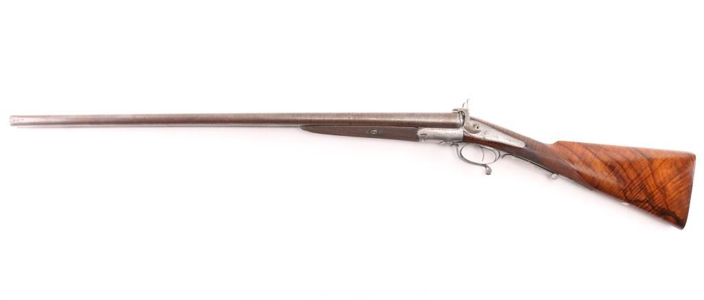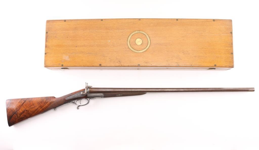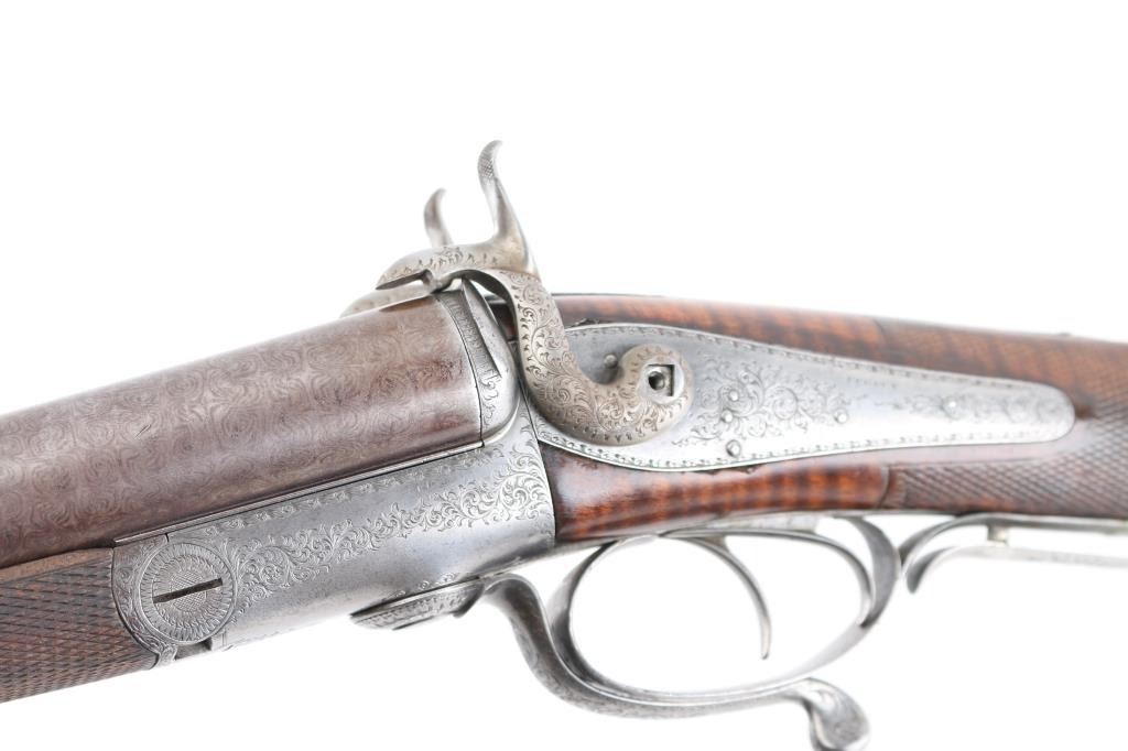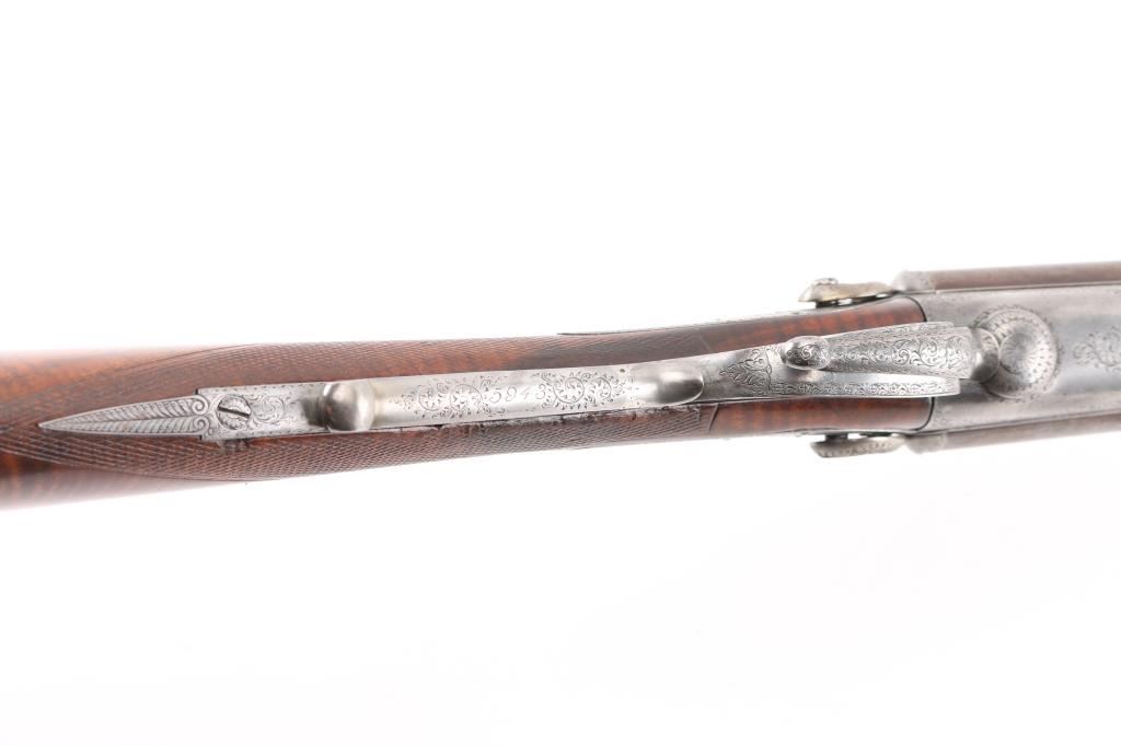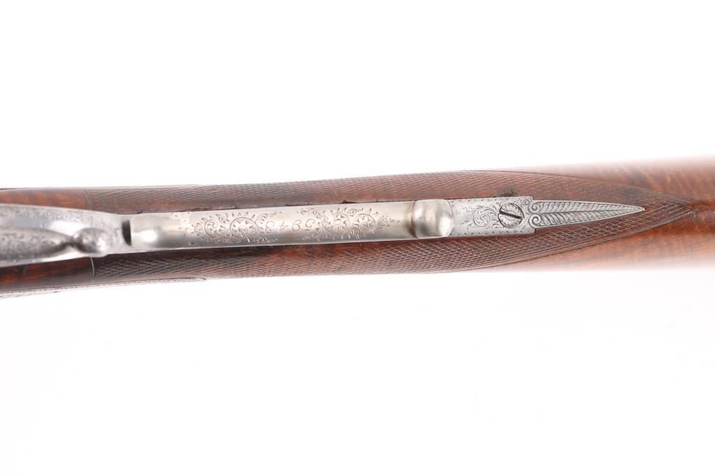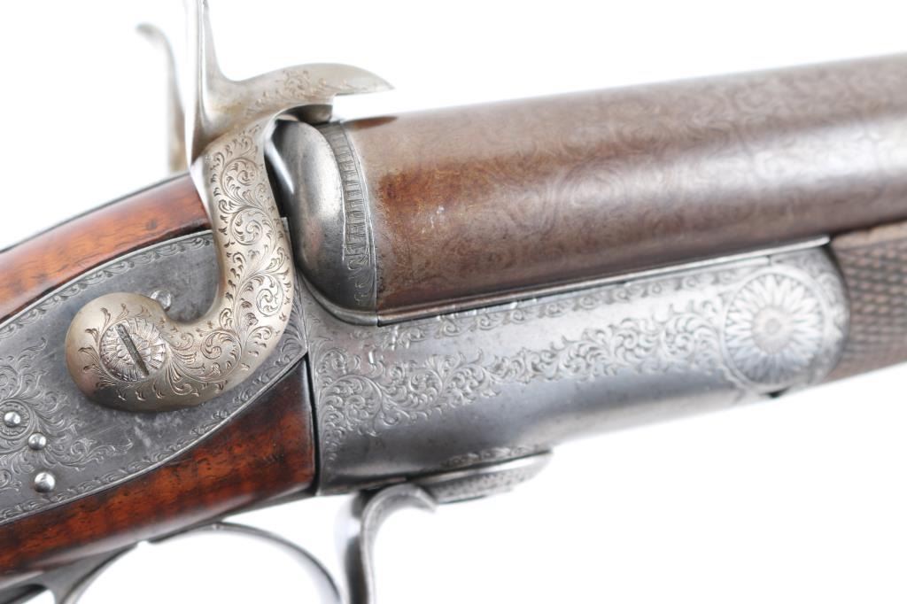 Property of Capt. Francis Hall. Exceptional James Purdey 12 gauge double barreled pinfire shotgun with rare grip safety, in its original wooden case with tools and loading equipment. Ebony handled tools includes makers G&J Hawksley, W. Bartram. Purdey marked rib. The barrels are a fine Damascus pattern, and the action and mounts have fine scroll engraving. The serial number is 5943, dating from 1860. Double triggers. The stock is exceptional, with a beautiful grain, with fine checkering at the wrist and on the forend. The barrels have turned a brown patina, and the back action locks are bright steel. The case is lined with red felt. The oil bottle is Purdey marked. There is a finely finished cleaning rod in the case. The barrels have Birmingham proofs and are also serial numbered 5943. LOP is 14 1/4". Un-choked bores. The top of the case has inlaid brass circles engraved “Fras. Hall, Park Hall, Mansfield, Notts". Fancy Purdey label is mostly intact. 30" barrels, hammer actions work well, tight lock-up. Bores are good, need cleaned. Stocks are very good. Missing the left hammer screw. Captain Francis Hall who was born in 1805 in Glasgow where his father was at that time in command of the Northern District. Coming from a family of soldiers it seemed obvious that Francis would join the Army and he served with the 7th Hussars, for seven years mainly in Ireland. After an accident when he fell from his horse which laid him up for several months, he felt compelled to leave the Service and at that time his rank was that of Captain. He married Mary Ann Bilbie on 1st March 1832. Census records shows that they were living at Park Hall, Mansfield, Nottingham. Great History. From the Lawrence P. Shelton Collection. NRA Condition-Very Good. Antique Firearm.