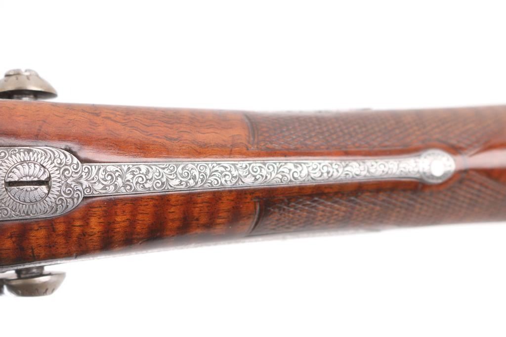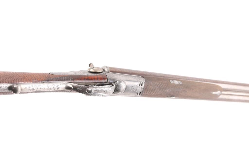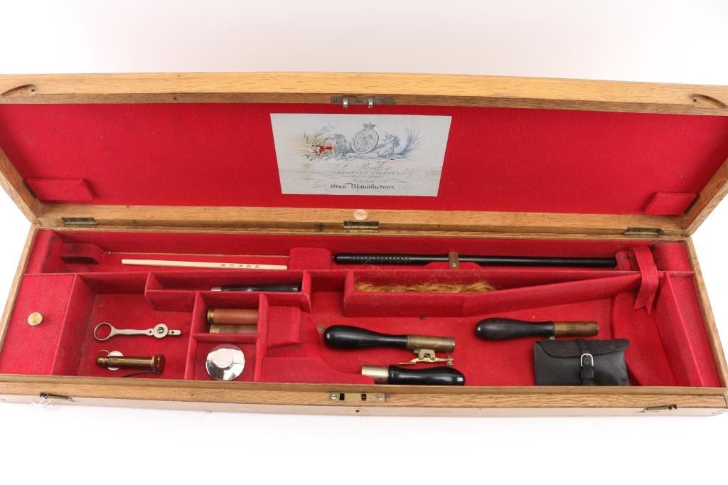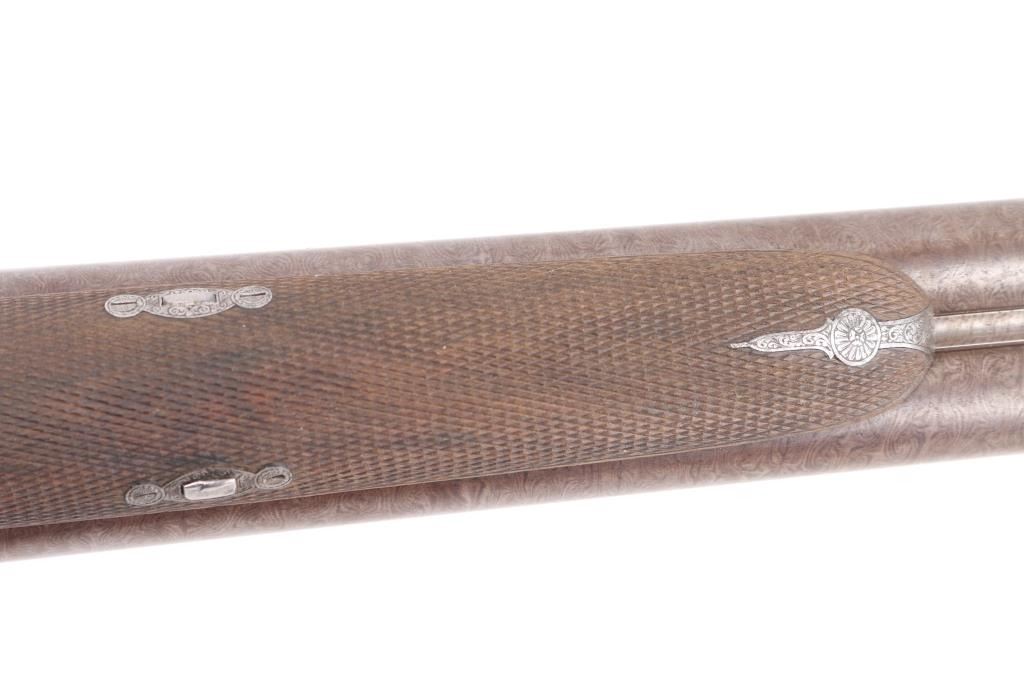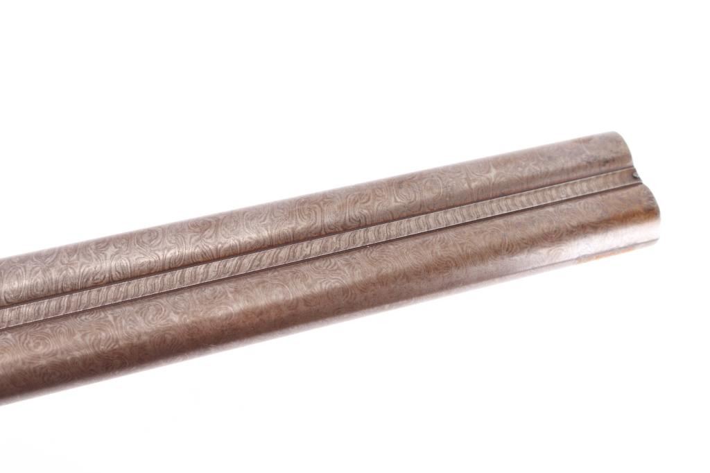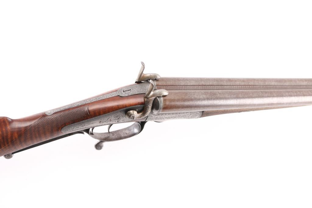 Property of Capt. Francis Hall. Exceptional James Purdey 12 gauge double barreled pinfire shotgun with rare grip safety, in its original wooden case with tools and loading equipment. Ebony handled tools includes makers G&J Hawksley, W. Bartram. Purdey marked rib. The barrels are a fine Damascus pattern, and the action and mounts have fine scroll engraving. The serial number is 5943, dating from 1860. Double triggers. The stock is exceptional, with a beautiful grain, with fine checkering at the wrist and on the forend. The barrels have turned a brown patina, and the back action locks are bright steel. The case is lined with red felt. The oil bottle is Purdey marked. There is a finely finished cleaning rod in the case. The barrels have Birmingham proofs and are also serial numbered 5943. LOP is 14 1/4". Un-choked bores. The top of the case has inlaid brass circles engraved “Fras. Hall, Park Hall, Mansfield, Notts". Fancy Purdey label is mostly intact. 30" barrels, hammer actions work well, tight lock-up. Bores are good, need cleaned. Stocks are very good. Missing the left hammer screw. Captain Francis Hall who was born in 1805 in Glasgow where his father was at that time in command of the Northern District. Coming from a family of soldiers it seemed obvious that Francis would join the Army and he served with the 7th Hussars, for seven years mainly in Ireland. After an accident when he fell from his horse which laid him up for several months, he felt compelled to leave the Service and at that time his rank was that of Captain. He married Mary Ann Bilbie on 1st March 1832. Census records shows that they were living at Park Hall, Mansfield, Nottingham. Great History. From the Lawrence P. Shelton Collection. NRA Condition-Very Good. Antique Firearm.