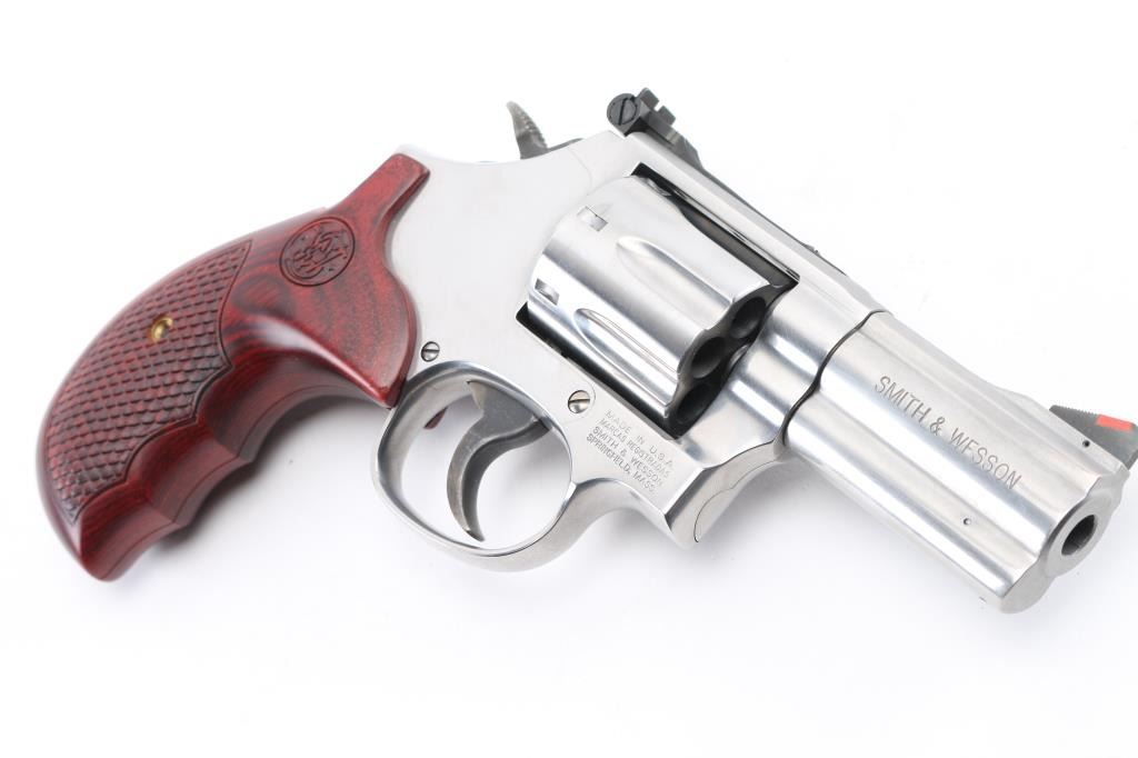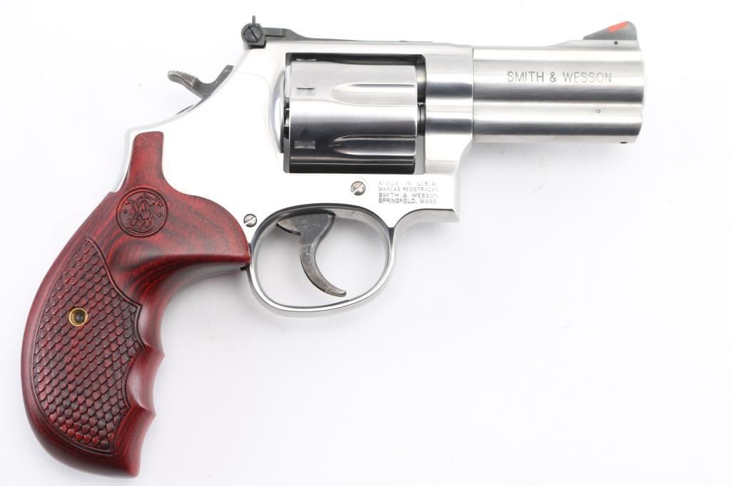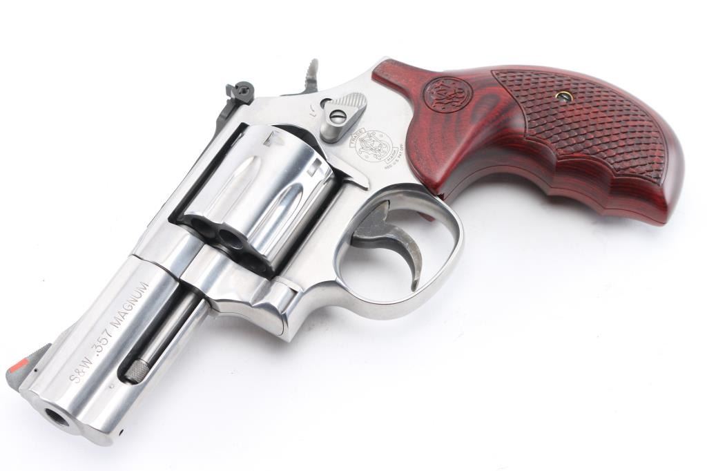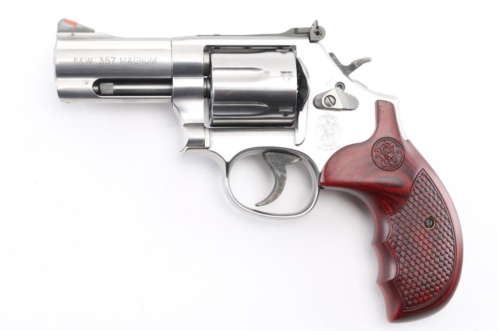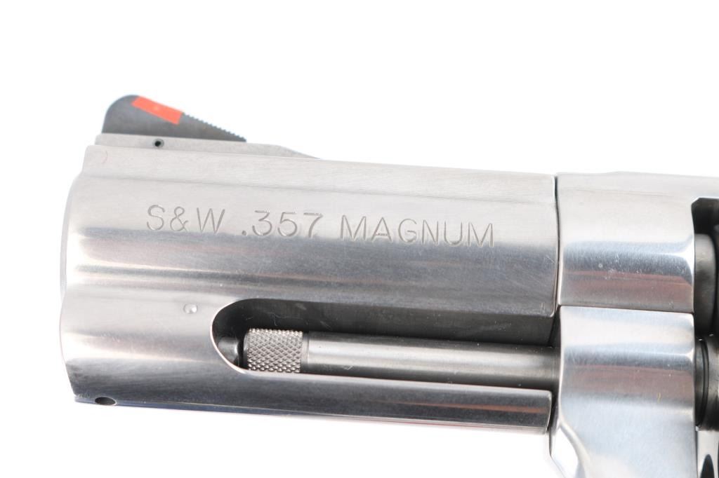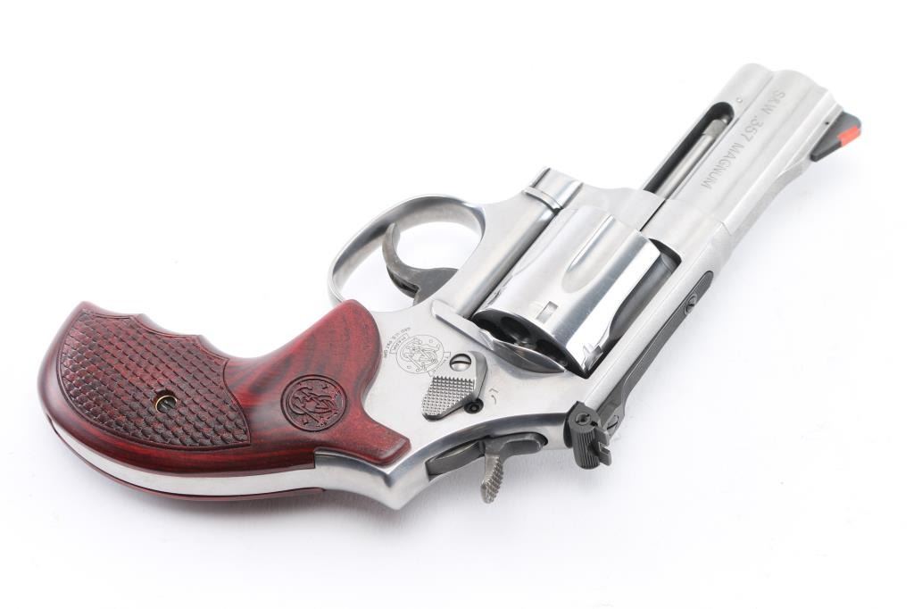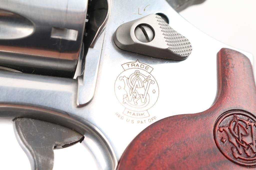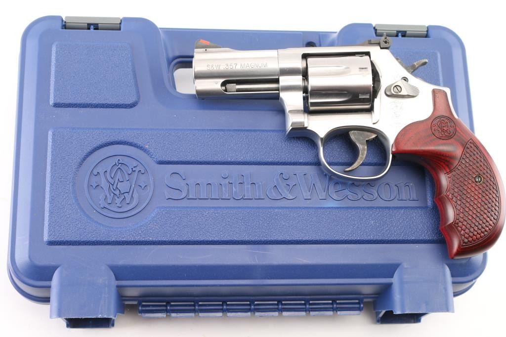 The "Distinguished Combat Magnum" American made six shot revolver chambered for .357 Magnum ammunition. Built on the L target frame. It features stainless steel construction with a 3" barrel, fluted cylinder, full underlug, smooth trigger, pinned serrated front sight, with orange insert, adjustable rear sight on serrated sighting rib, knurled hammer spur and cylinder release, smooth trigger. rosewood checkered walnut grips with S&W logos. Metal finish looks very good with minor scuffs/scratches, and a faint drag line on the cylinder. Bore is excellent/bright. Action is smooth with tight lock-up. Grips are excellent. Comes with original blue factory hard case with manual, lock, and security lock keys. Condition is NRA Very Good+ Modern Firearm.