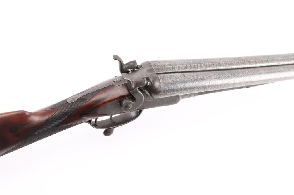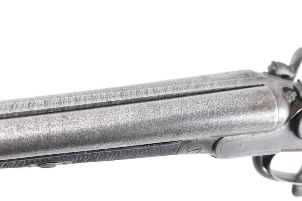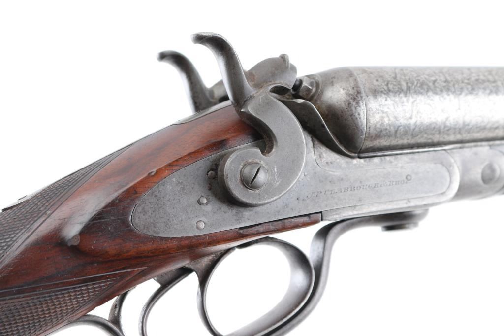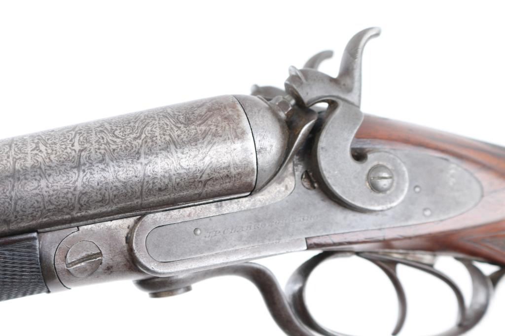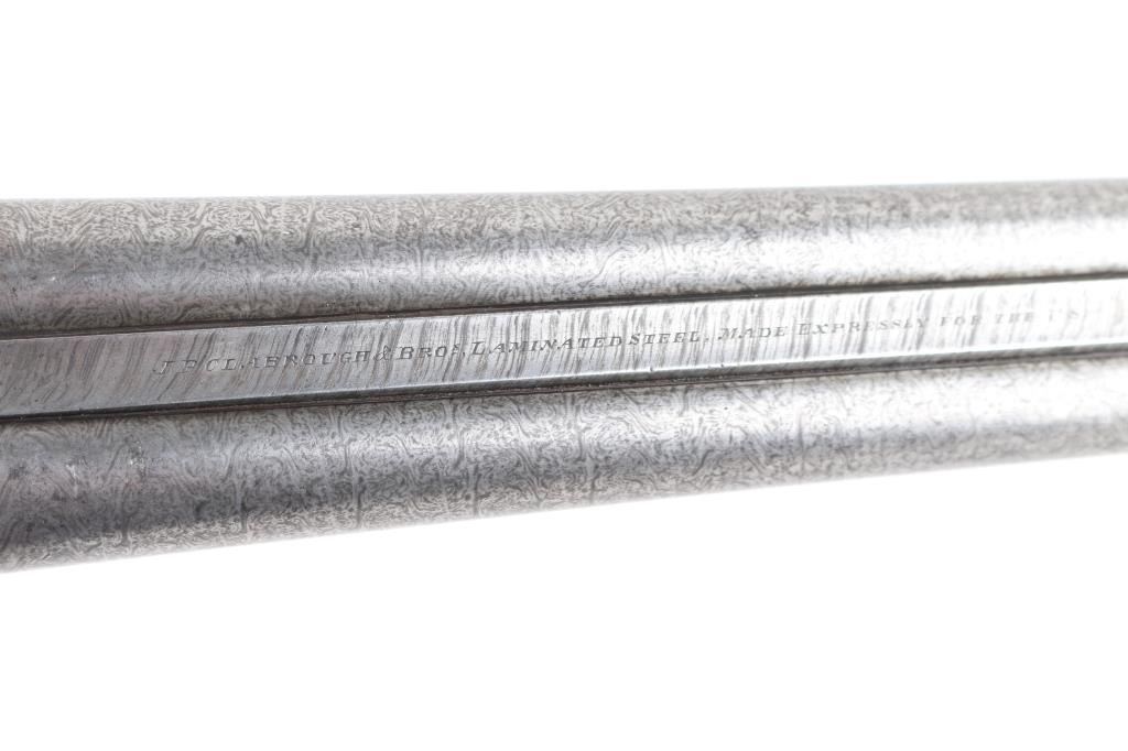 Clabrough exposed hammers shotgun with very rare mark of "J.P. Clabrough & Bros. Laminated steel Made expressly for the U.S." on rib, no serial number. A renowned Birmingham gun-making firm, which was in operation both in England and in California. The Damascus barrels are 33" with a 14 1/4" LOP. Both locks are engraved "J P Clabrough & Bros". As to condition, the barrels show a nice even gray/ brown Damascus finish. The bores are dark, pitted. 12 GA un-choked barrels. Side locks show mostly grey coloring. Straight wrist stock, & forearm are checkered, steel buttplate, wood is very good with nice dark grain, double triggers, one cock hammer action is crisp/tight. From the Lawrence P. Shelton collection, who authored the book "J.P. Clabrough, Birmingham Gunmaker" NRA Condition-Good. Antique Firearm.
