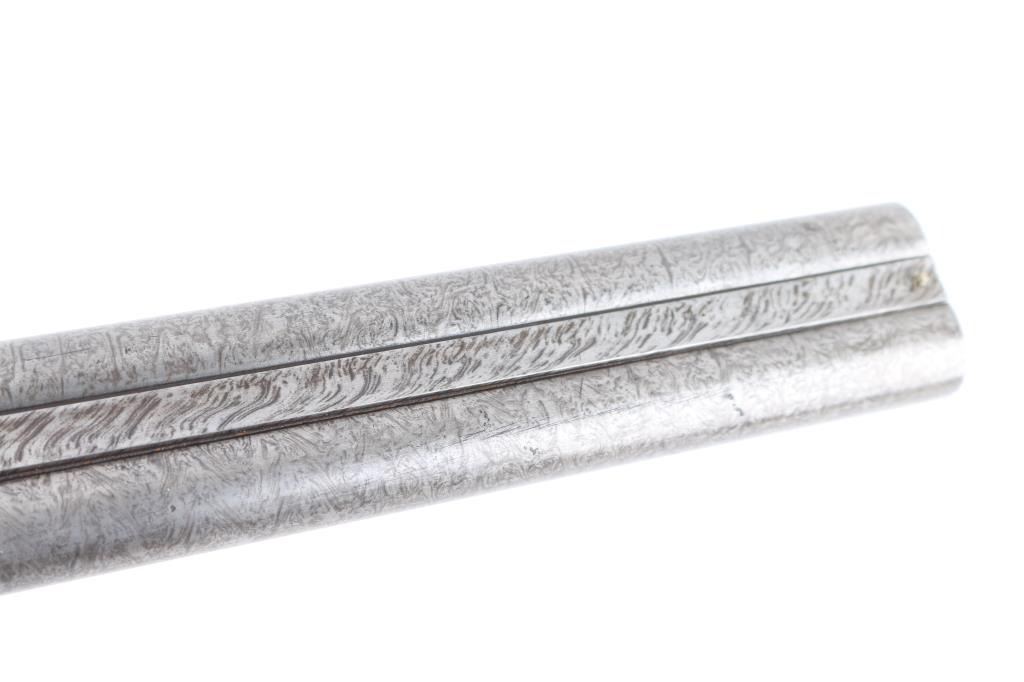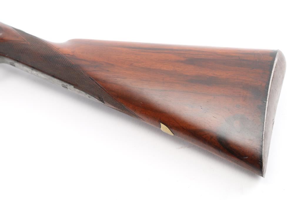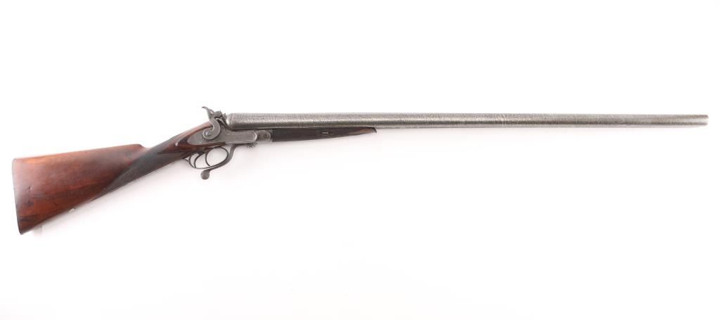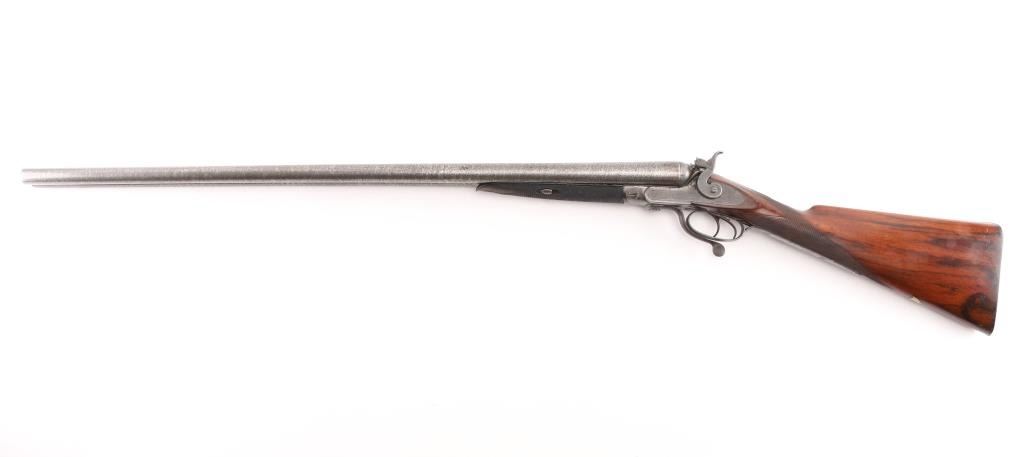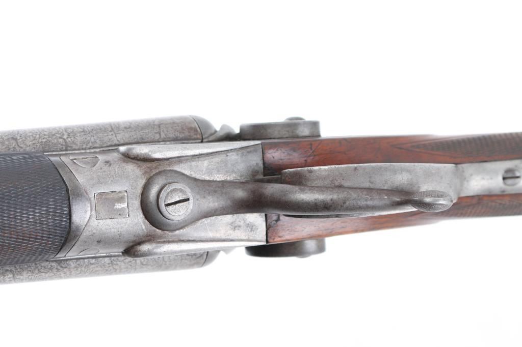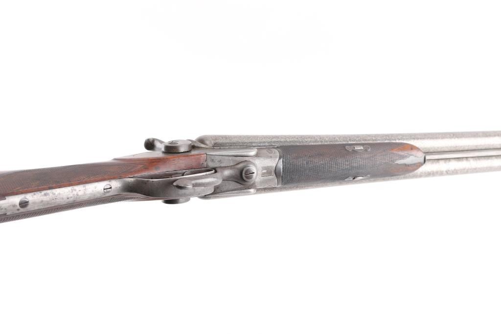 Clabrough exposed hammers shotgun with very rare mark of "J.P. Clabrough & Bros. Laminated steel Made expressly for the U.S." on rib, no serial number. A renowned Birmingham gun-making firm, which was in operation both in England and in California. The Damascus barrels are 33" with a 14 1/4" LOP. Both locks are engraved "J P Clabrough & Bros". As to condition, the barrels show a nice even gray/ brown Damascus finish. The bores are dark, pitted. 12 GA un-choked barrels. Side locks show mostly grey coloring. Straight wrist stock, & forearm are checkered, steel buttplate, wood is very good with nice dark grain, double triggers, one cock hammer action is crisp/tight. From the Lawrence P. Shelton collection, who authored the book "J.P. Clabrough, Birmingham Gunmaker" NRA Condition-Good. Antique Firearm.