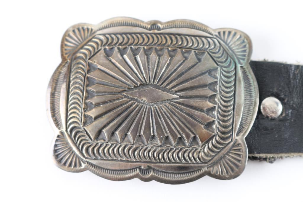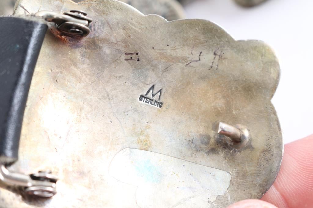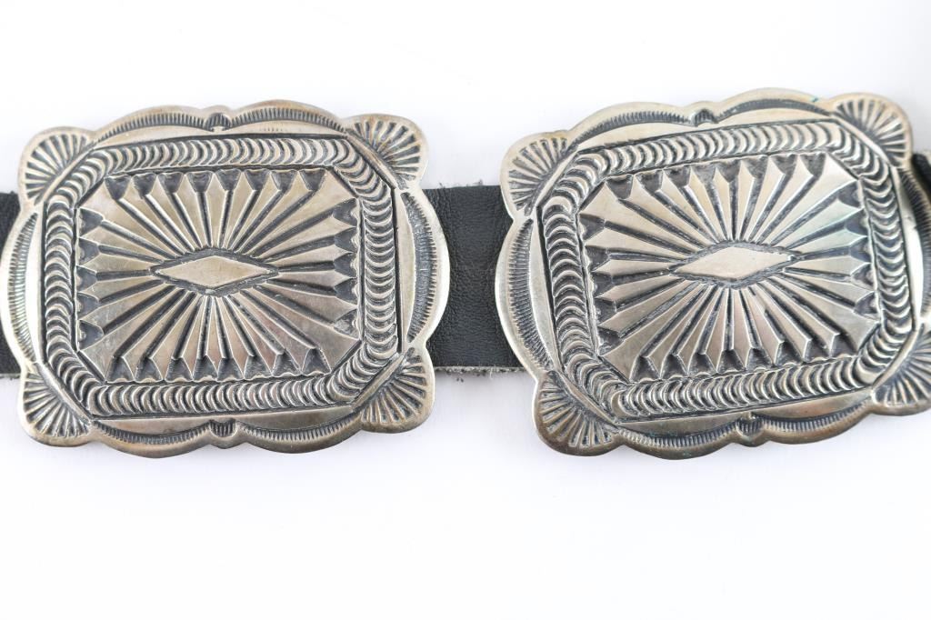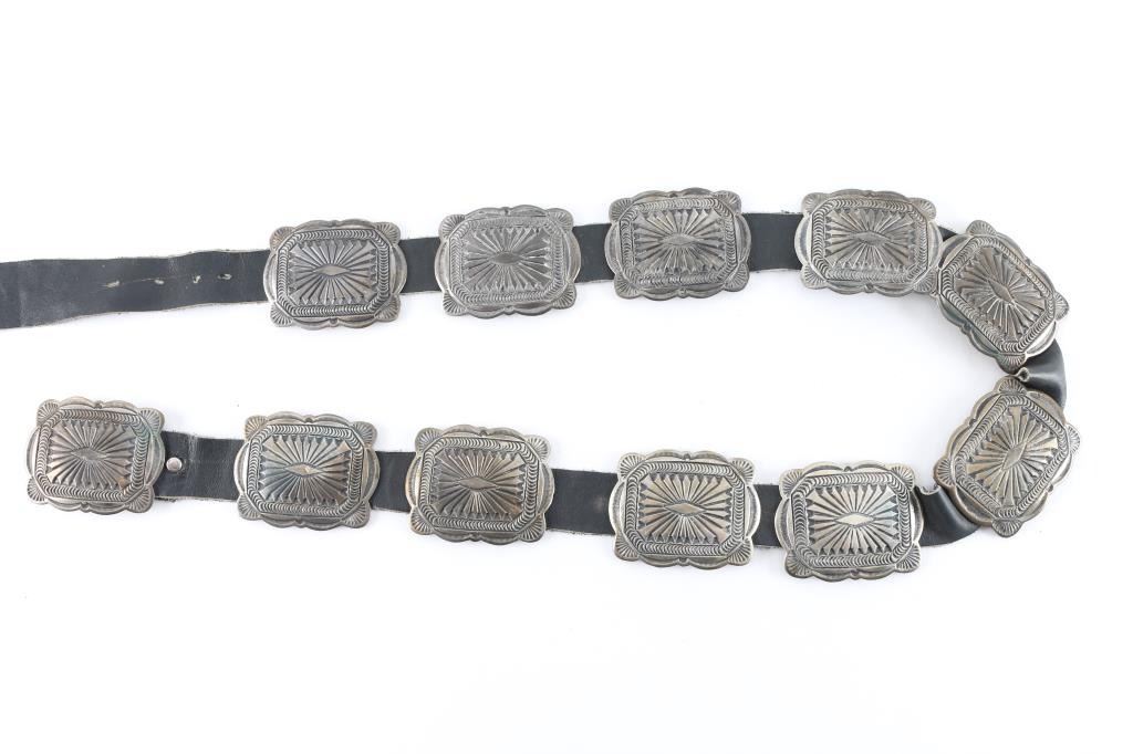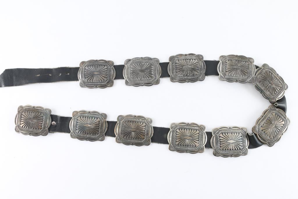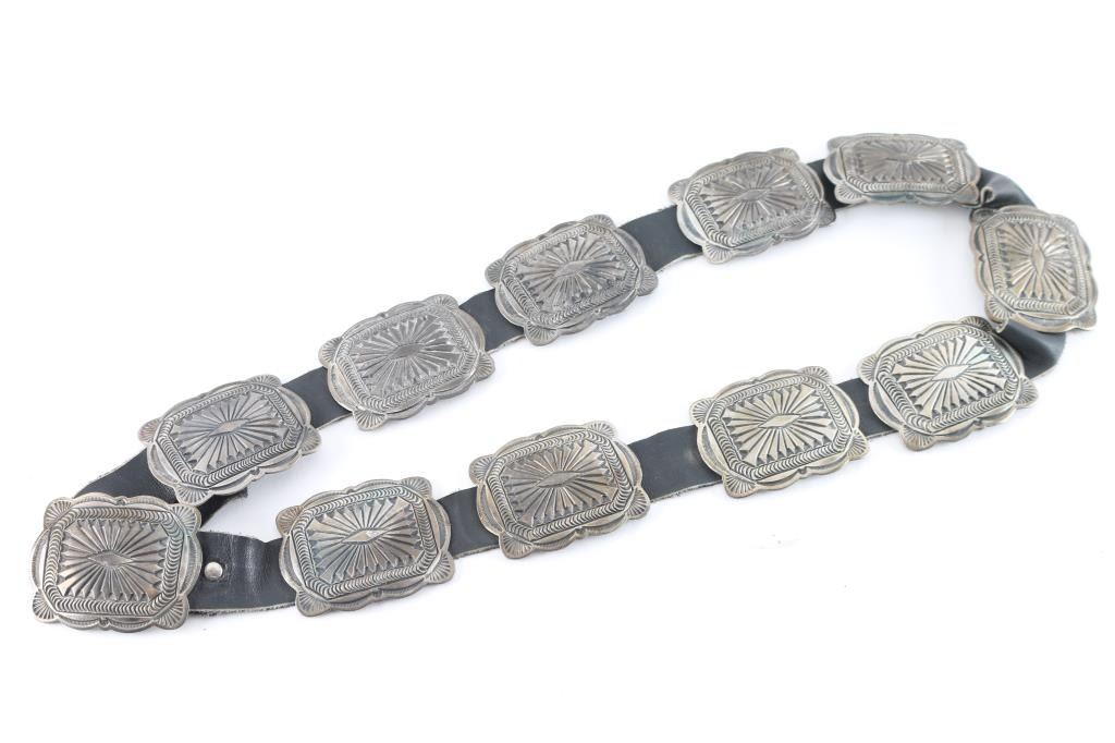 11 Sterling silver conchos on black leather belt, measures 42" end to end. Maker marked "M".