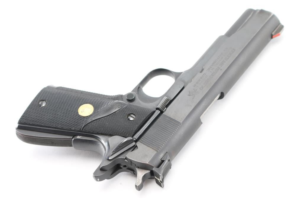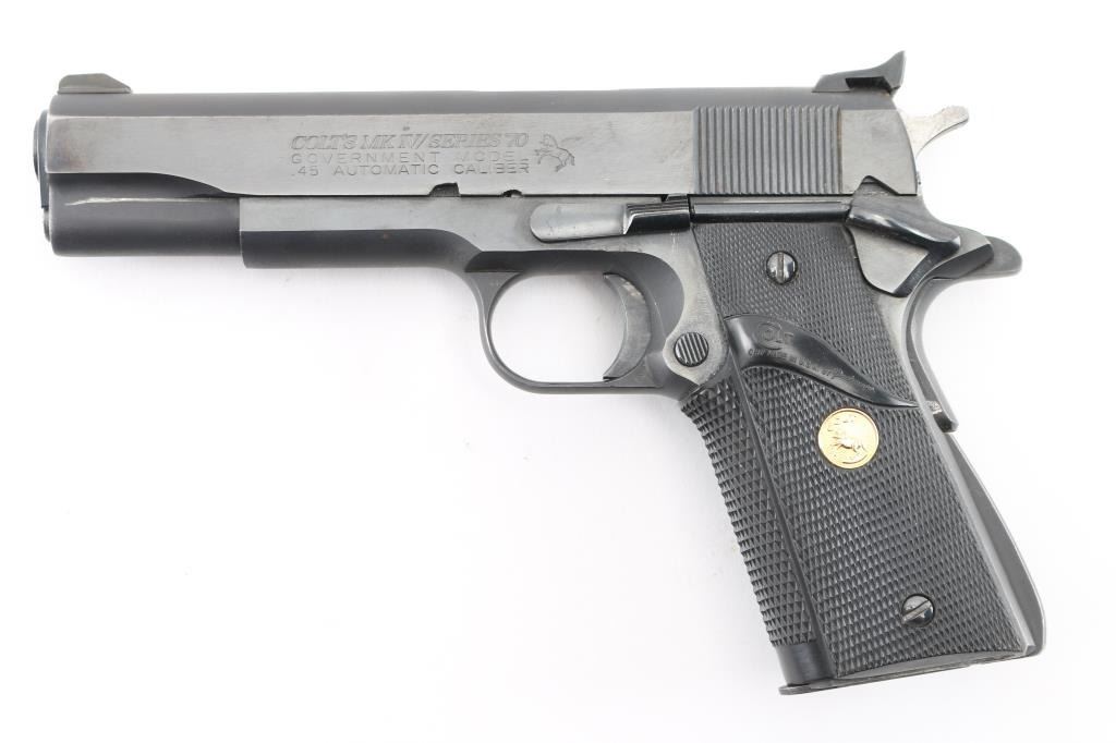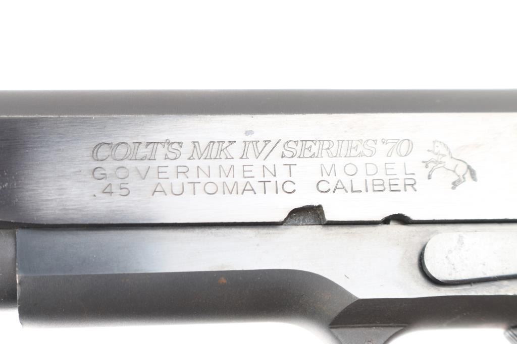 'MK IV/Series 70' 1911A1 pattern single action semi-automatic pistol manufactured circa 1982. Features matte blued finish with bright polished sides, 5" barrel, ramp front sight with orange painted center groove, square notch rear sight extended just past rear of slide (look like Millet sights), grooved trigger, serrated hammer spur, thumb safety on the left side of the frame, grip safety, push button magazine release, steel frame, serrated arched mainspring housing, Pachmayr black rubber wrap-around grips with gold color Colt medallions. Bore is very good condition. Retains 85% finish with handling marks, edge losses, a few scattered spots of pinprick patina or rust, light rust on sides of hammer. Grips are very good condition. Includes (1) Colt magazine. Condition is NRA Good++ *** Modern Firearm ***