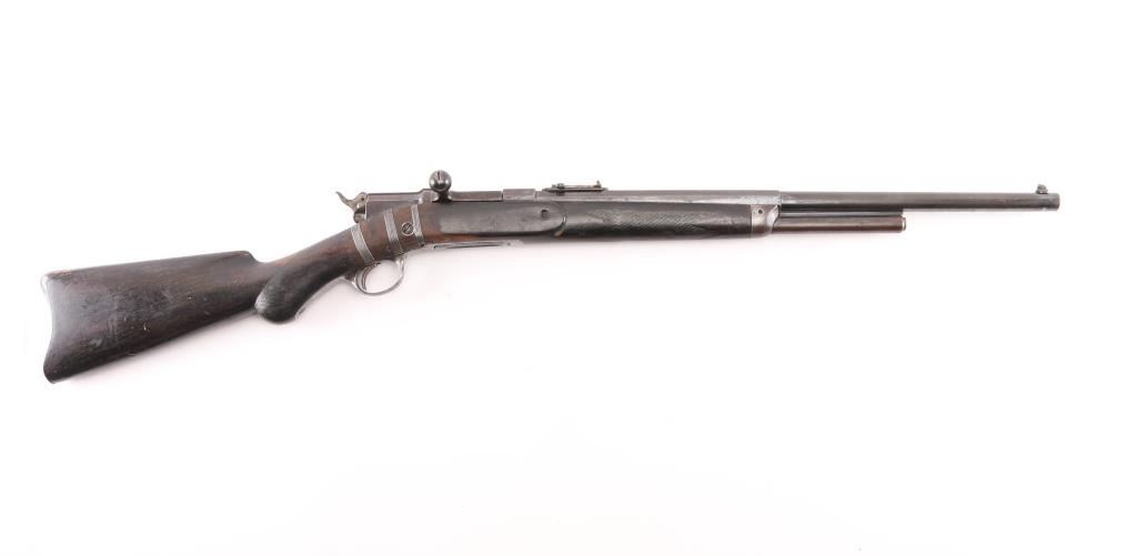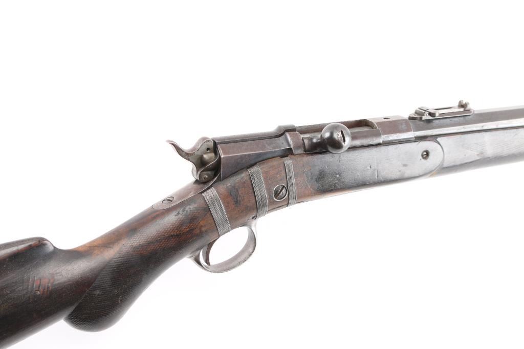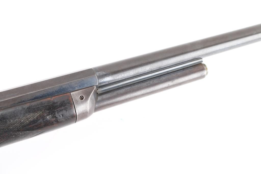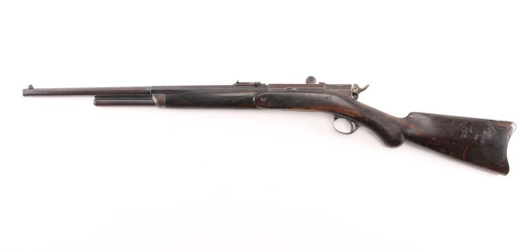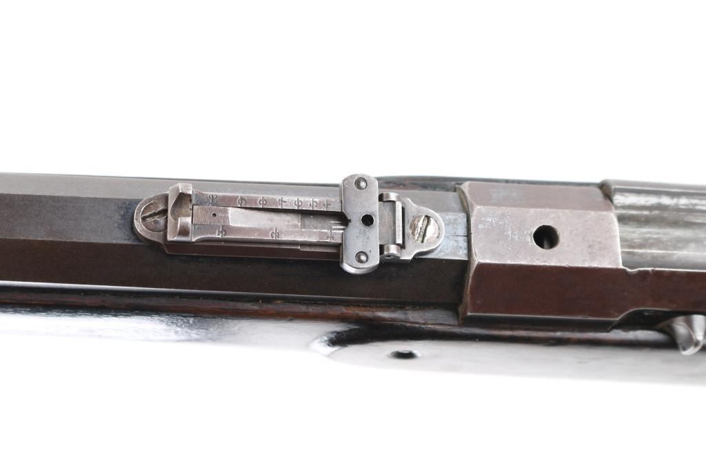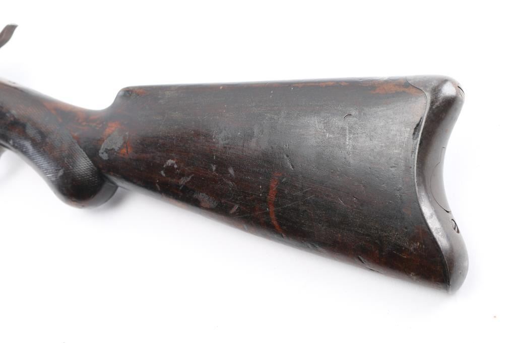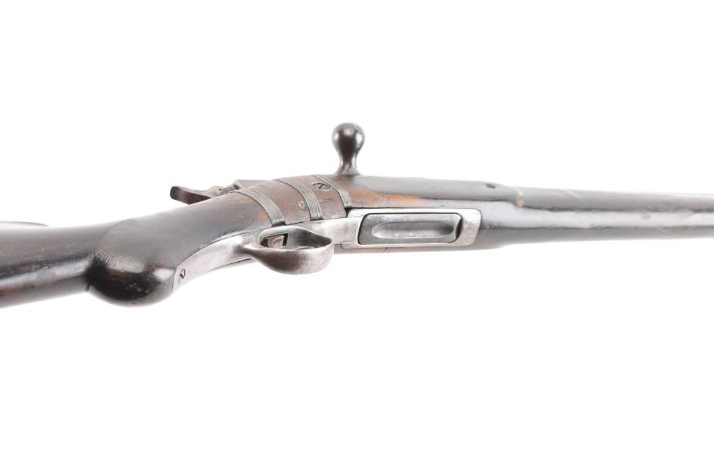 Antique bolt action rifle manufactured circa 1877-1888. Features 21" half round half octagon barrel, half length magazine tube under barrel, half length wood stock, blade front sight, flip-up ladder type rear sight, magazine cutoff lever, external hammer. Per most sources, the hammer must be manually cocked for each shot, however this rifle cocks the hammer when working the bolt. The external portion (hammer spur) should be connected to the inside portion with a pin, which is absent. The half length magazine tube may be a modification, and some solder residue under the muzzle (with double dimples on sides at this same location) might indicate a bracket location for a previously longer tube. Also, the barrel length appears to be too short for a factory length. Retains 30% original blued finish, with much faded color, patina, some bare metal. Stock features smooth steel semi-crescent buttplate with trap door, checkered Prince of Wales shaped grip, checkered forend. Stock shows signs of heavy use with many small dents and scratches, some small cracks, and three areas of steel wire wrap as repair on right side near bolt. Bore is fair condition, dark & lightly pitted throughout, with sharply defined rifling remaining. Magazine cutoff lever does not appear to work correctly. Action operates smoothly and appears functional, although the lack of a pin thru the hammer allows the spur to rotate and dig into the stock wrist. Three line address & patent marking on bolt rear are sharp. Condition is NRA Very Good as modified *** Antique Firearm ***