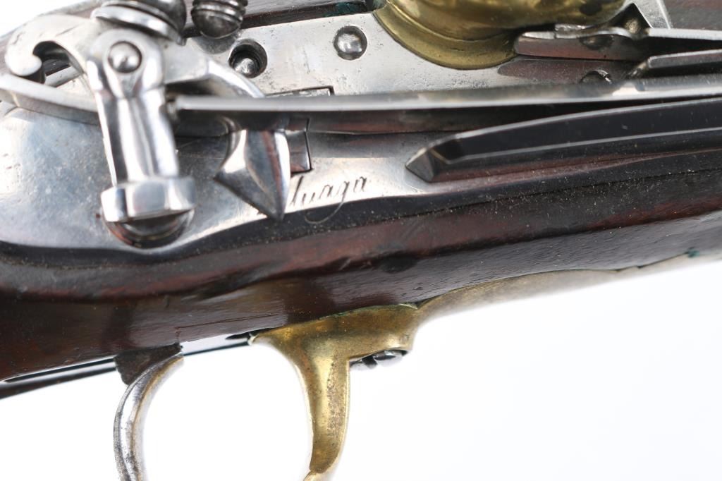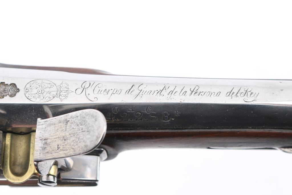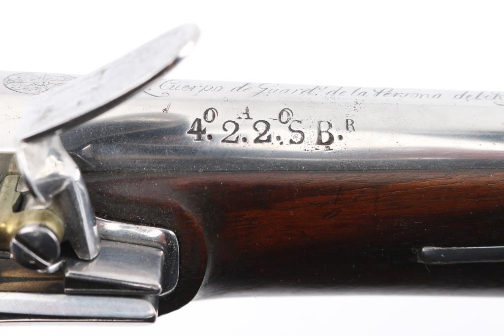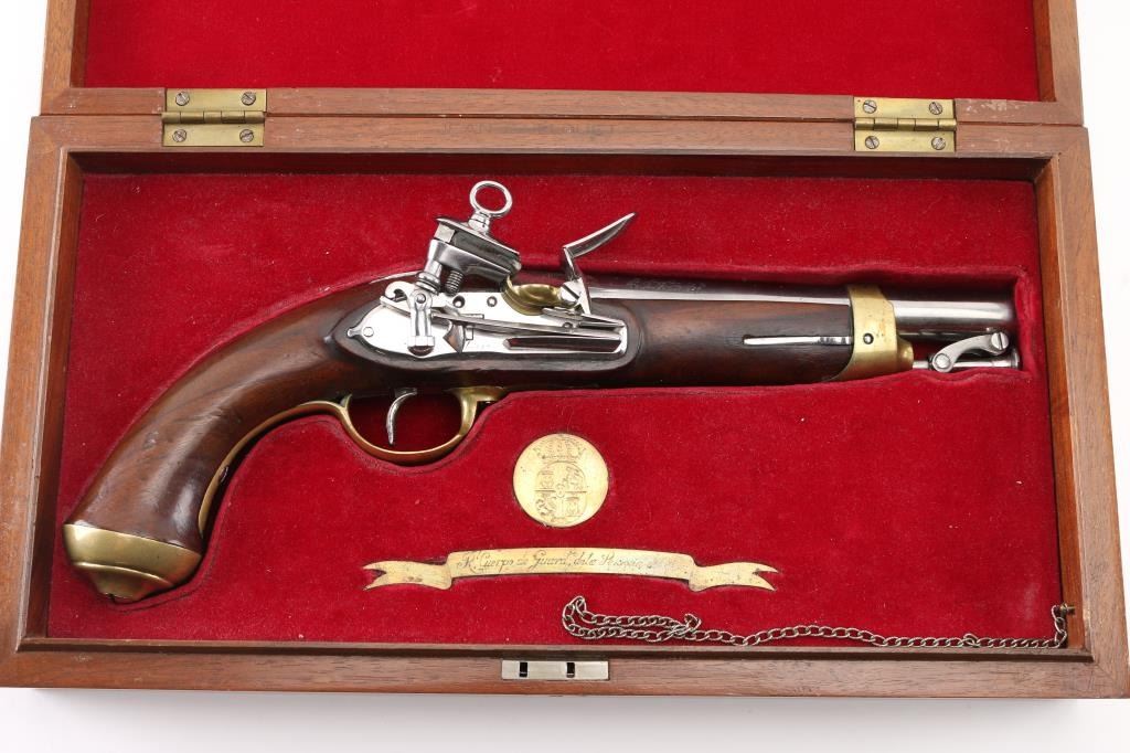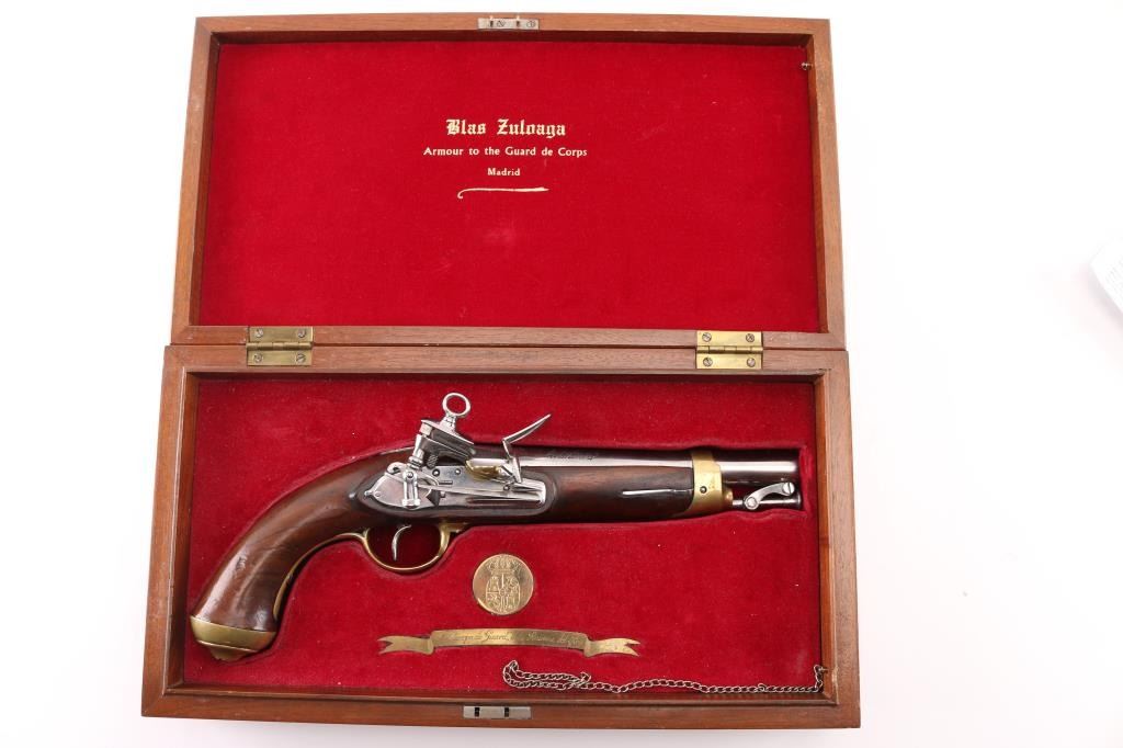 Cal. Signed Zuloaga and engraved on barrel with Spanish Royal Coat of Arms also "R. Cuerpo de Guard, de la Persona del Rey" which translates to Kings Royal Body Guard. Also maker stamped with issue number stamped on side of barrel "OAO/4.2.2.S.B.R." stock cartouched behind tang at top of wrist with Z+ Crown R. Museum quality cleaned to bright metal in European tradition with crisp near fine wood and sharp metal with strong edges. Approximately 69 cal and 14 1/2" overall. Zuluoaga was the greatest of 19th century master gunsmiths receiving international recognition at the Great London Exhibition in 1851. He re-introduced the art of gold damascene metal decoration and directed the Royal Armoury La Moncloa. The pistol is finely cased in select walnut with french-lined red velvet show embossed name and info in lid along with engraved and gold plated brass medallions in bottom of case replicated signature on barrel and Royal Coat of Arms. The casing was expertly made by Jean Calvet of So. California in mid-1970's to early 1980's. Antique firearm.
