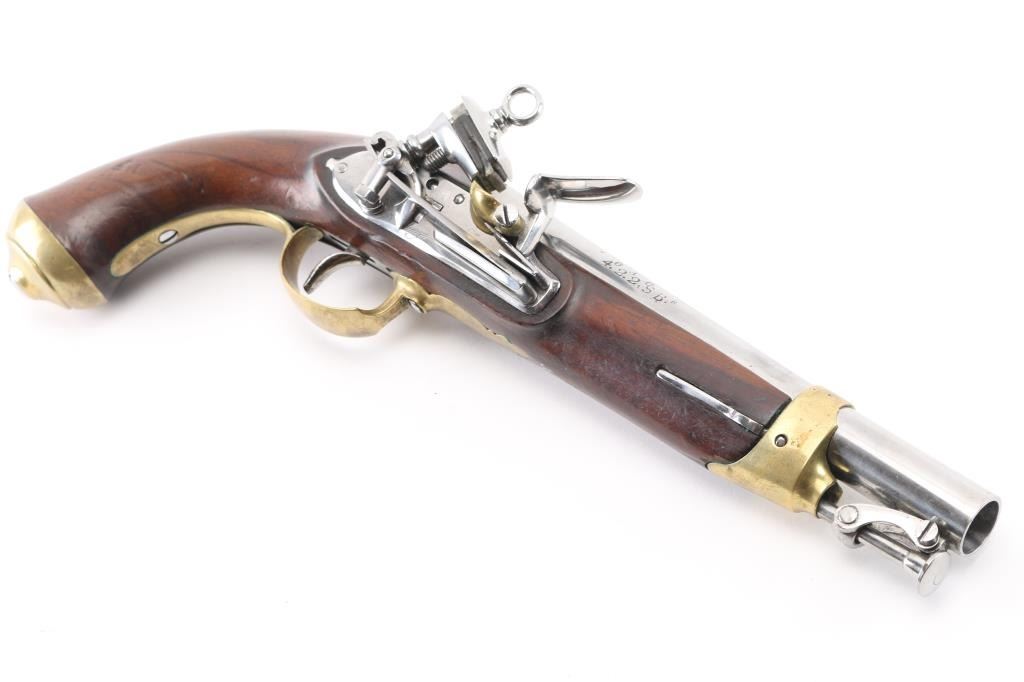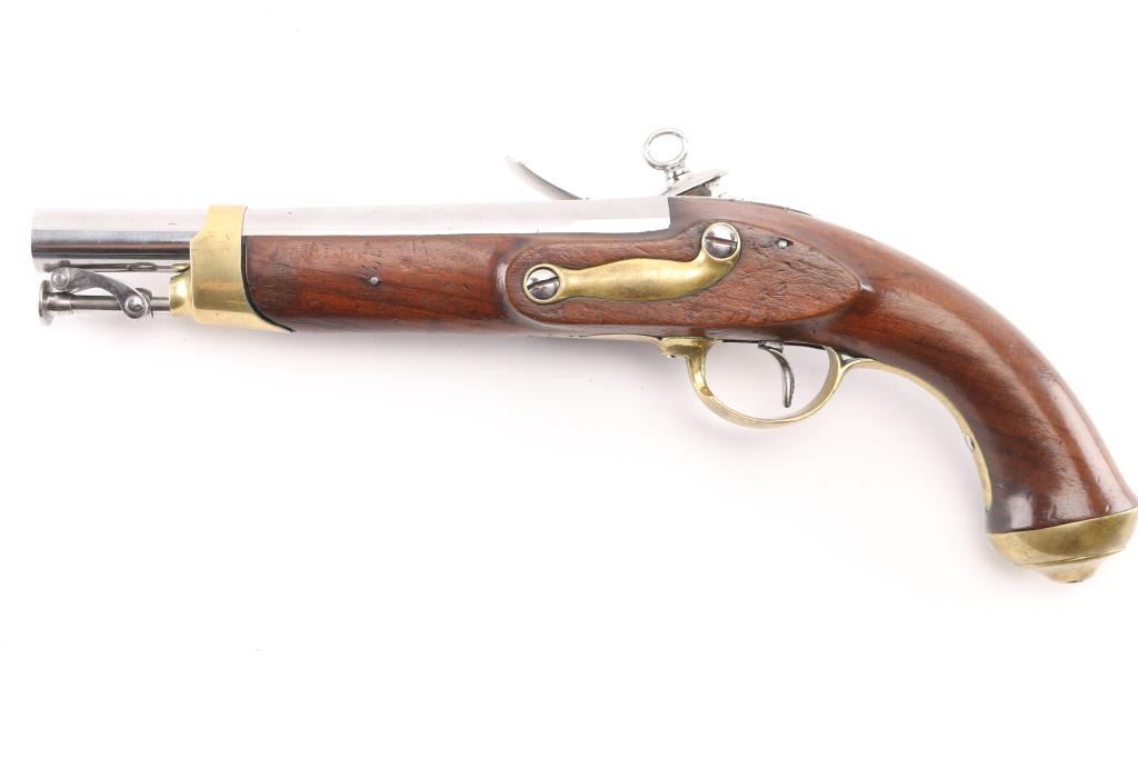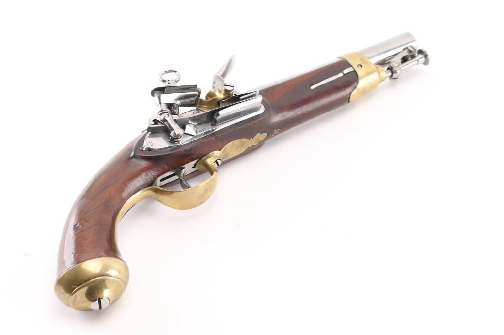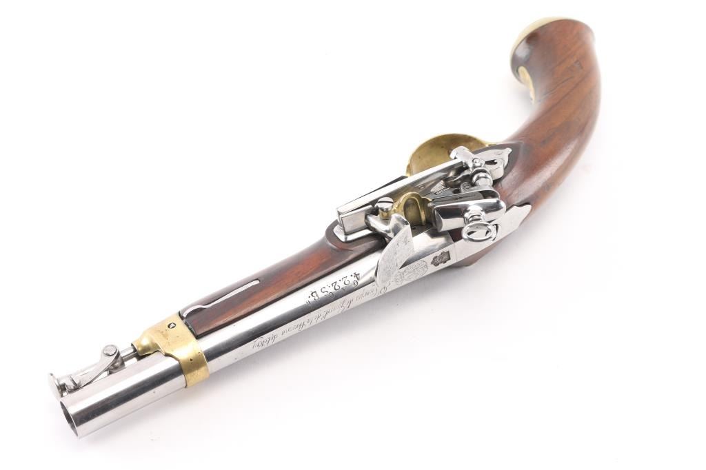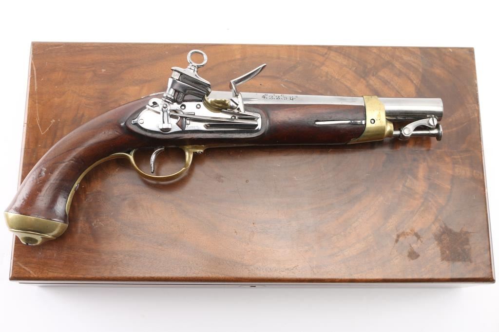 Cal. Signed Zuloaga and engraved on barrel with Spanish Royal Coat of Arms also "R. Cuerpo de Guard, de la Persona del Rey" which translates to Kings Royal Body Guard. Also maker stamped with issue number stamped on side of barrel "OAO/4.2.2.S.B.R." stock cartouched behind tang at top of wrist with Z+ Crown R. Museum quality cleaned to bright metal in European tradition with crisp near fine wood and sharp metal with strong edges. Approximately 69 cal and 14 1/2" overall. Zuluoaga was the greatest of 19th century master gunsmiths receiving international recognition at the Great London Exhibition in 1851. He re-introduced the art of gold damascene metal decoration and directed the Royal Armoury La Moncloa. The pistol is finely cased in select walnut with french-lined red velvet show embossed name and info in lid along with engraved and gold plated brass medallions in bottom of case replicated signature on barrel and Royal Coat of Arms. The casing was expertly made by Jean Calvet of So. California in mid-1970's to early 1980's. Antique firearm.