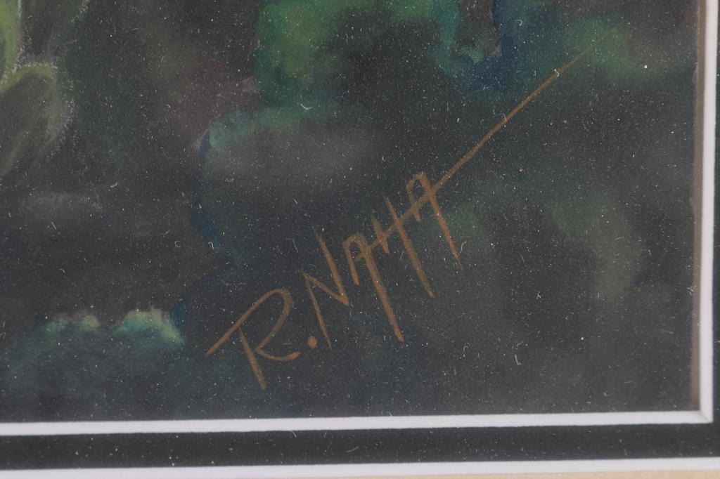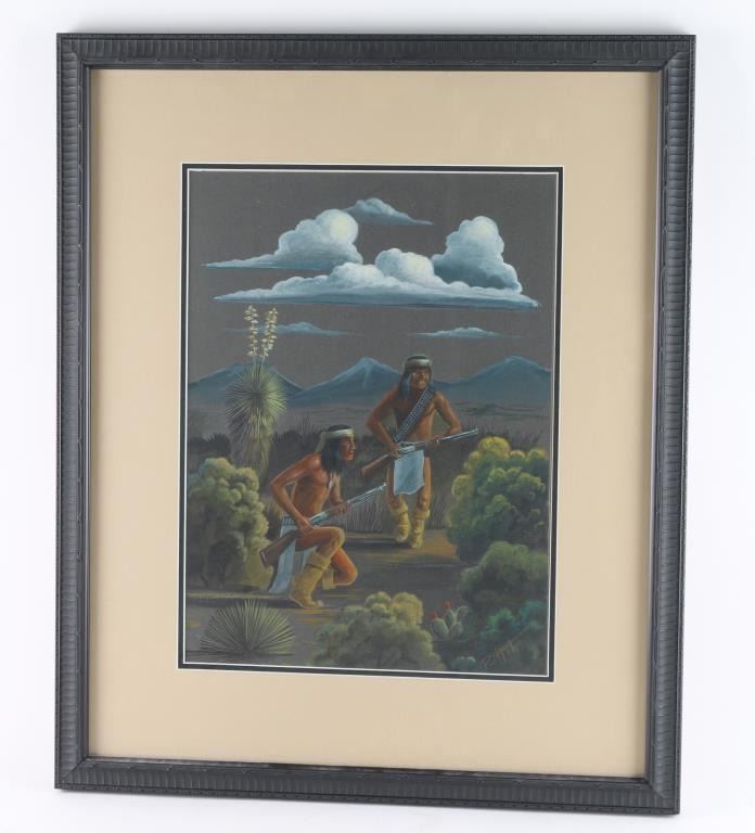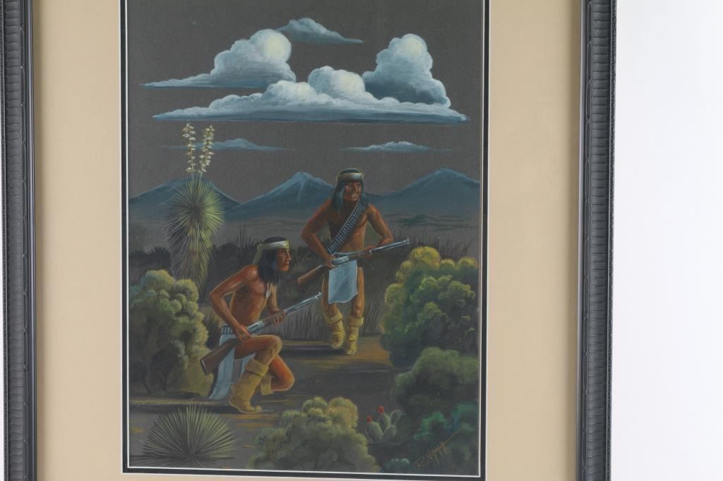 by Raymond Naha (1933 - 1974) was active/lived in Arizona. Depicts two Indians with Winchesters. Hand-signed lower right. 15 x 11/2, double matted and framed.