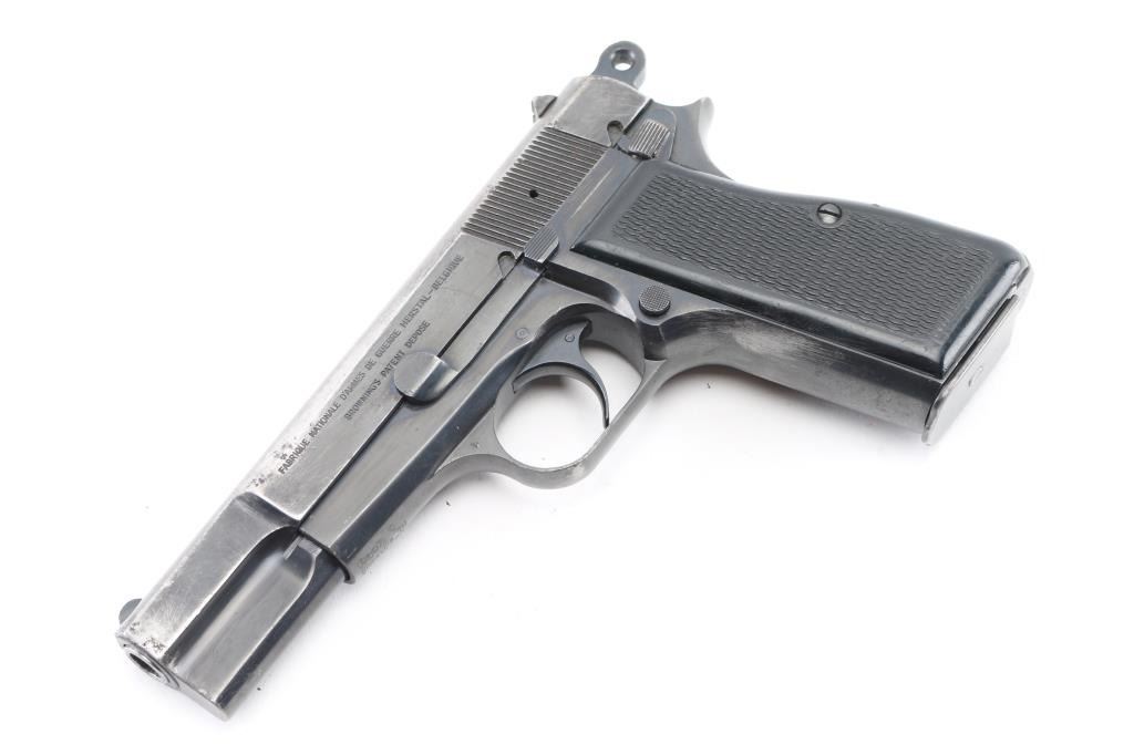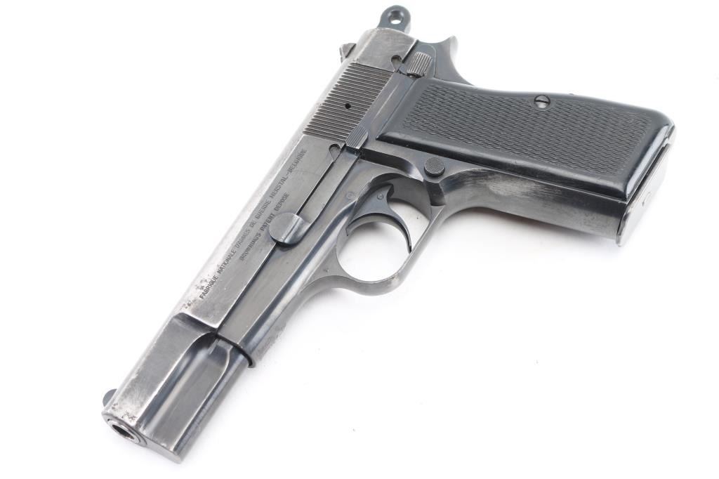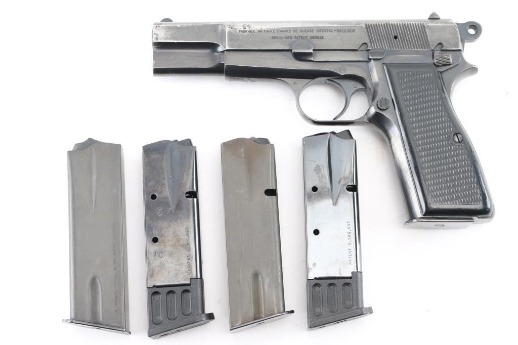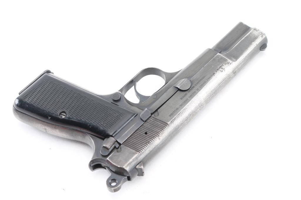 'HP-35' Desirable single action semi-automatic pistol chambered in 9x19mm, manufactured in Belgium by Fabrique Nationale circa 1968. Imported by Mach 1, Knox TN, with importer markings on dust cover. Features a blued finish, 4.75" barrel, round blade front sight, dovetailed rear sight with ‘u’ notch, smooth trigger, serrated rowel hammer spur, manual safety/slide catch on the left side of the frame, magazine safety, push button magazine release, 13 round magazine, steel frame and two-piece checkered black plastic grips. Bore is fair to good condition, dark grooves, strong rifling, light pitting throughout. Pistol retains approximately 40% of its original finish showing much thinning & bare metal, pin prick pitting, some small dings and scratches throughout. Grips are very good. Serial number matches on frame, slide & barrel. Includes 5 magazines, including two 10 rd and three 13 round. Condition is NRA Good+ *** C&R Firearm ***