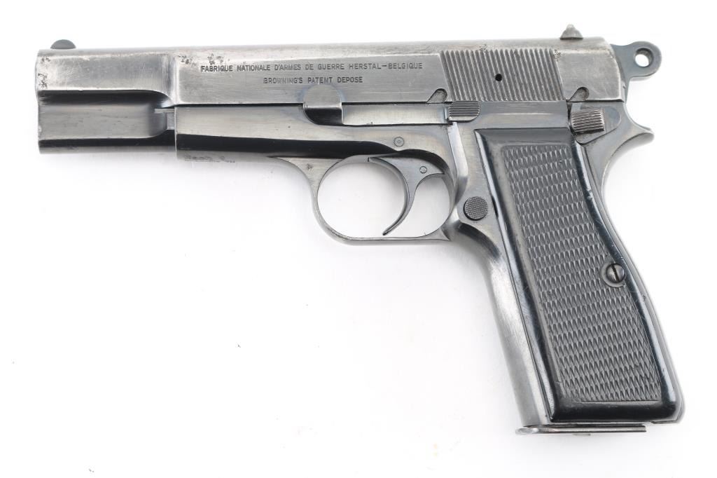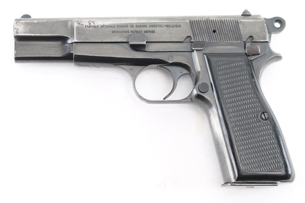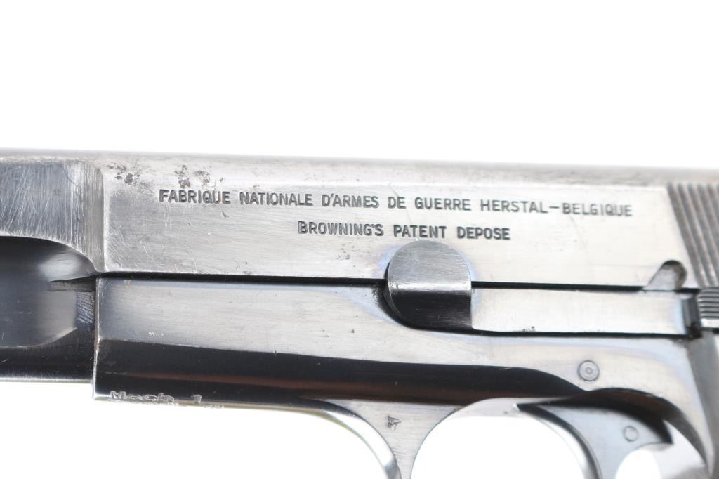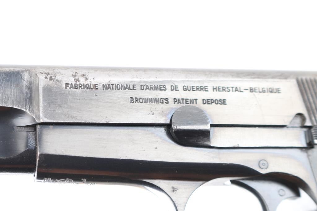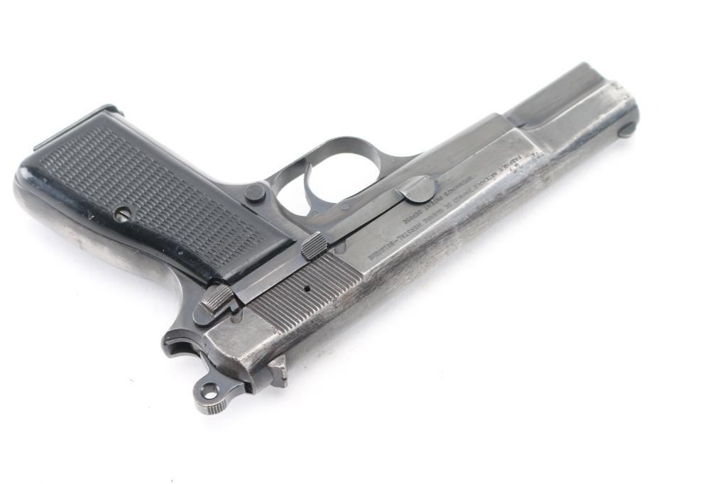 'HP-35' Desirable single action semi-automatic pistol chambered in 9x19mm, manufactured in Belgium by Fabrique Nationale circa 1968. Imported by Mach 1, Knox TN, with importer markings on dust cover. Features a blued finish, 4.75" barrel, round blade front sight, dovetailed rear sight with ‘u’ notch, smooth trigger, serrated rowel hammer spur, manual safety/slide catch on the left side of the frame, magazine safety, push button magazine release, 13 round magazine, steel frame and two-piece checkered black plastic grips. Bore is fair to good condition, dark grooves, strong rifling, light pitting throughout. Pistol retains approximately 40% of its original finish showing much thinning & bare metal, pin prick pitting, some small dings and scratches throughout. Grips are very good. Serial number matches on frame, slide & barrel. Includes 5 magazines, including two 10 rd and three 13 round. Condition is NRA Good+ *** C&R Firearm ***