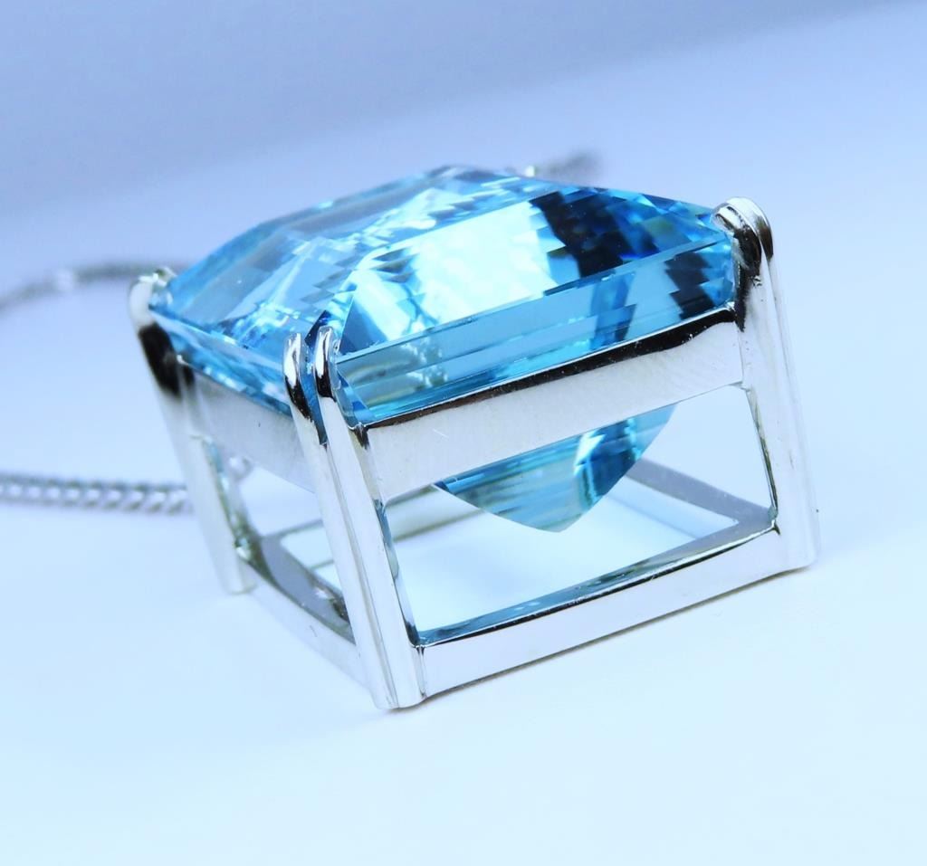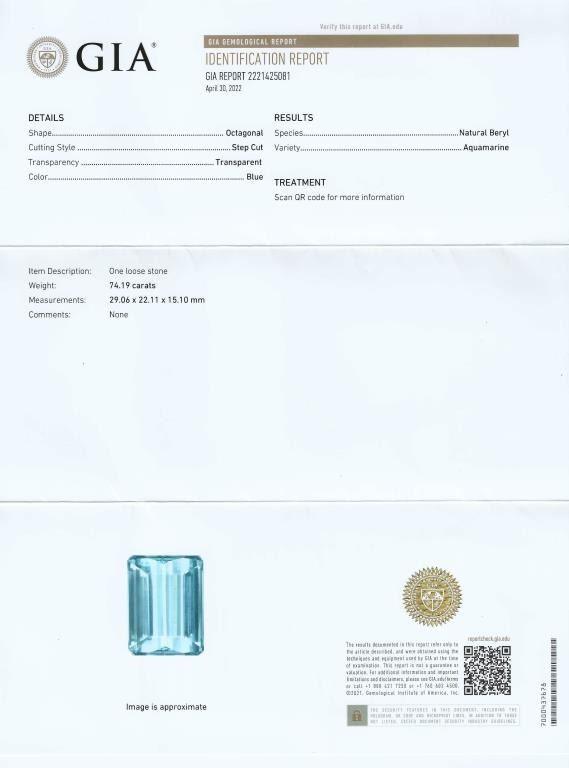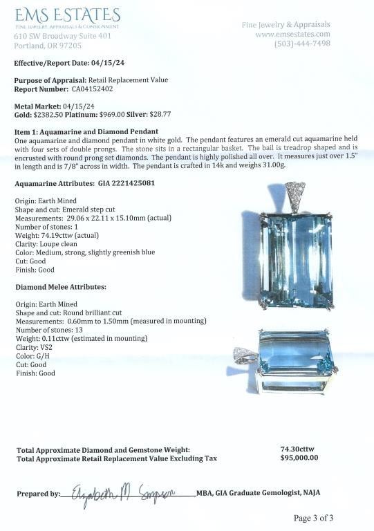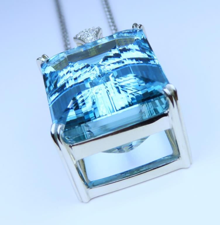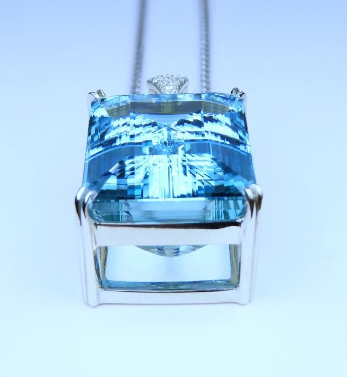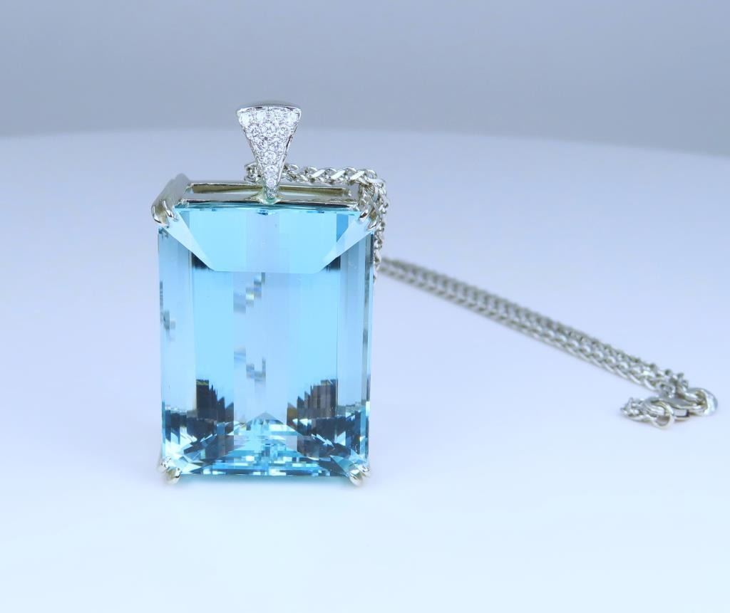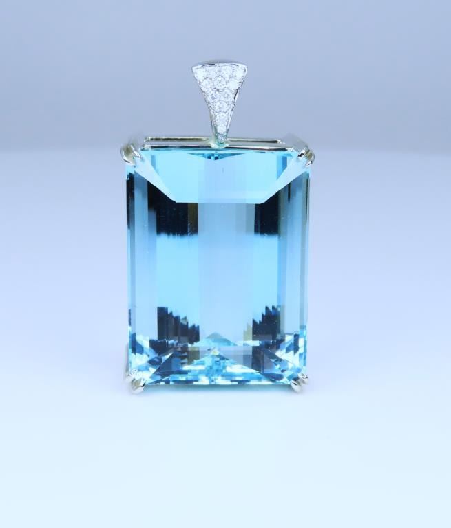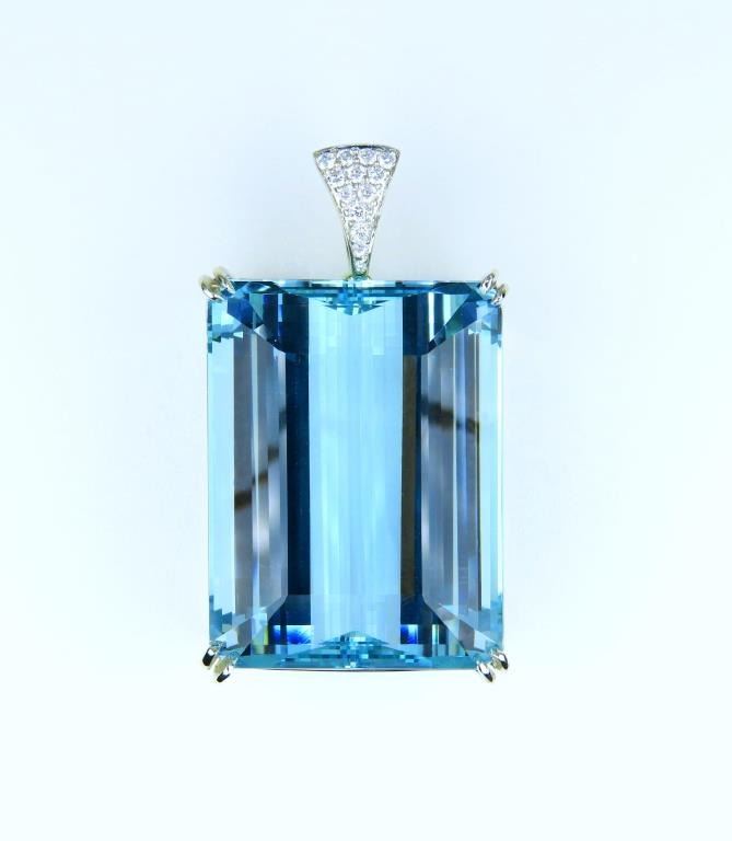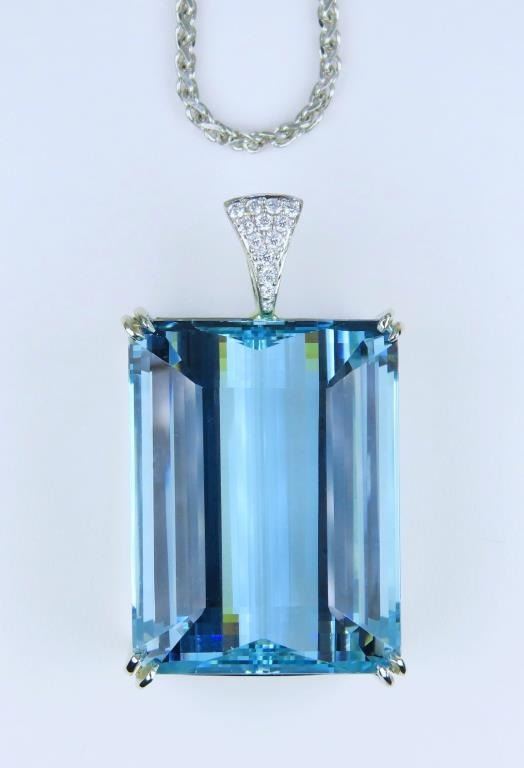 carat Aquamarine and Diamond Pendant! G.I.A. Certified Blue Aquamarine Octagonal step cut featured in a C.A. Gems custom 14 karat white gold hand crafted setting with pave set Diamonds with G-H colors and VS2 clarity. Full Retail Appraisal - $95,000.00