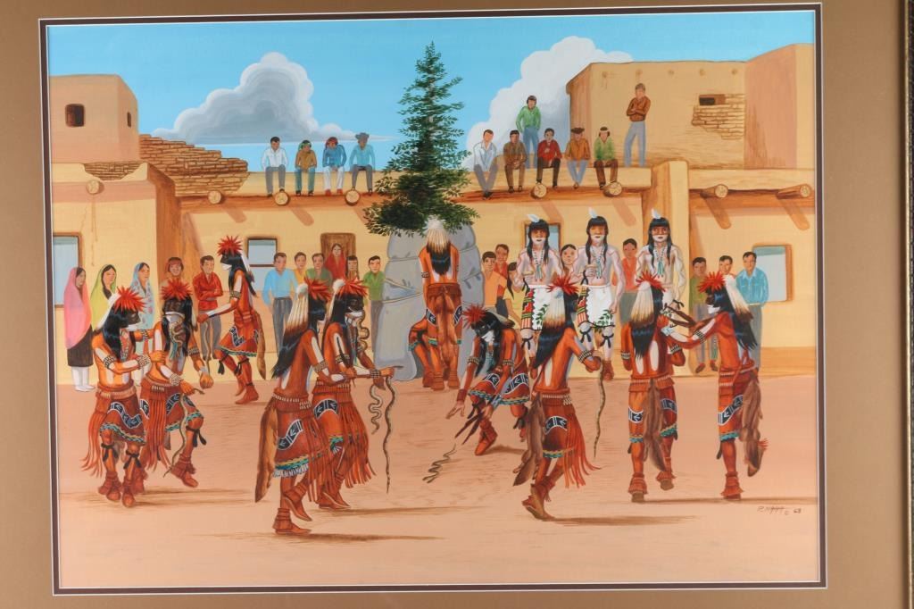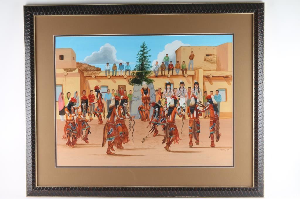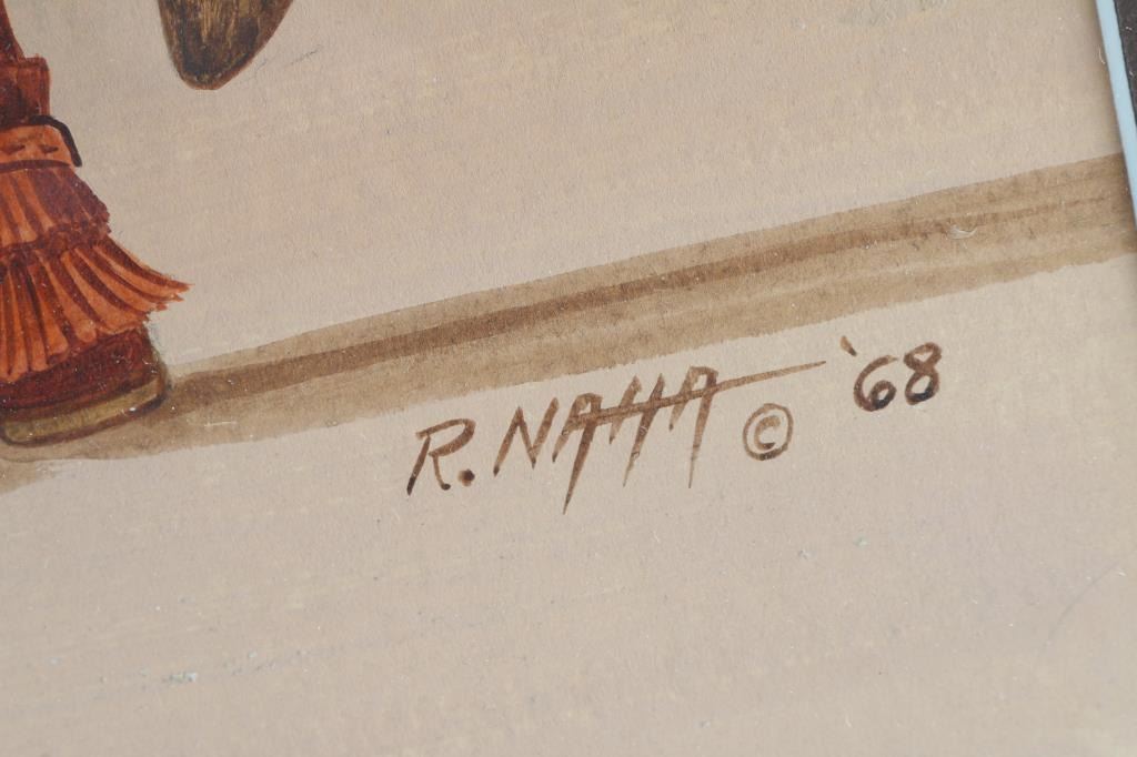 by Raymond Naha, (1933 - 1974) was active/lived in Arizona. Naha is known for Ceremonial figure, Indian motif. Depicts Indian Pow-Wow, hand-signed on lower right hand corner, dated 1983. Image size is 30x21. Double matted and framed.