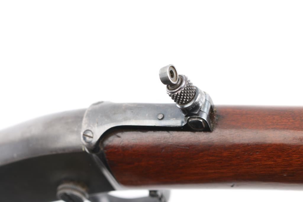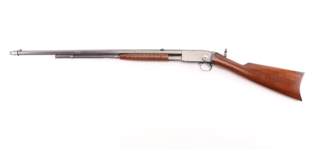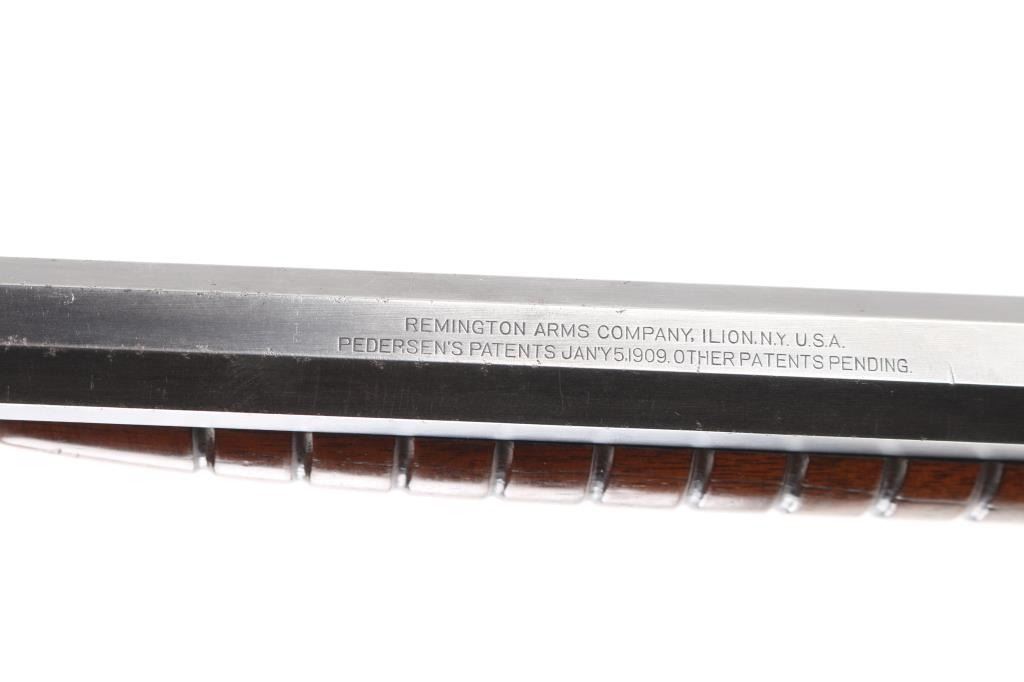 Vintage take down pump action rimfire target rifle manufactured circa 1910, second year of production. Features 24" octagon barrel, 3/4 length tube magazine, factory installed Lyman dovetailed blade, ivory bead front v-notch flip rear sight, and factory installed Lyman No.1 folding peep sight for target shooting. Installed on the muzzle is a "coupling" (adapter) for a Maxim "Silencer" with interrupted threads. This same piece in shown in early Maxim catalogs. Pushbutton safety, grooved walnut "corn cob" ten grove pump handle, straight wristed smooth walnut butt stock, steel crescent butt plate. Bore is good overall, fairly bright with some frosting and loss to sharpness of rifling. Retains about 70% of original blue finish, with edge losses, handling/friction wear, scratches. Wood is very good condition with very minor scratches/dings. Action is sound. No model number, markings are crisp, two line Remington address, and Pedersen's 1909 patent. "RW" over the serial number. (Remington Works). NRA Condition-Very Good. C&R Firearm.