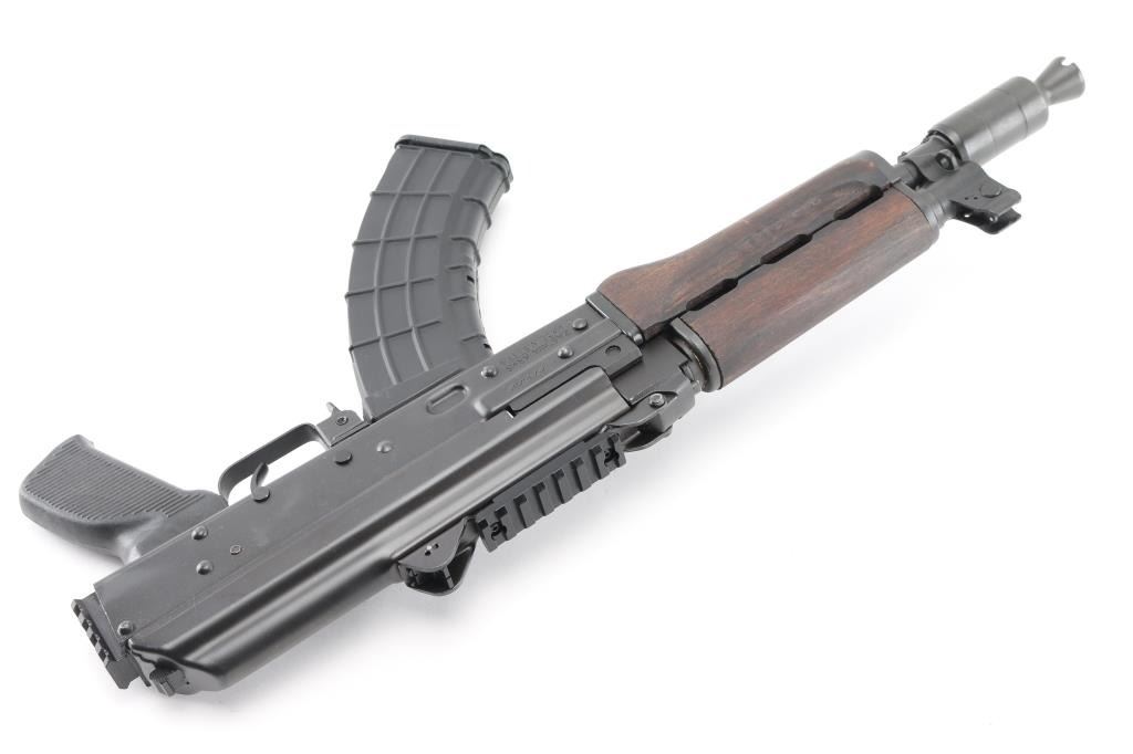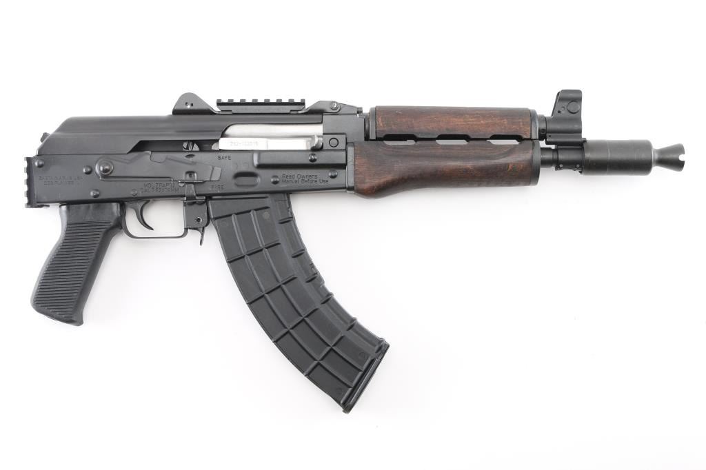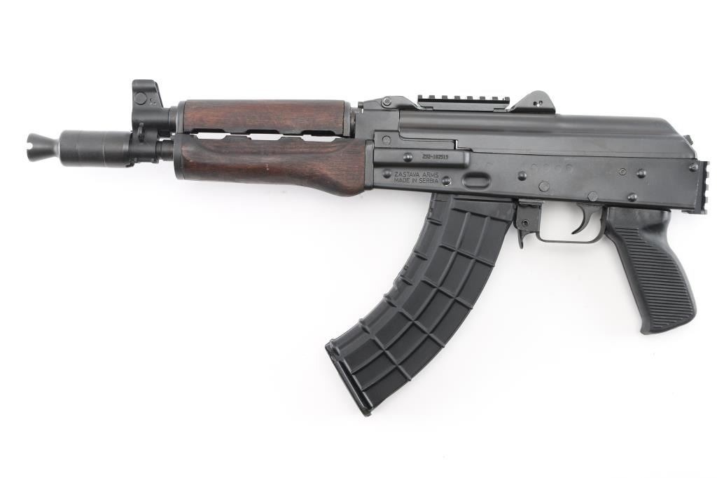 Serbian made semiautomatic pistol based on the AK47/AKM rifle, made at the factory that made rifles for the Yugoslavian military. Imported by Zastava Arms USA. Features blued finish, 10" barrel, adjustable post front sight with protective "ears", protected rear sight with flip selectable notches, Picatinny rail section on top cover, manual safety, ribbed black polymer pistol grip, dark color hardwood forend, Top cover is hinged, receiver has Picatinny rail at rear for mounting accessories. Condition is like new with handling marks. Bore is pristine. Includes manual, black polymer "waffle sided" 30 rd magazine, two blued steel 30 rd magazines. Condition is NRA Excellent *** Modern Firearm ***
