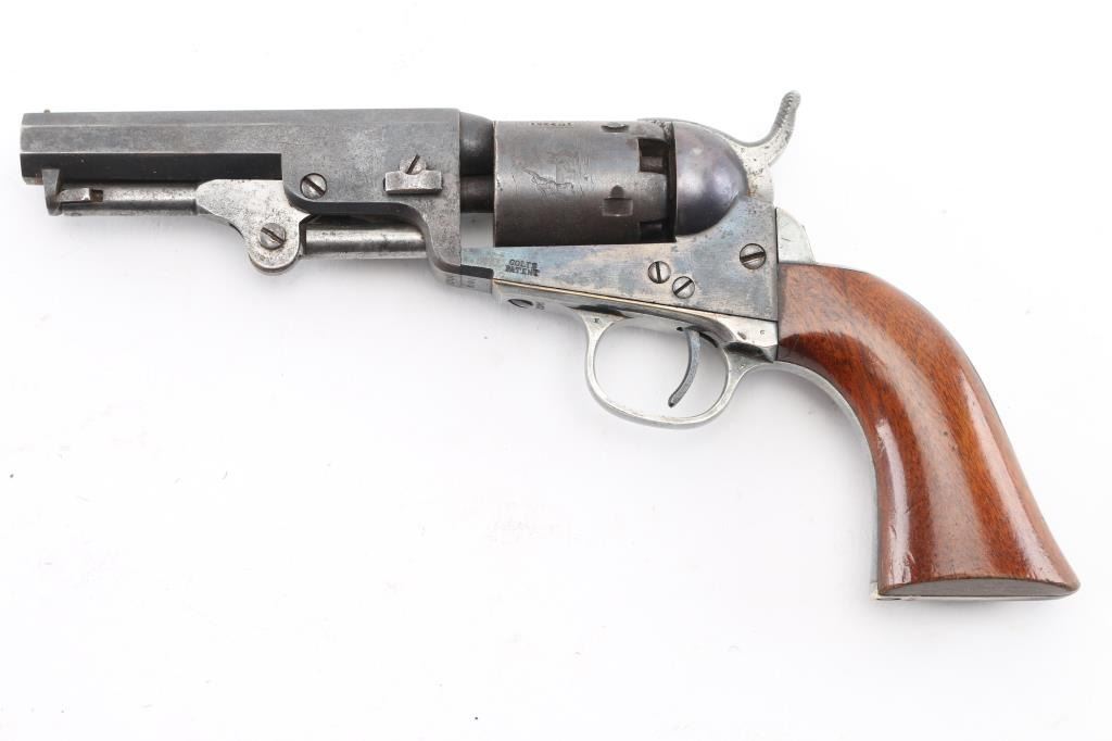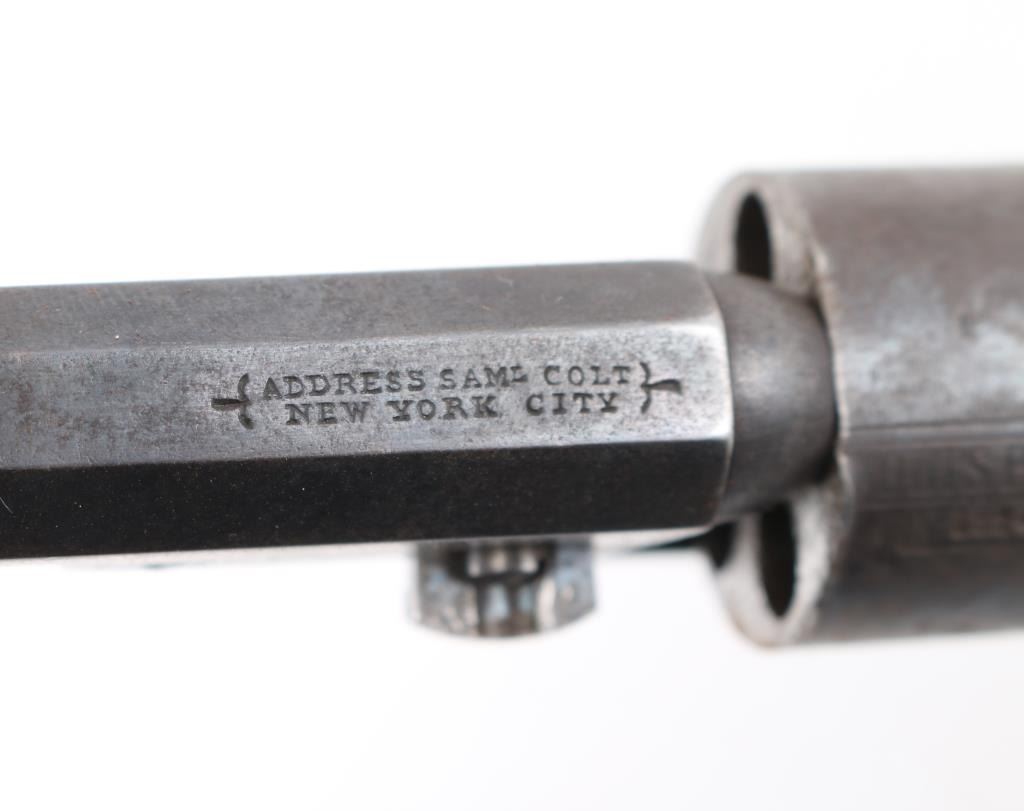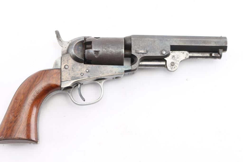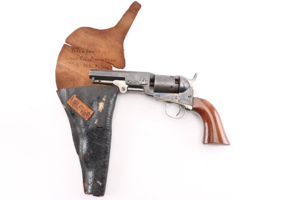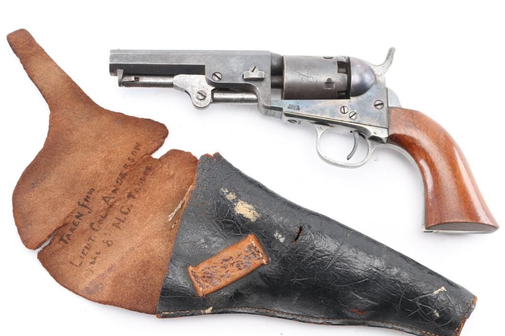 Colt 'Pocket Pistol', single action percussion cap 'n' ball revolver manufactured circa 1856. Features 4" octagon barrel, loading lever, 5 shot unfluted cylinder with roll stamped stage coach scene, brass bead front sight, rear sight notch on hammer nose, one piece walnut grip, silver toned back strap & round triggerguard. All observed numbers match, including the cylinder, wedge, and loading lever. Markings are crisp, sharp, with good cylinder scene. Bore appears very good, strong rifling. Barrel & frame have some blue with the cylinder & loading lever turned a gray patina. Grips are very good, has been varnished. Action is crisp, with tight lock-up. Comes in a Civil War period black leather flap holster, missing the plug, and has tear in flap, some separation on one seam. The inside of the flap is "Taken from Lieut. Col. Anderson of the 8th N.C. (Appears to be ) Troops. Period done, ink has turned brown with age. Worthy of further research. NRA Condition-Very Good. Antique firearm.